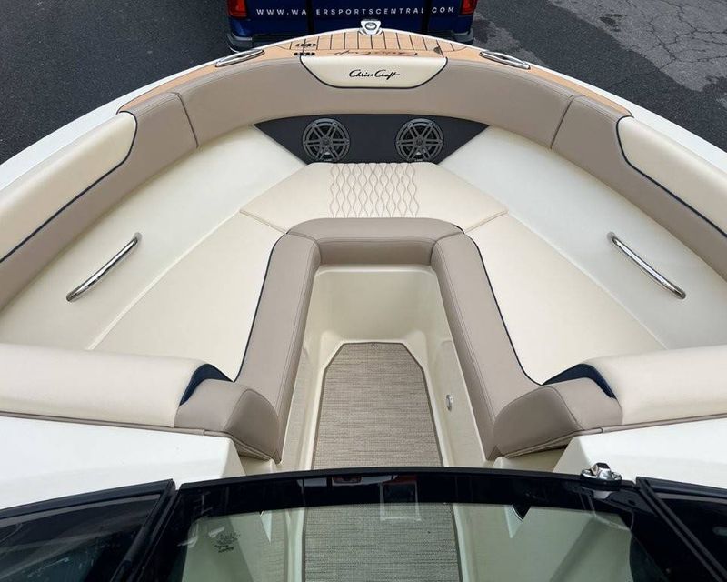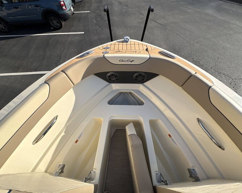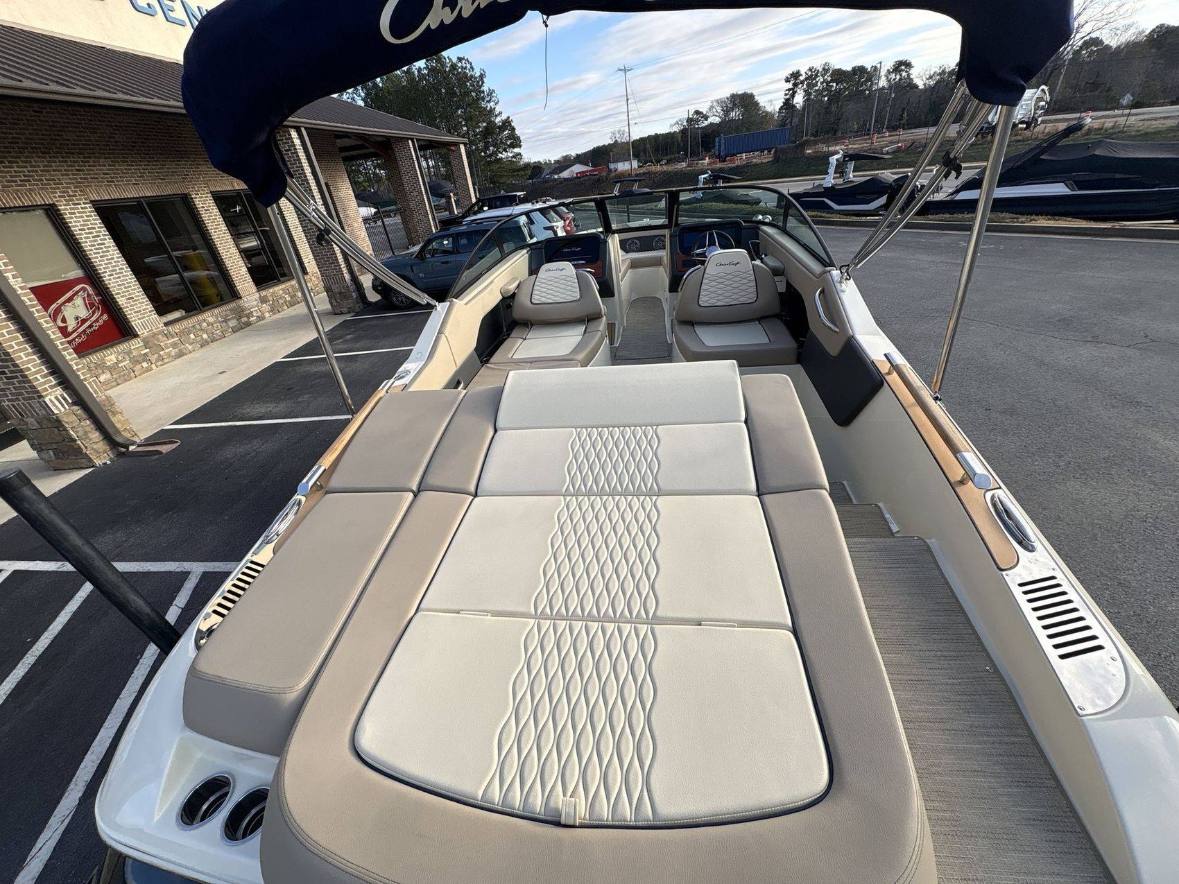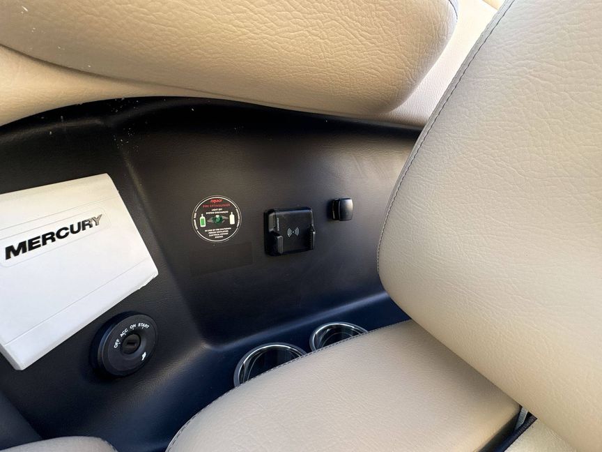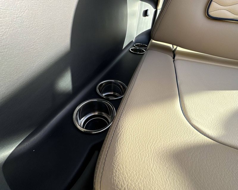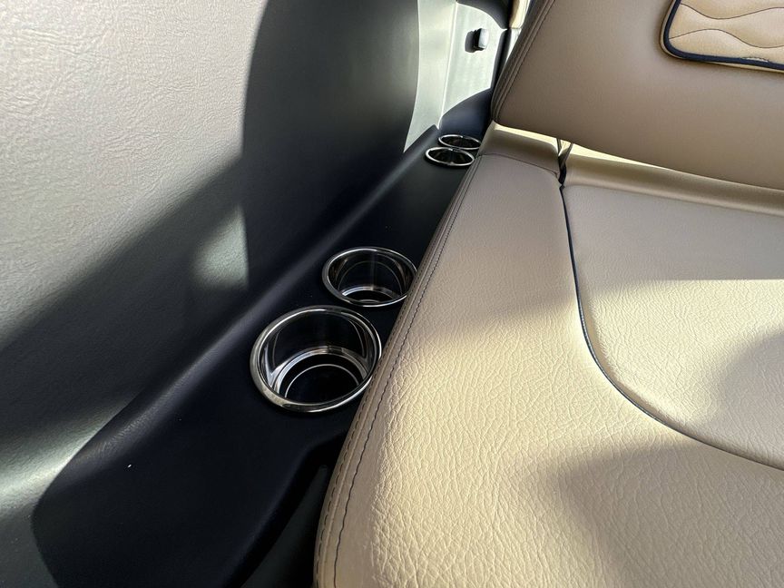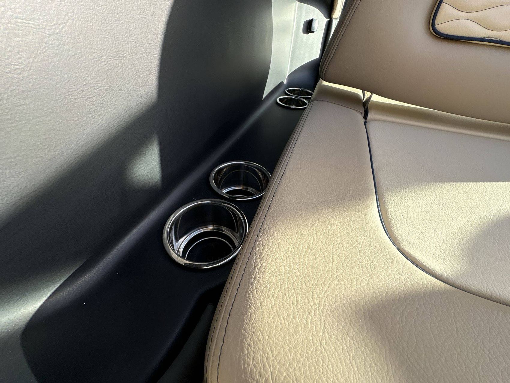 The interior has been laid out with Chateau Cockpit Vinyl Base and enhanced with Almond Cockpit Vinyl Insert. Additionally, the boat features Vinyl Accent in Navy color and matching Navy Color Contrast Stitching.