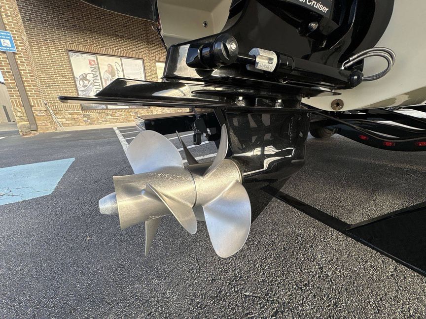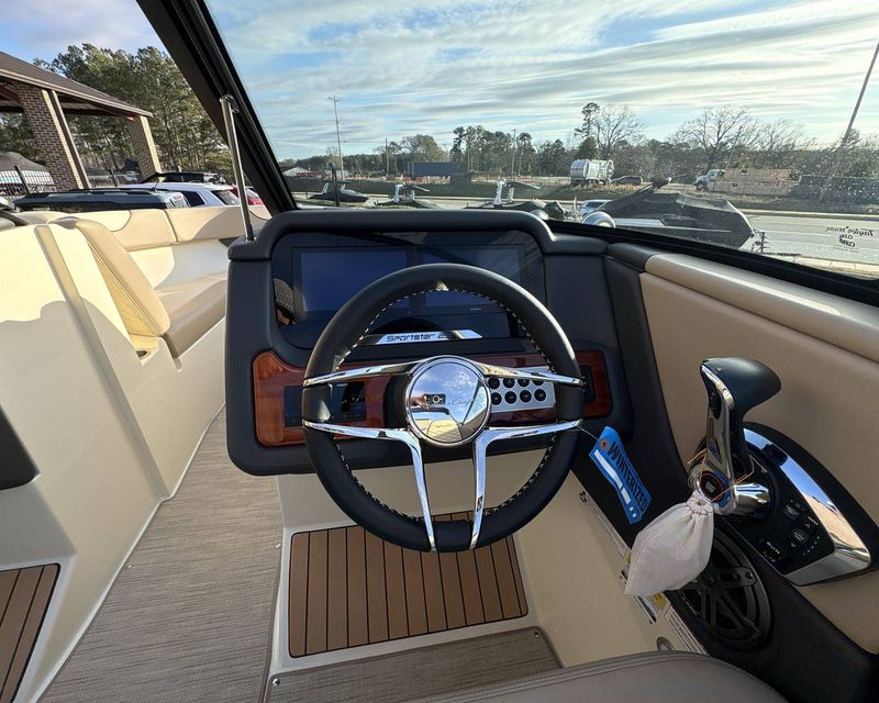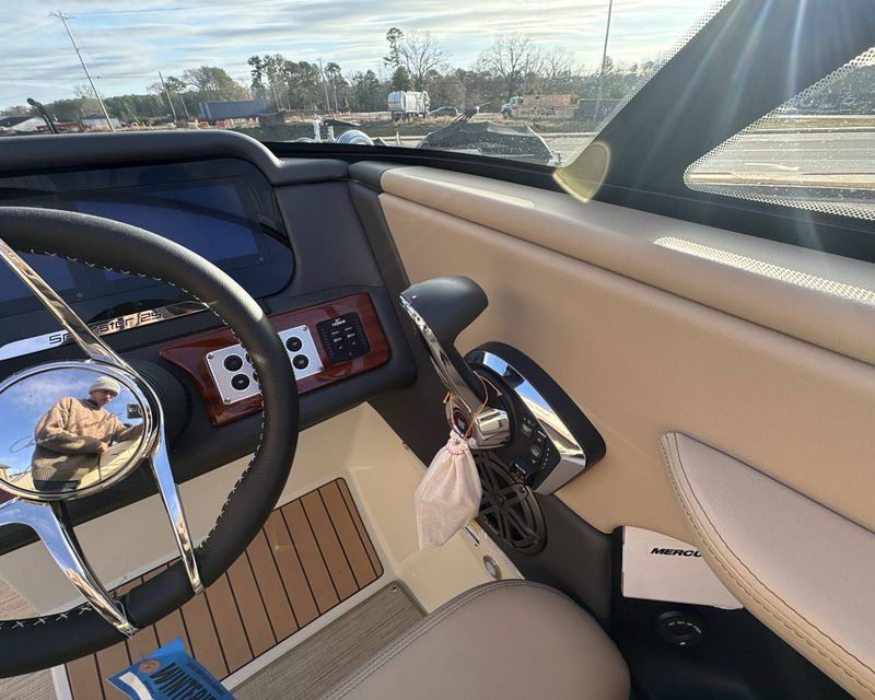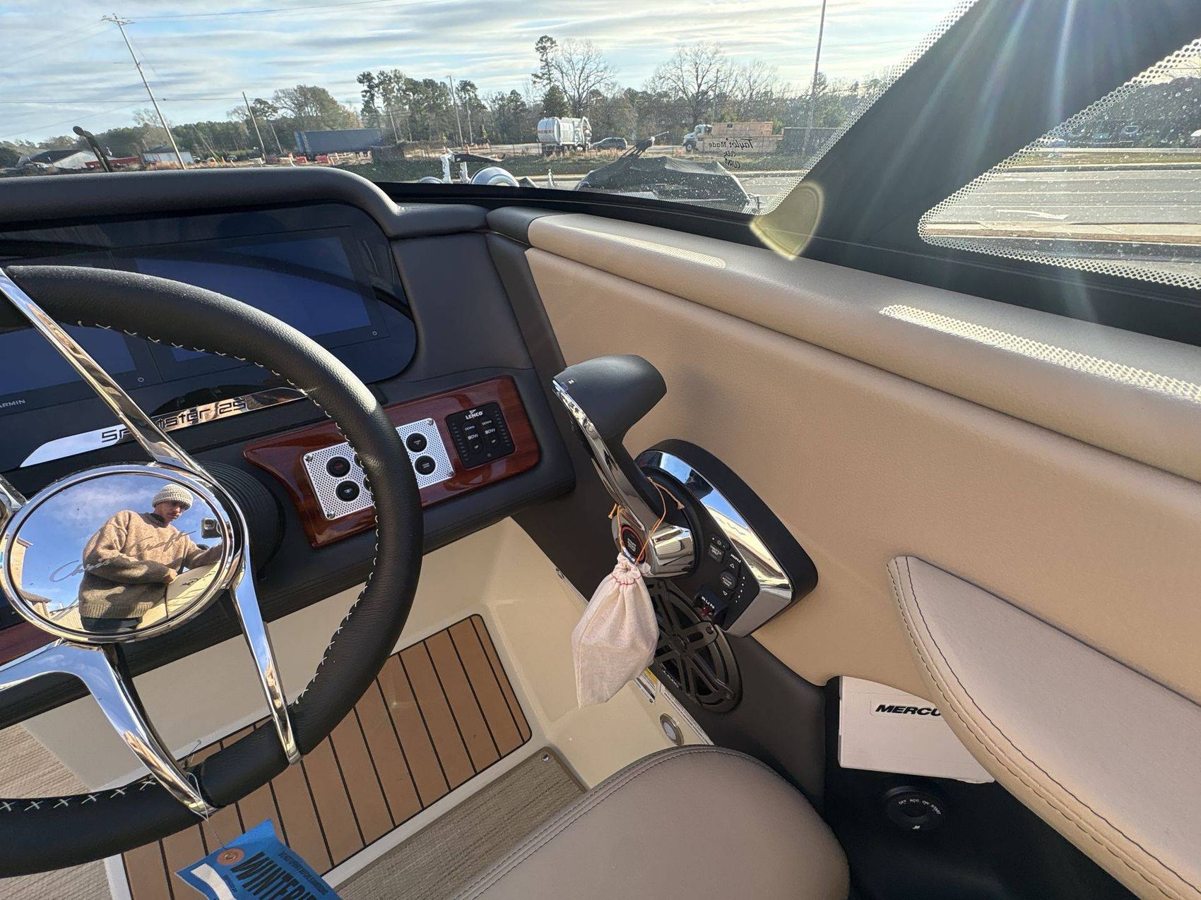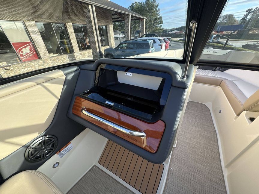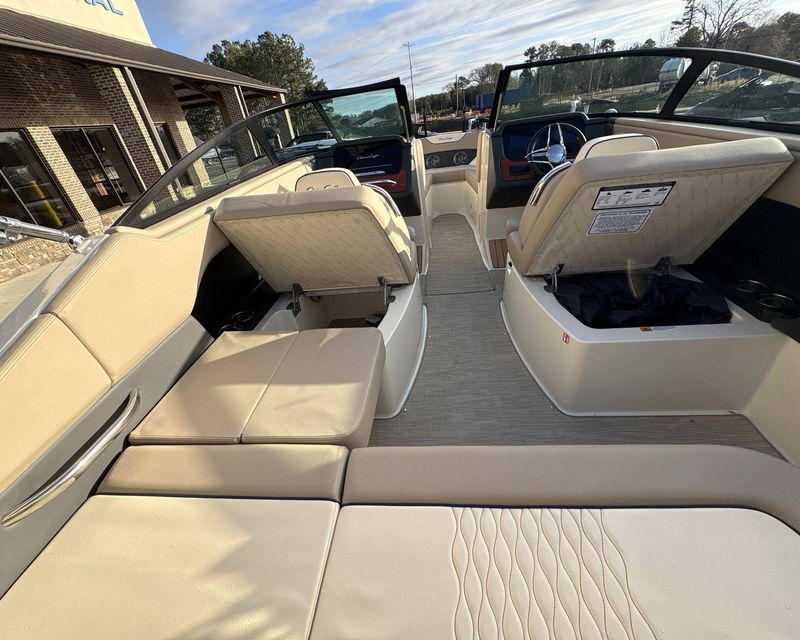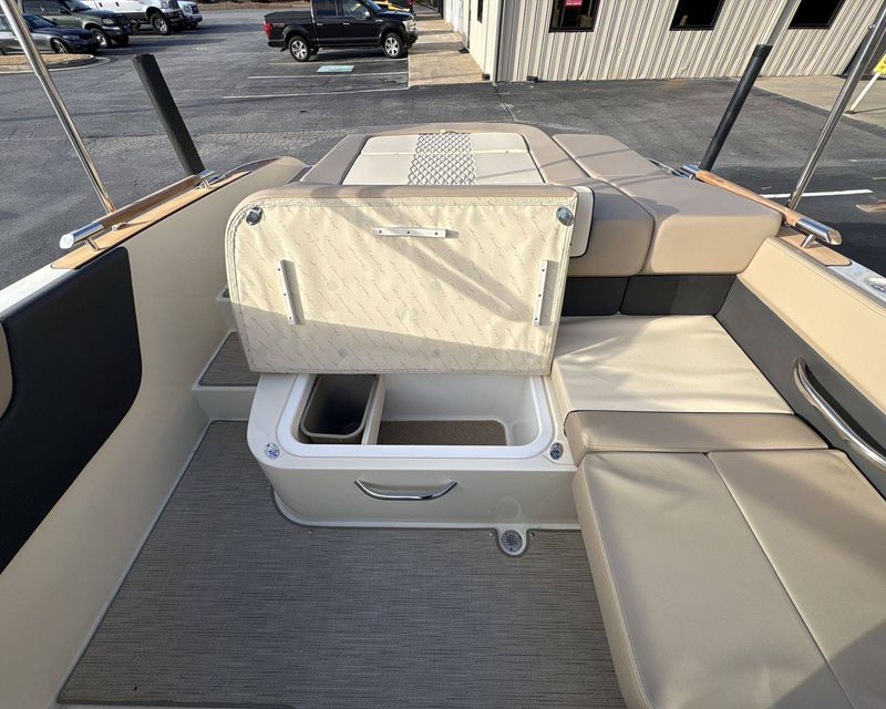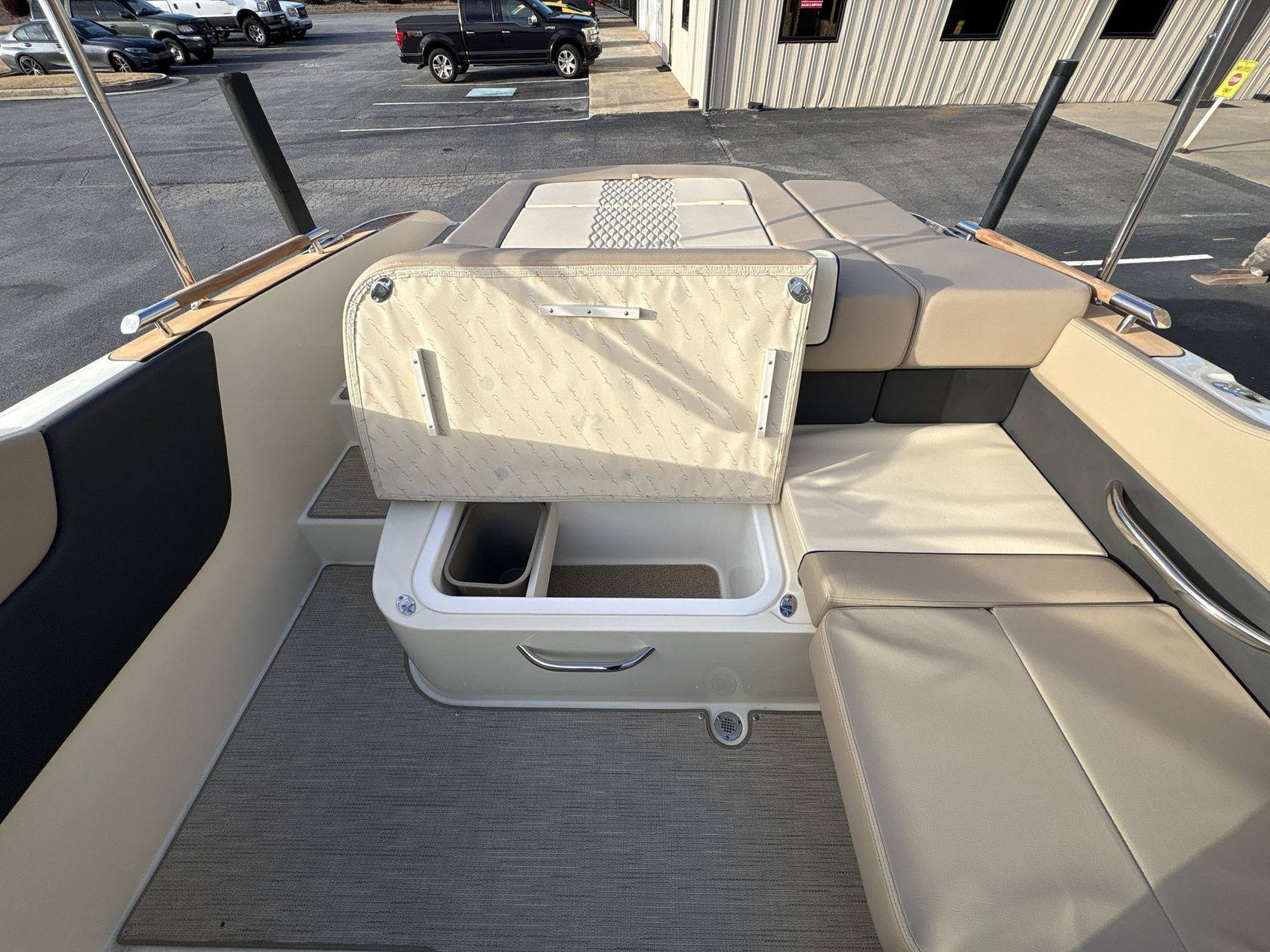The interior has been laid out with Chateau Cockpit Vinyl Base and enhanced with Almond Cockpit Vinyl Insert. Additionally, the boat features Vinyl Accent in Navy color and matching Navy Color Contrast Stitching.