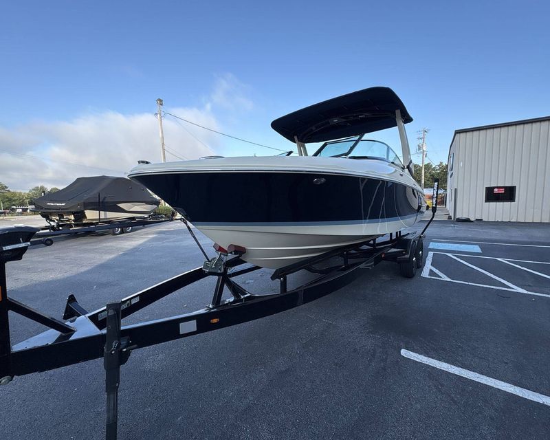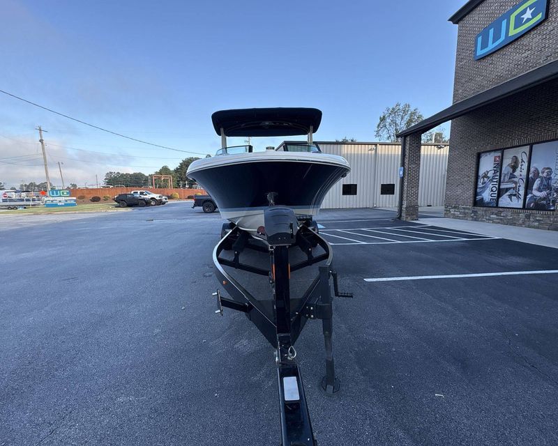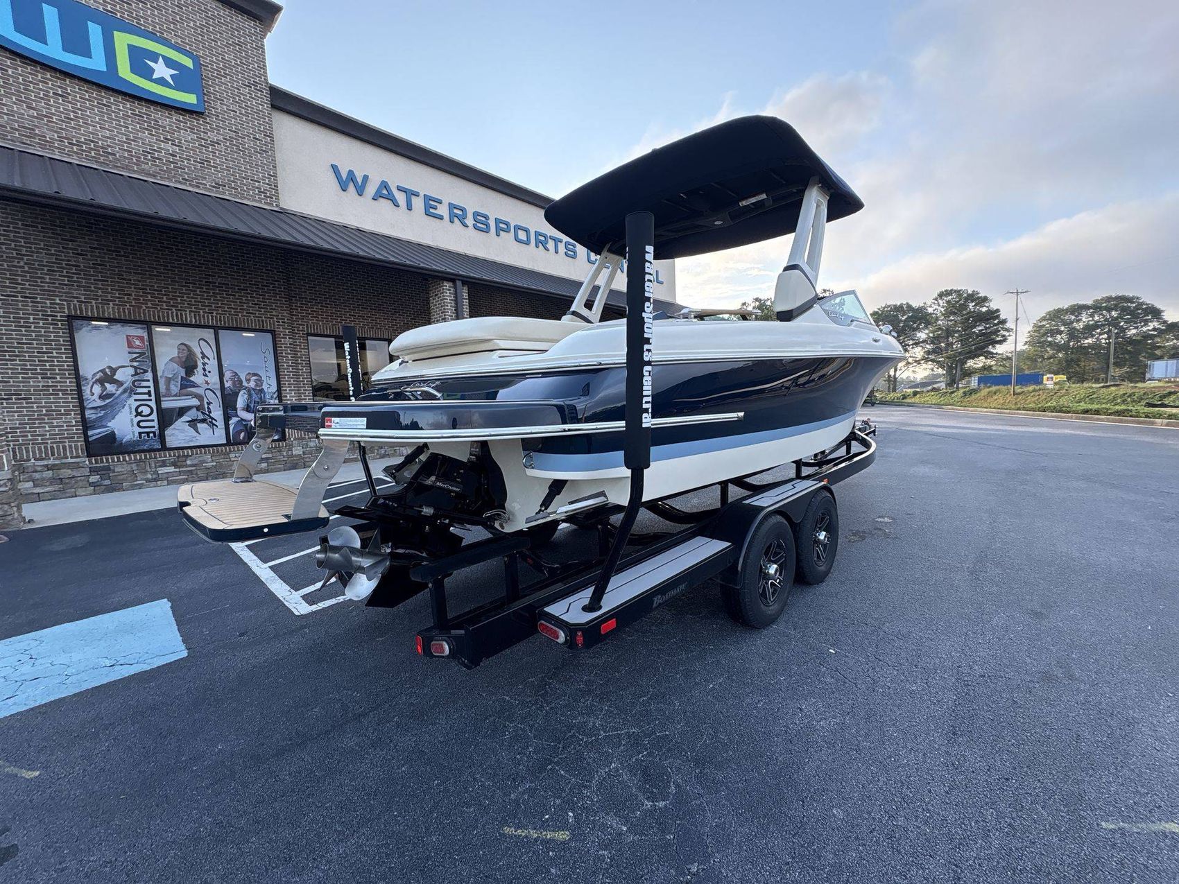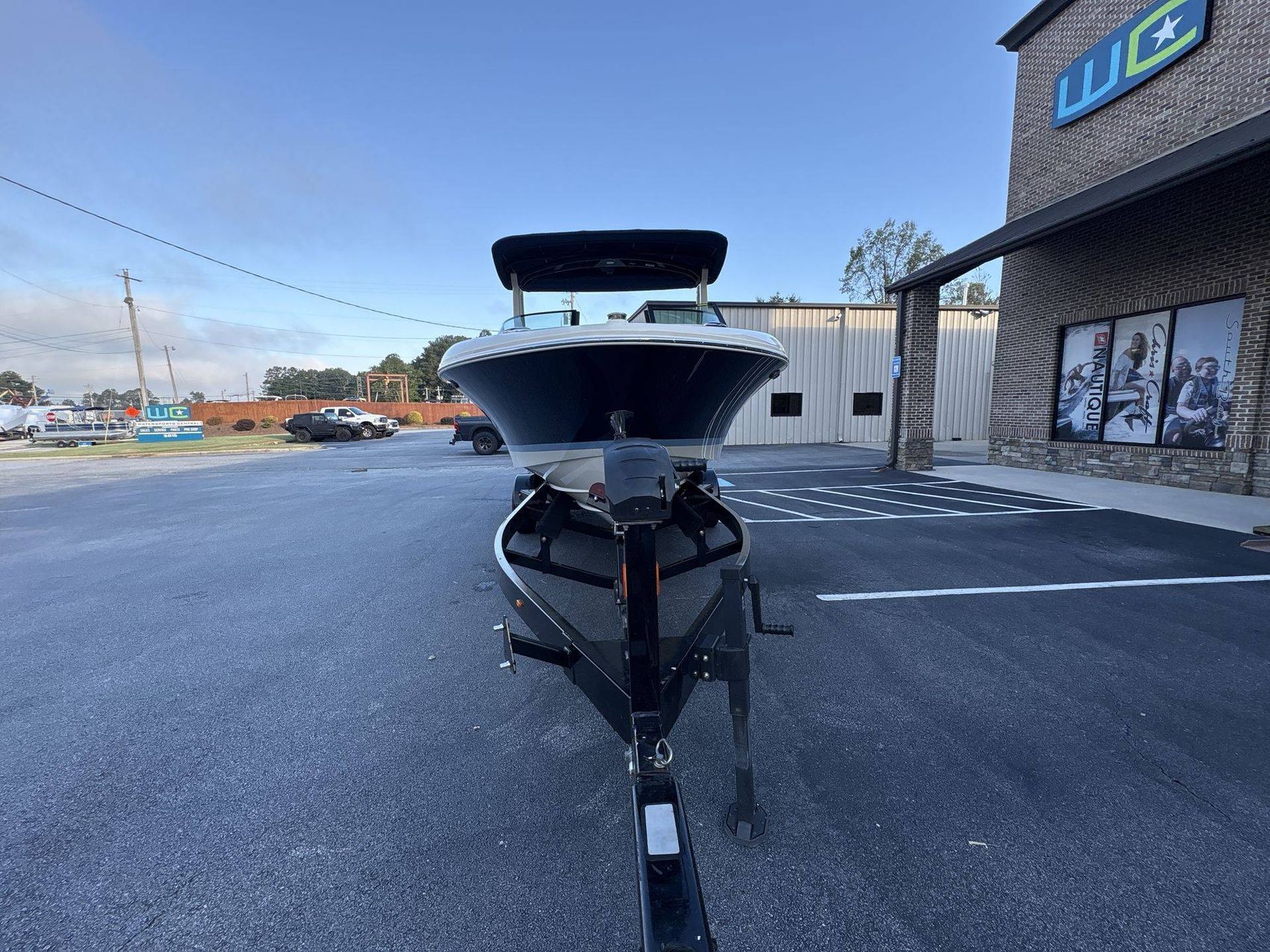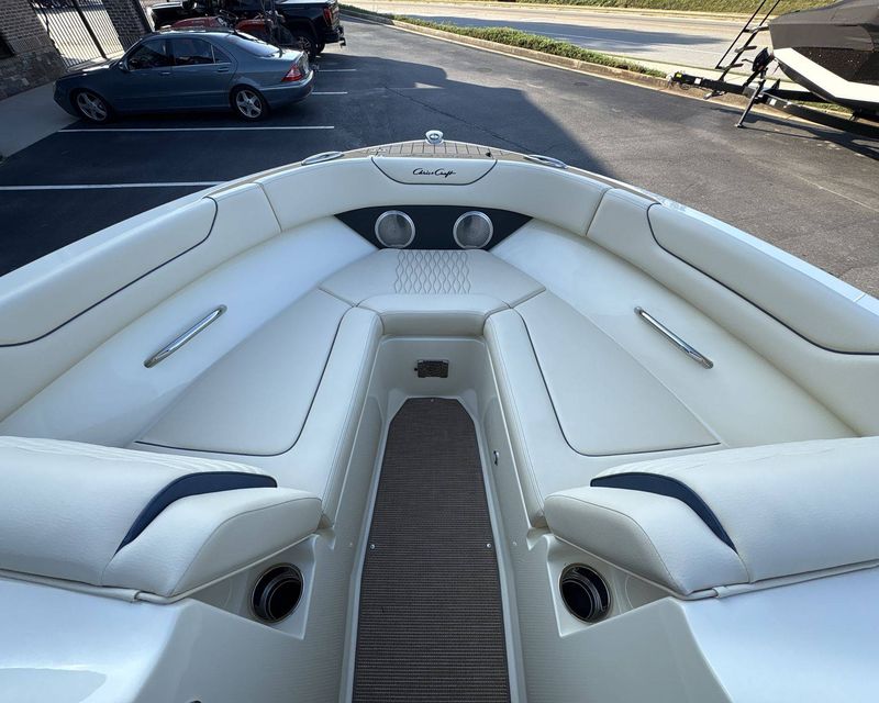 Additional Features: The boat comes equipped with an automatic fire extinguisher, LED Bow Docking Lights, a comfortable cockpit filler cushion, and a protective cover in Navy.