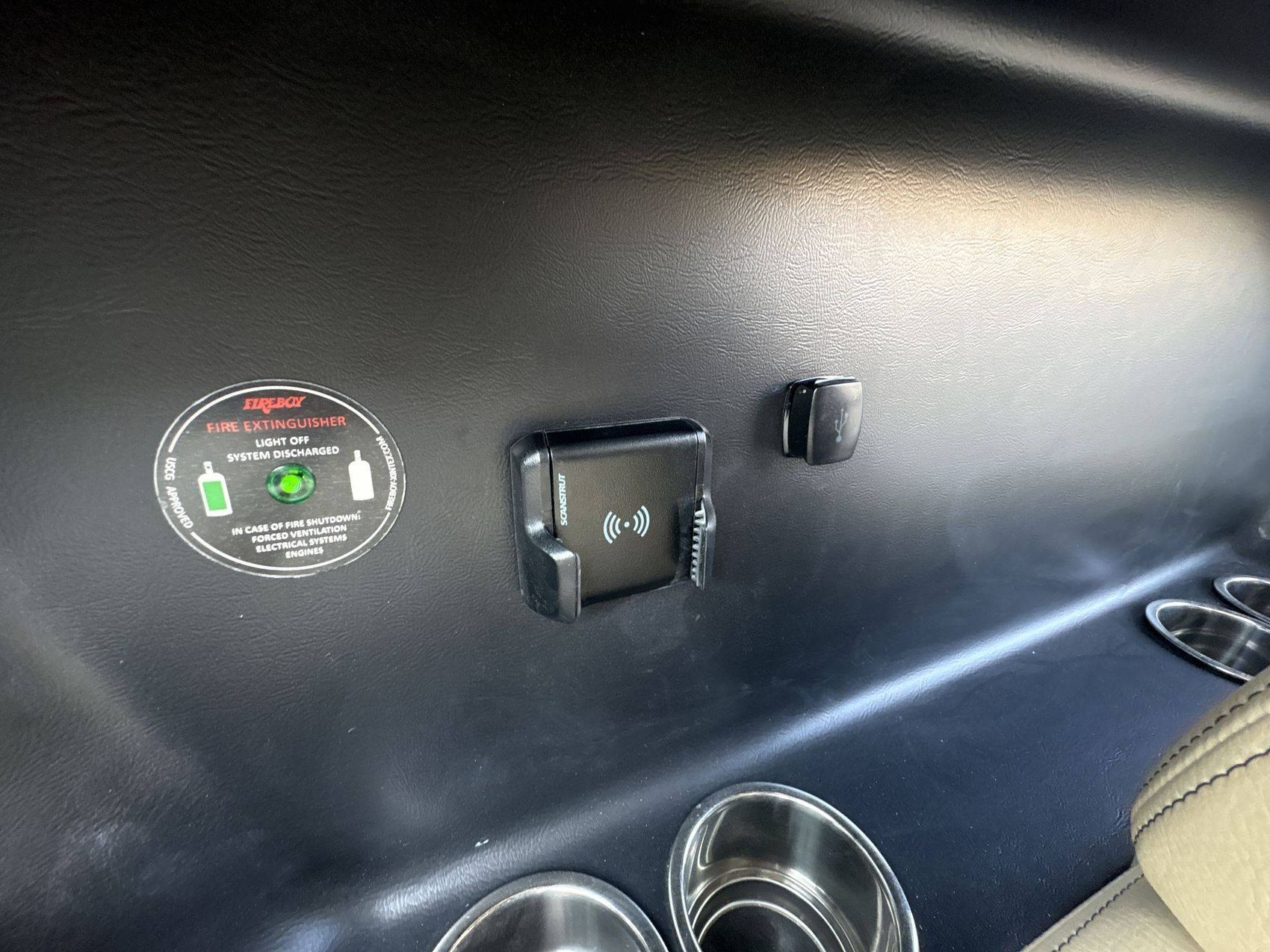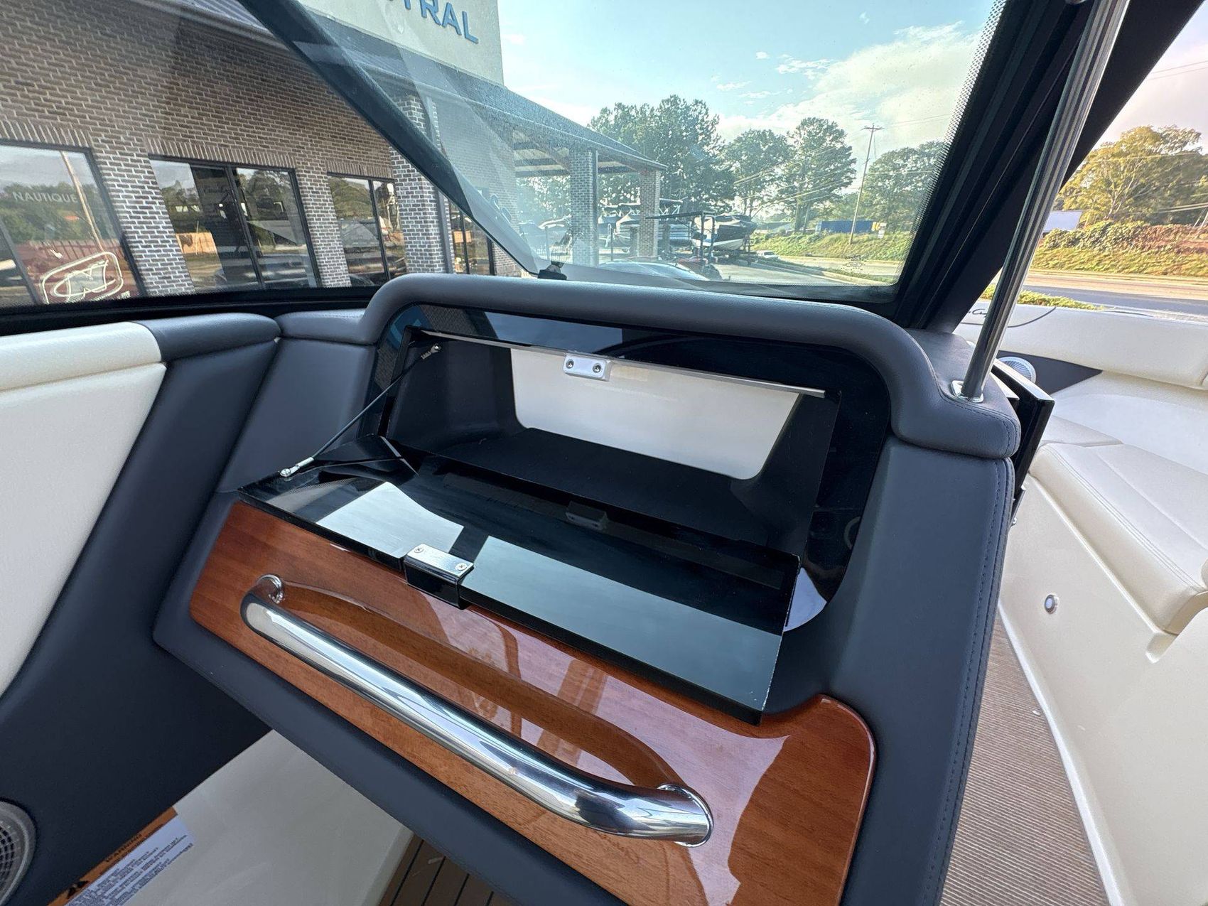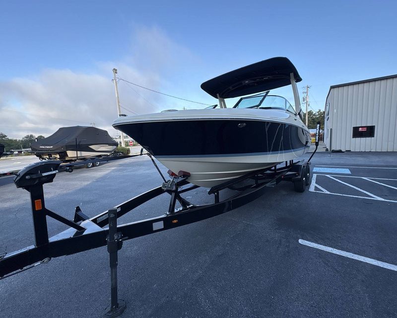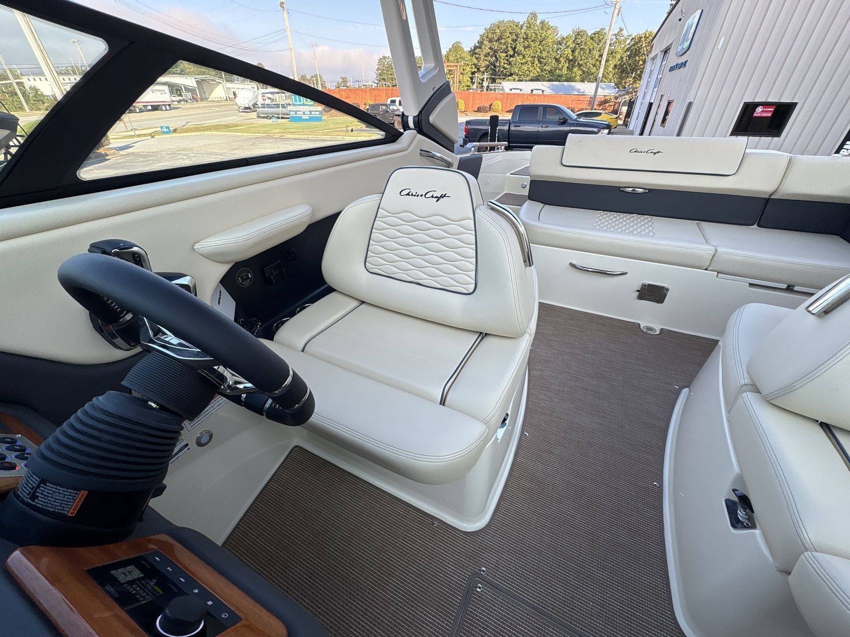 Additional Features: The boat comes equipped with an automatic fire extinguisher, LED Bow Docking Lights, a comfortable cockpit filler cushion, and a protective cover in Navy.