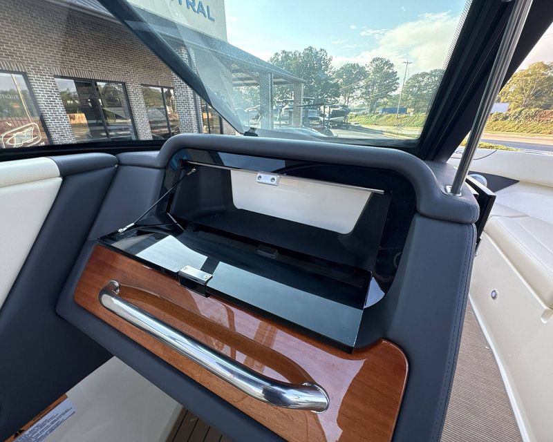For relaxation and recreation, the boat features a manual swim step on the swim platform and a Teak Cockpit Table with bow and aft mounts. For improved navigational control, Trim Tabs with Indicators are provided. Wind Door is also included for better comfort onboard.