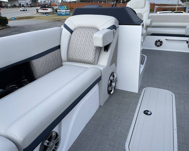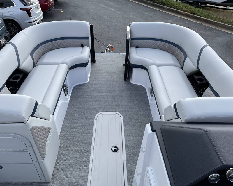 The exterior design flaunts an Admiral Metallic color with Silver Metallic Accent Panel, complemented by Fiberglass Fence Panels in white. The interior, meticulously dressed in Light Gray Interior Vinyl with Admiral Accent Vinyl and White Interior Gelcoat, provides a sophisticated yet comforting ambiance. Furthermore, the SeaGrass - Compass Gun Metal (Gray) floor adds a touch of sophistication.