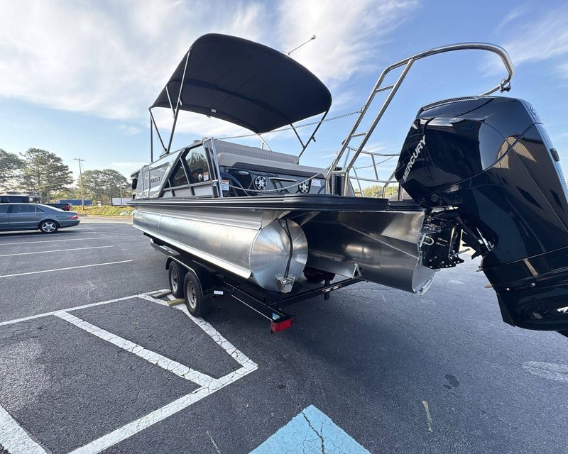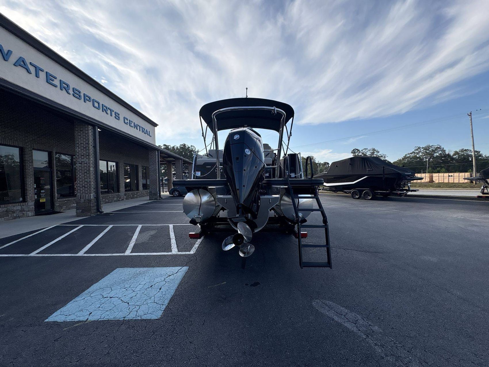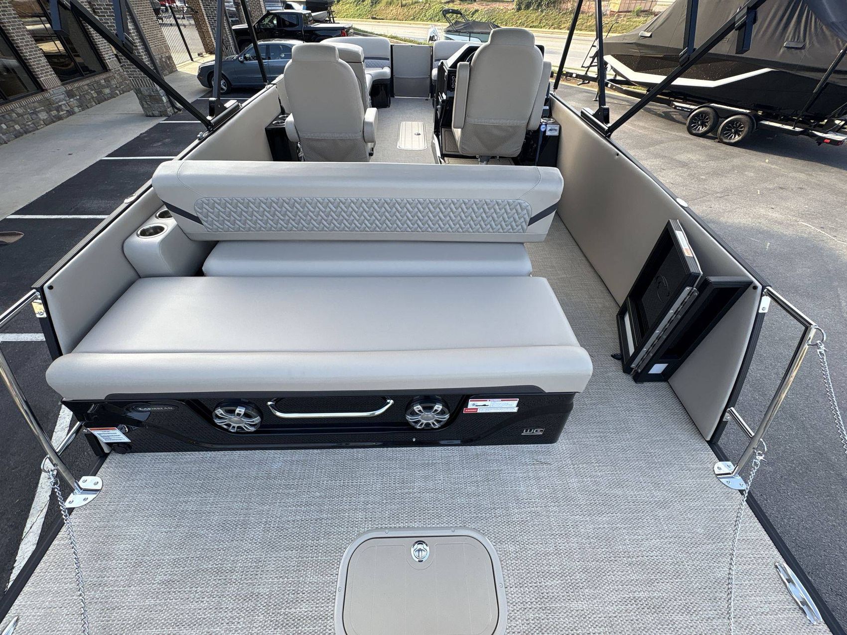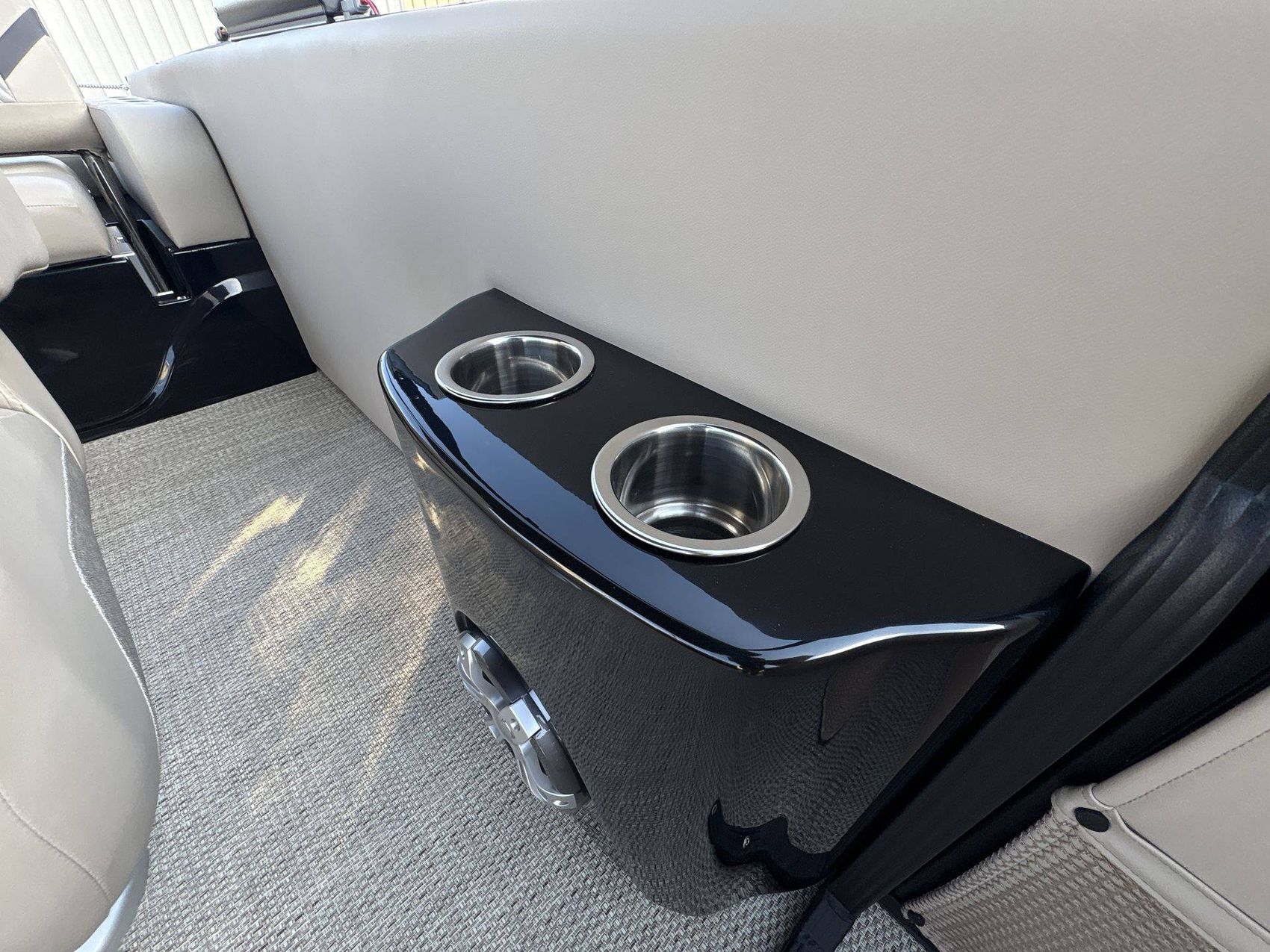 The exterior stuns with a vibrant black metallic fence panel, complemented by a white accent panel, setting this boat apart from the crowd. Attention to every minute detail, such as the powder-coated deck trim and corner caps, exudes an air of sophistication and ensures durability.
