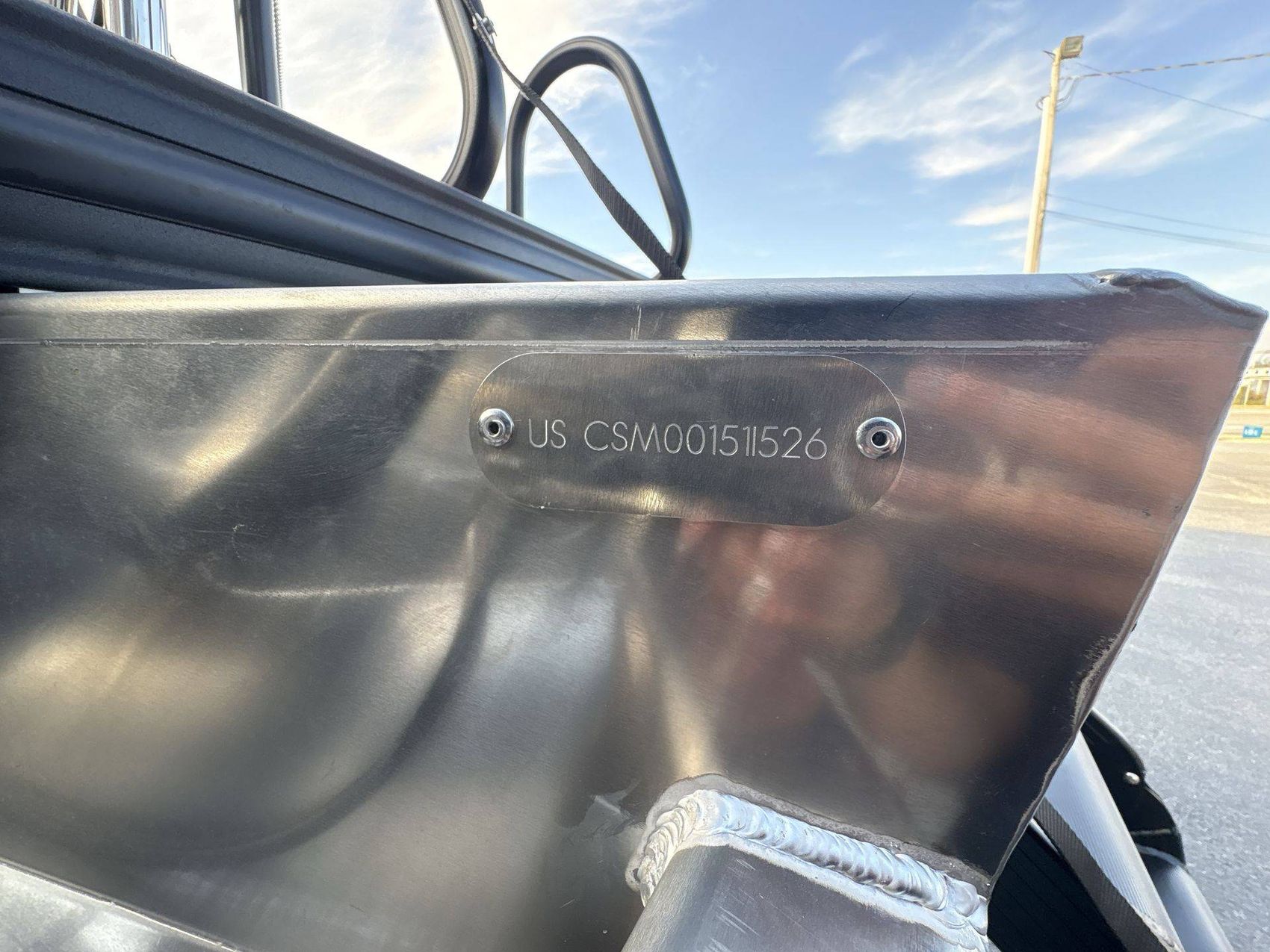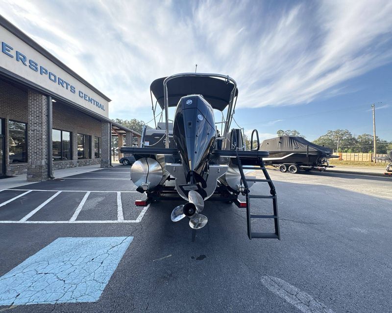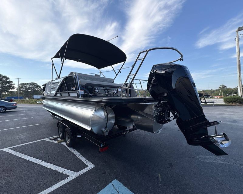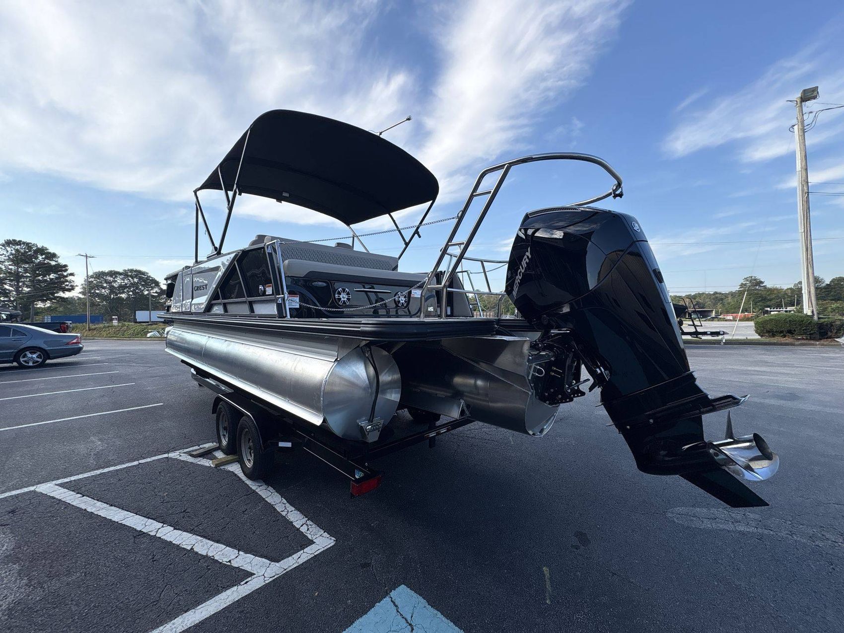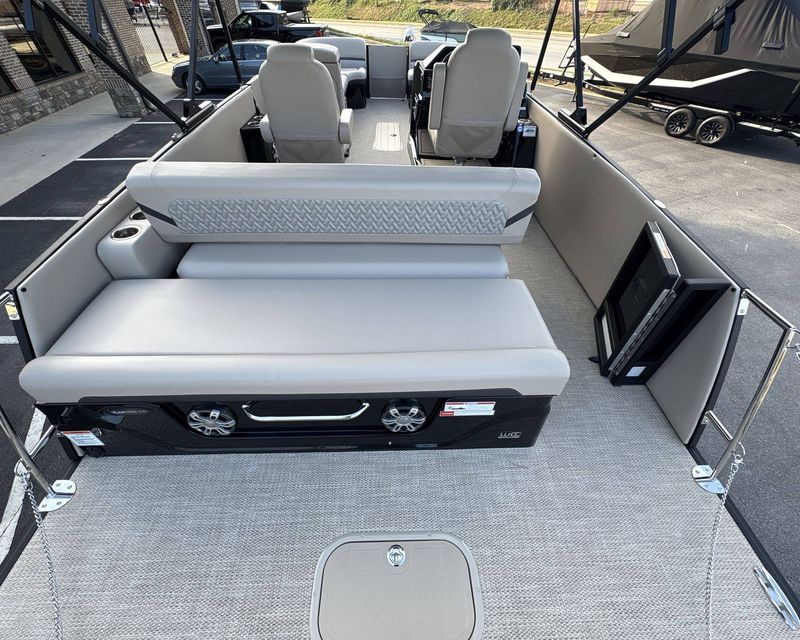 The exterior stuns with a vibrant black metallic fence panel, complemented by a white accent panel, setting this boat apart from the crowd. Attention to every minute detail, such as the powder-coated deck trim and corner caps, exudes an air of sophistication and ensures durability.
