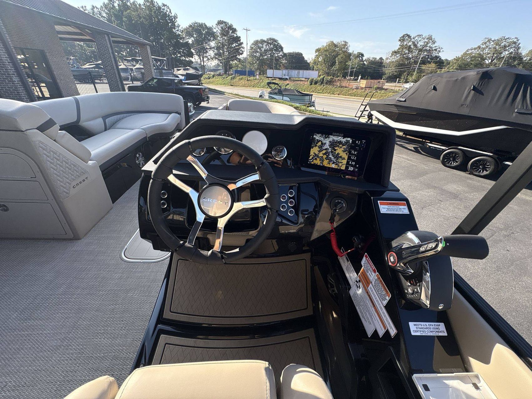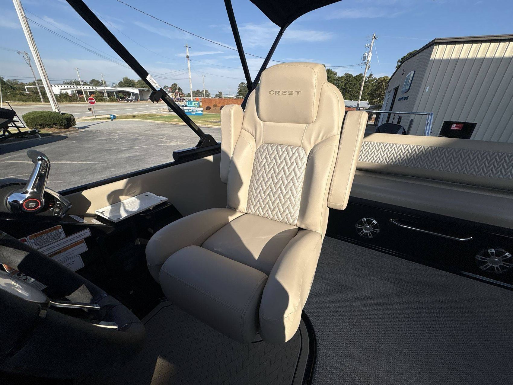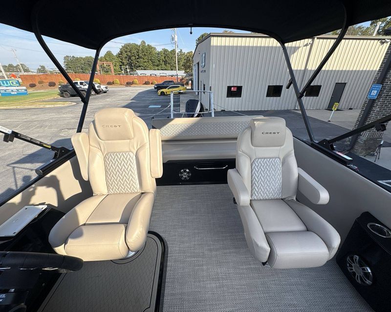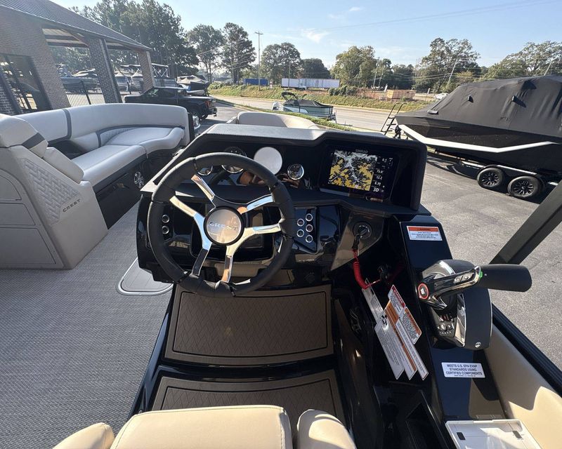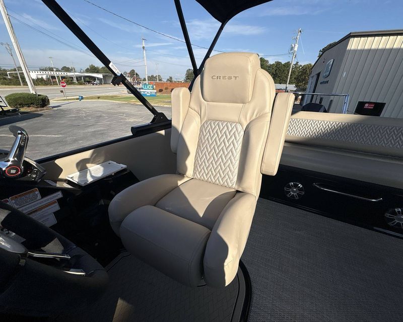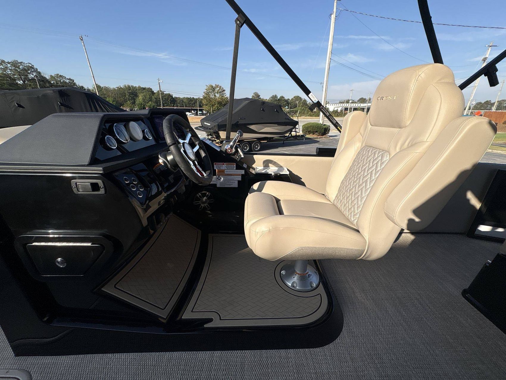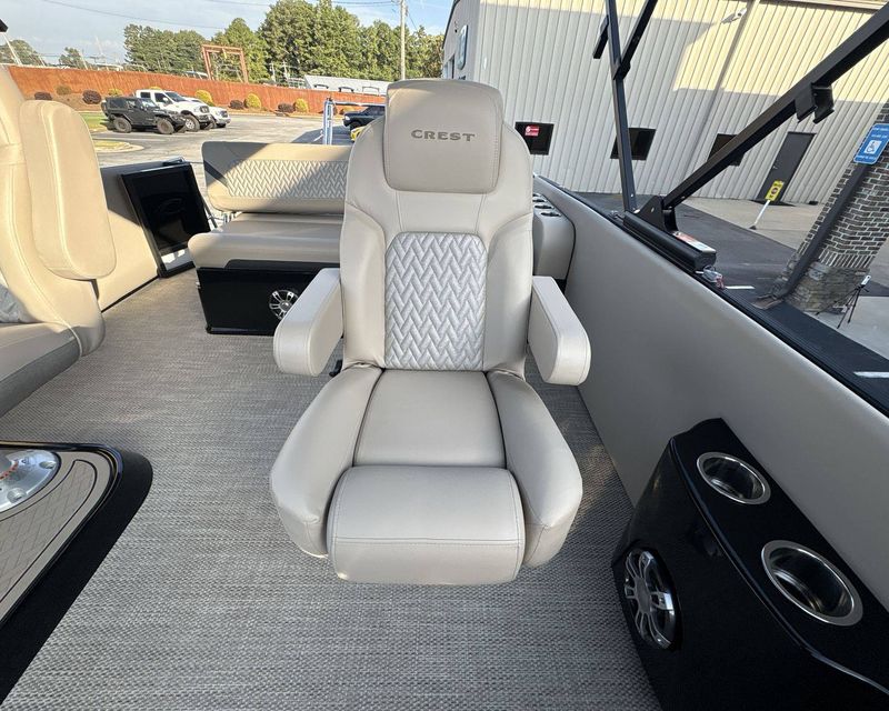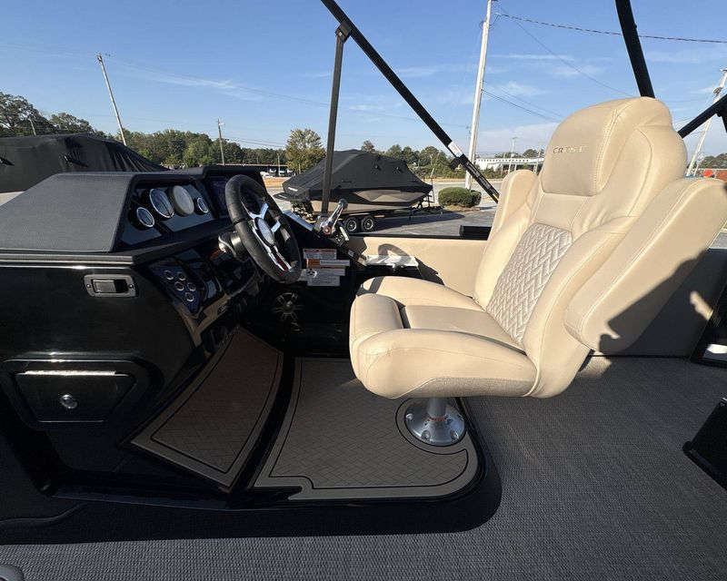 Inside the Crest Caribbean 230SLS, guests are welcomed by a luxurious tan interior dressed in black accents, complete with plush seating and a state-of-the-art console with gauges. Whether you're hosting a party or setting off for a relaxing cruise, its spacious design accommodates a sizeable crowd with room to spare.