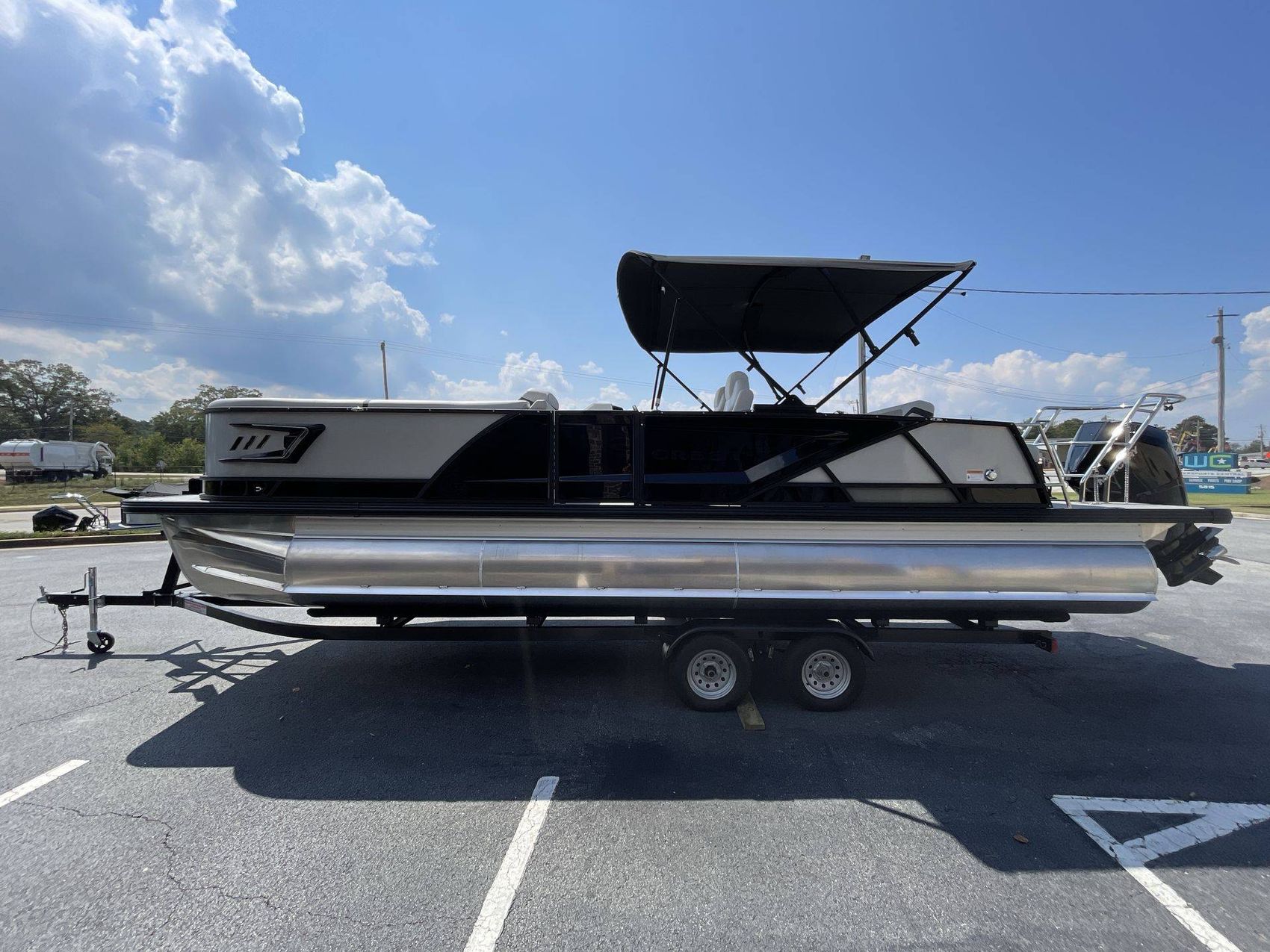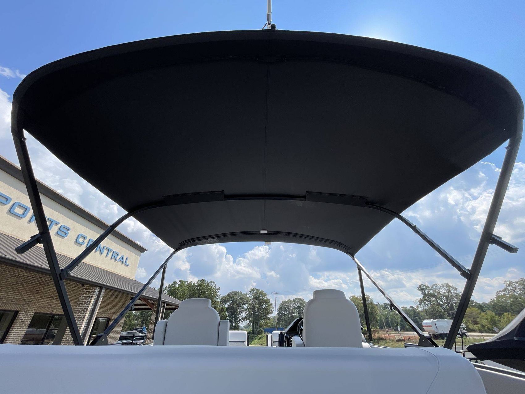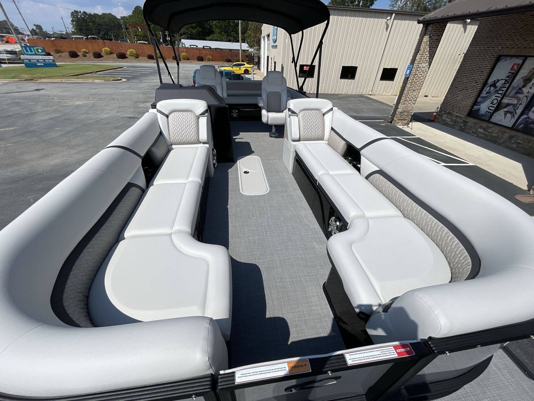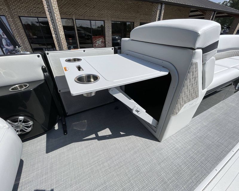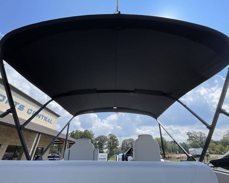 The boat's Bimini top is power-electric with speed arms, offering excellent coverage and shade. The boat provides ample space with mid ship - entertainment table and in-floor ski storage.