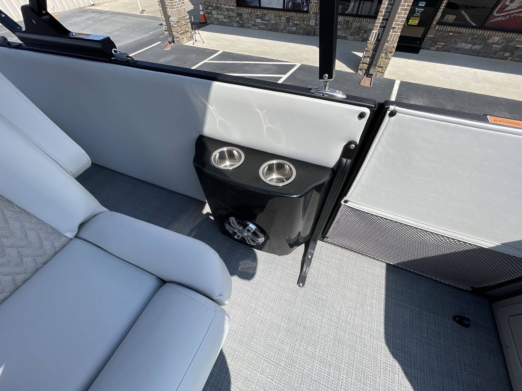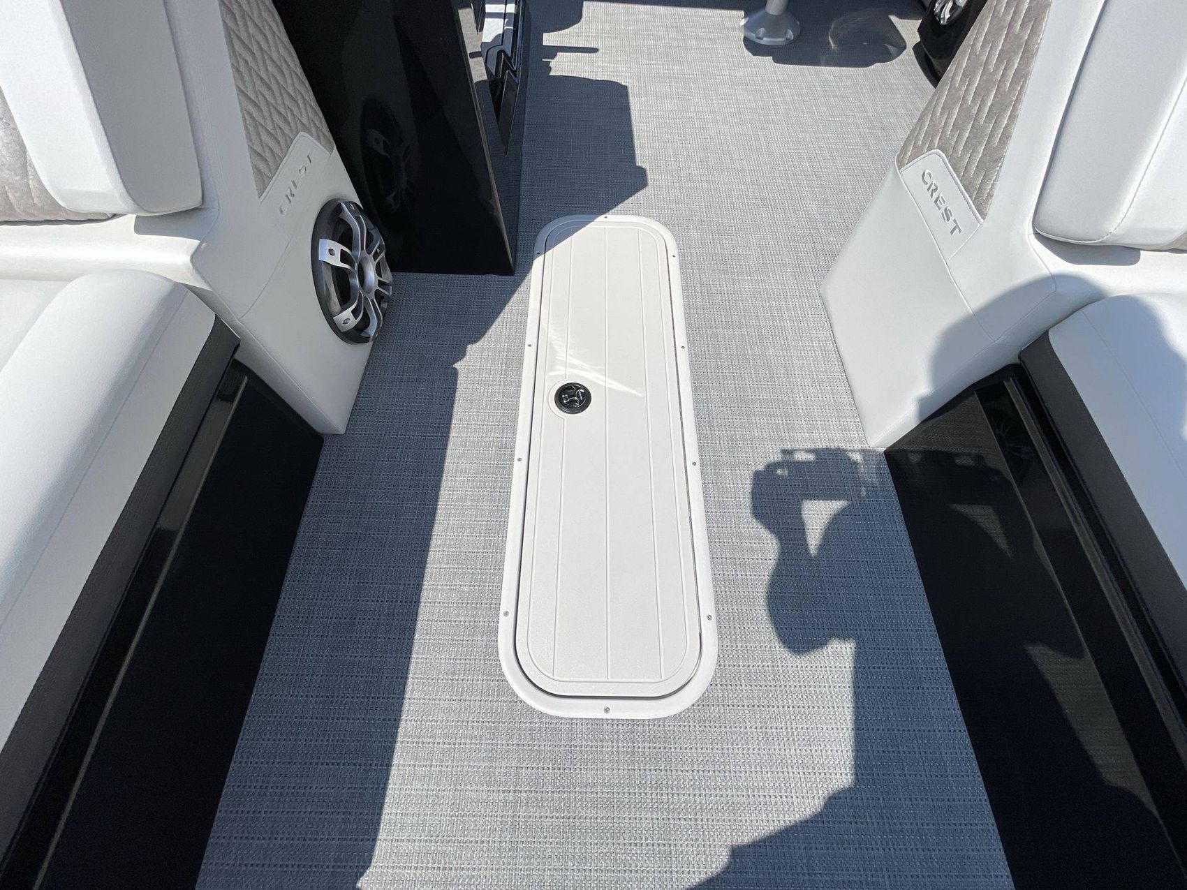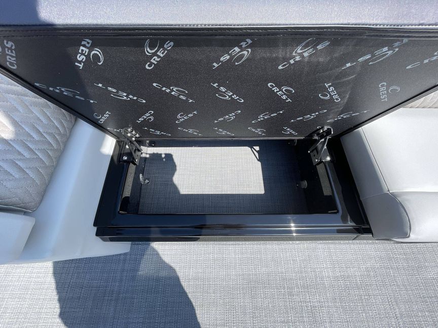 The interior of the boat is finished in light gray vinyl along with black accent vinyl for a timeless look. The boat's interior also features a gloss black gelcoat. The flooring is finished with SeaGrass in Compass Gun Metal (Gray) which is not only attractive but also highly durable.