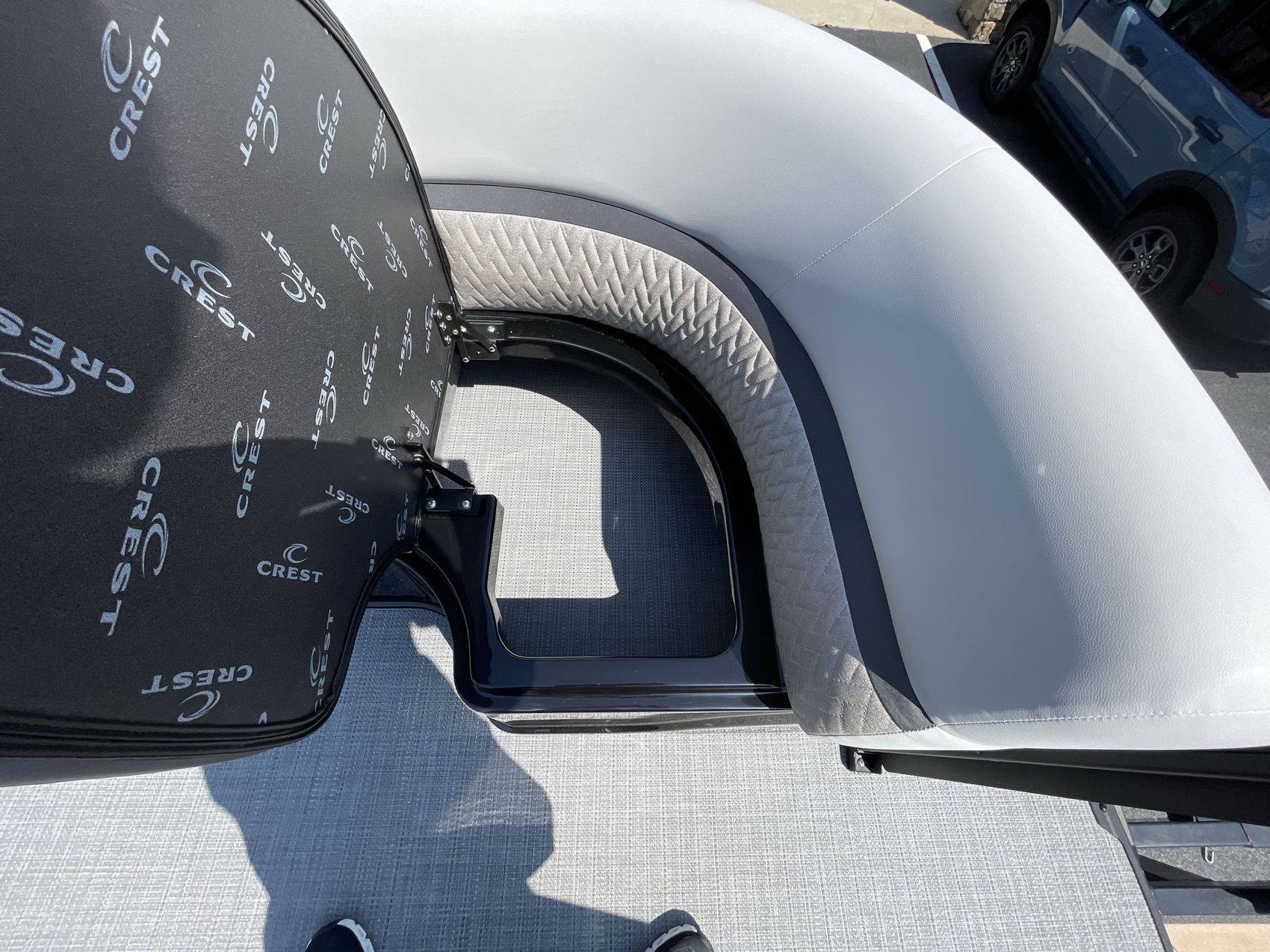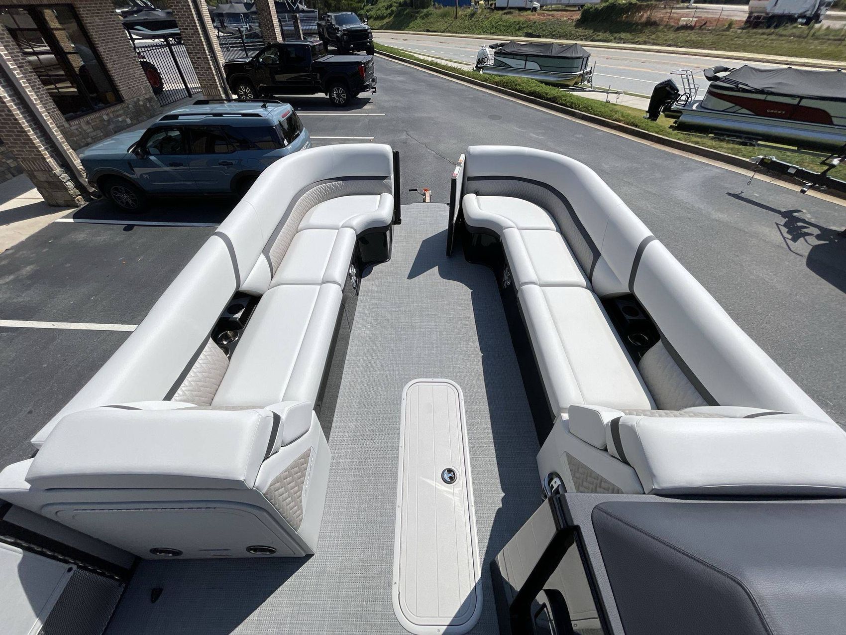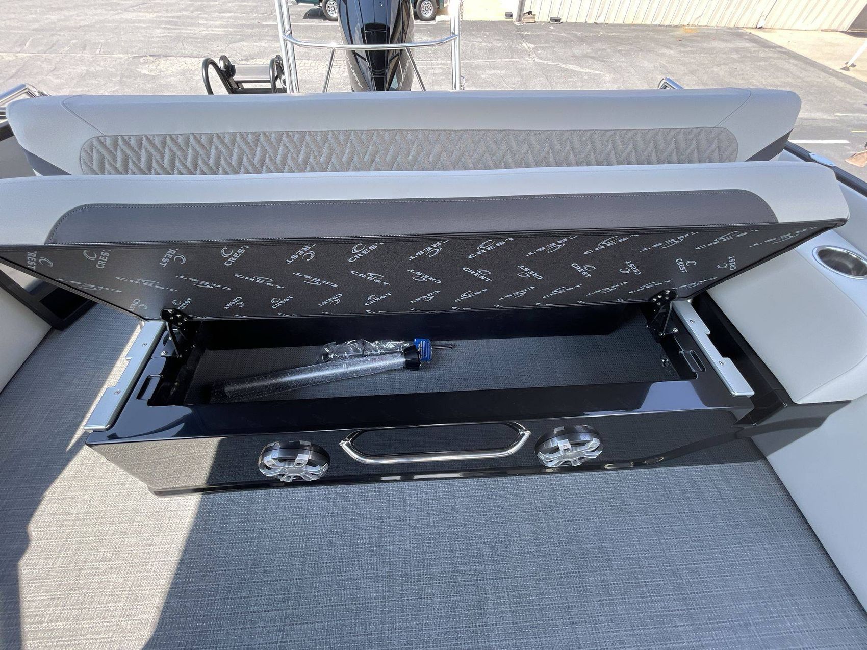 The interior of the boat is finished in light gray vinyl along with black accent vinyl for a timeless look. The boat's interior also features a gloss black gelcoat. The flooring is finished with SeaGrass in Compass Gun Metal (Gray) which is not only attractive but also highly durable.