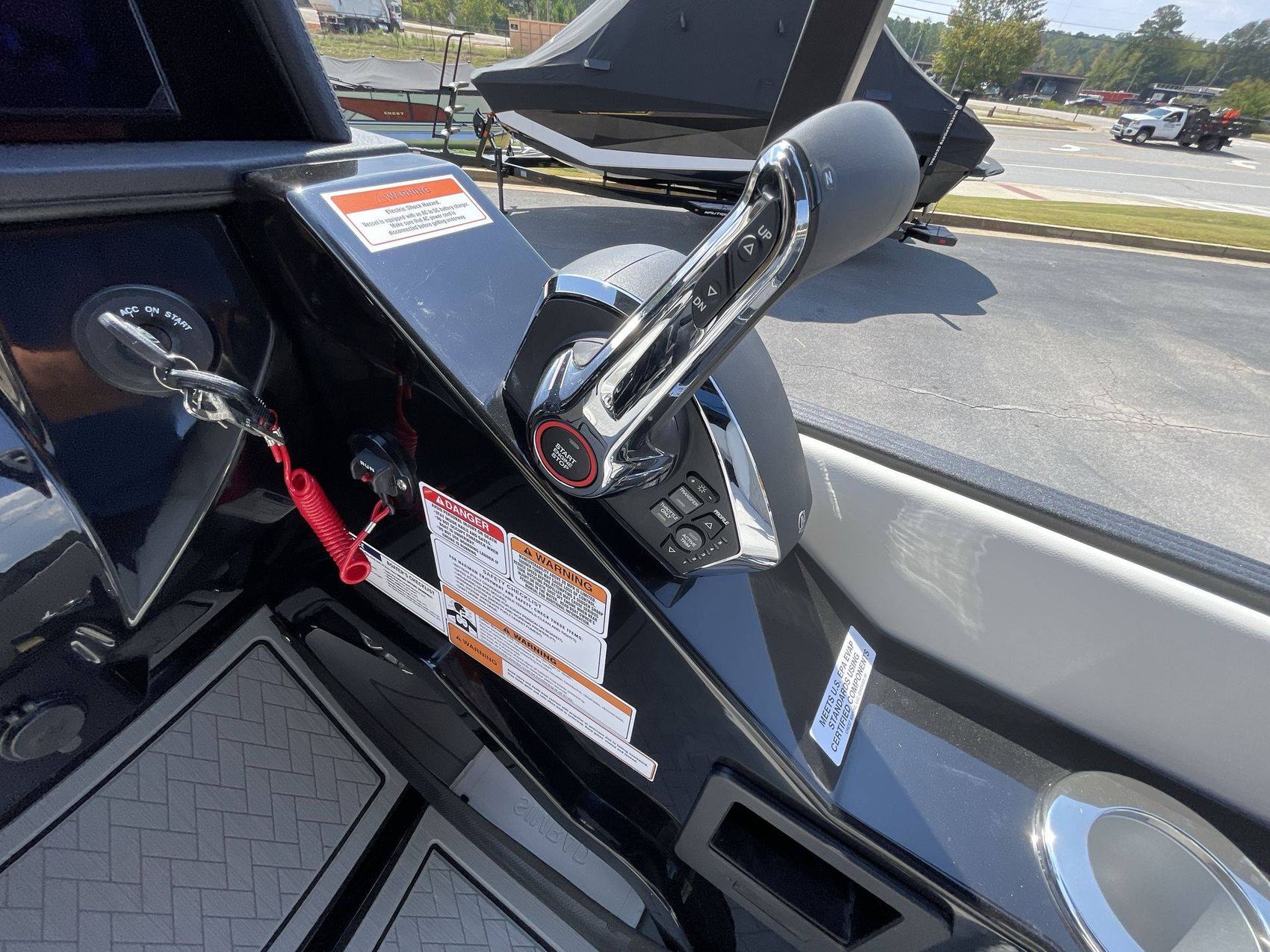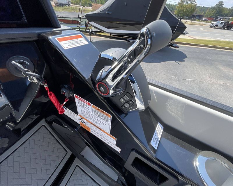 This boat comes pre-rigged with Mercury Digital system, which allows you to monitor and control boat systems including engine data, fuel levels, battery charge, and more, all from one screen.