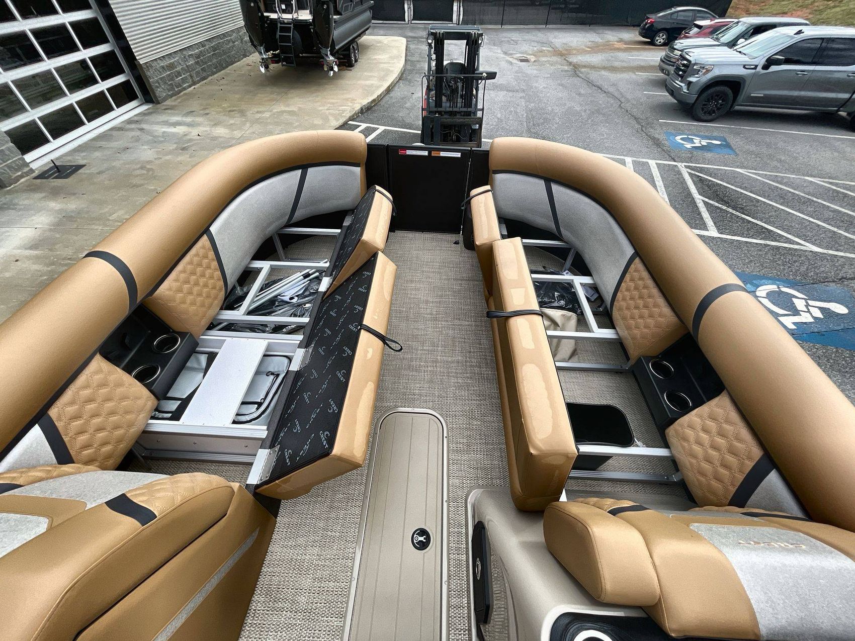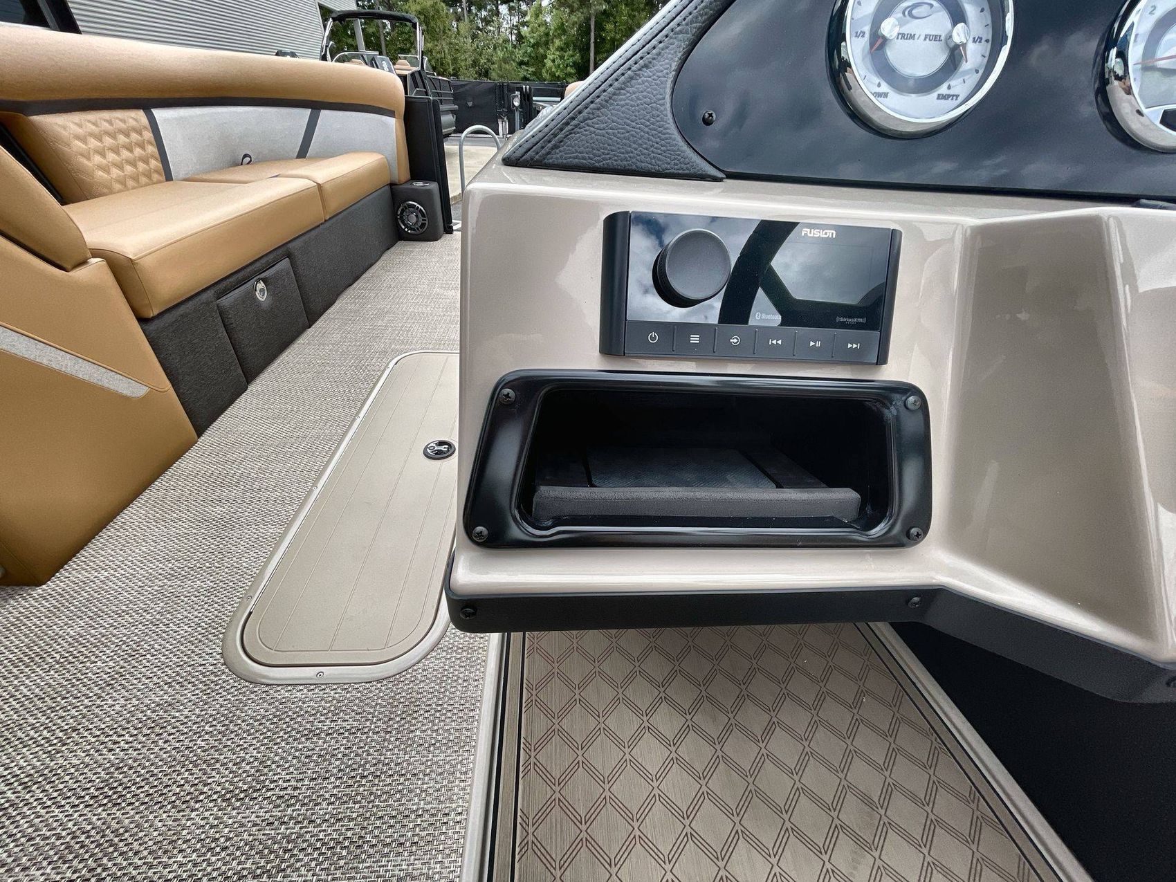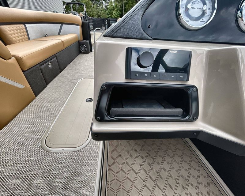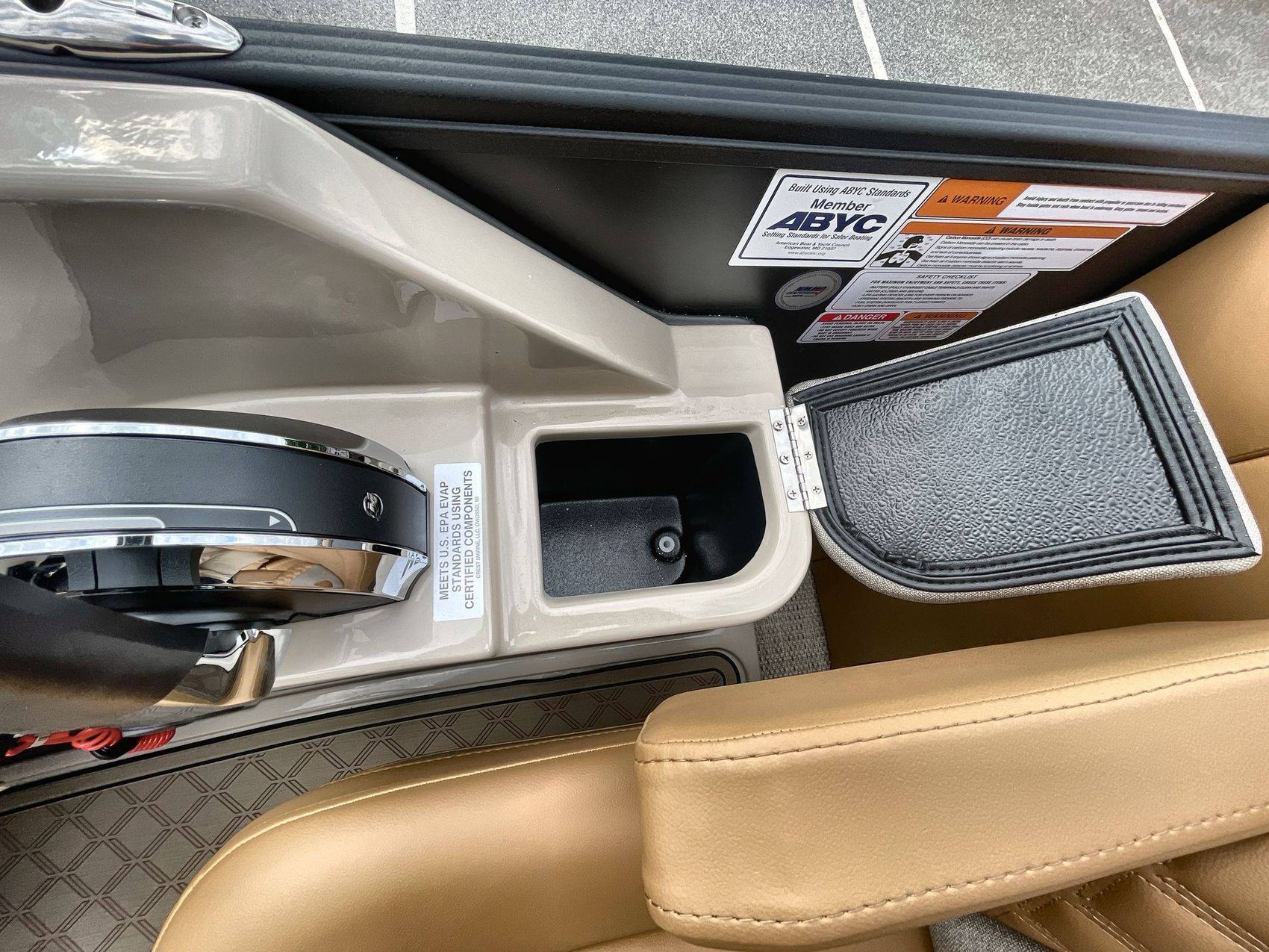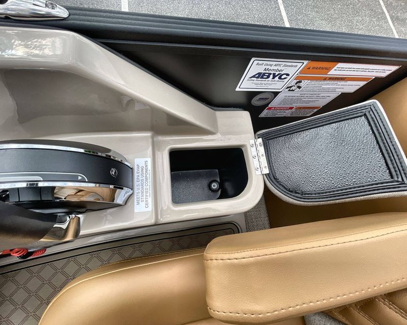 For your entertainment, the boat comes equipped with an Audio Package - Standard that offers clear and immersive sound. Seek shade under the Bimini Top – Power, perfect for sunny days. Enjoy easy access to the water with the Lillipad Ladder and keep your belongings secure with In Floor Ski Storage.
