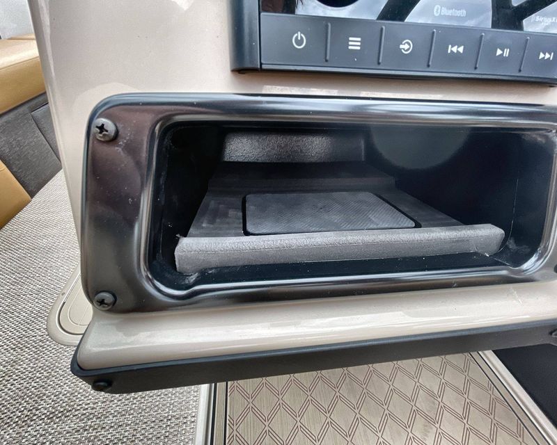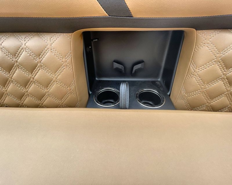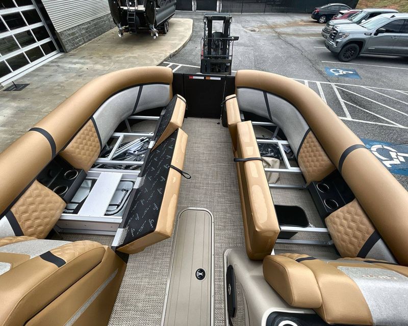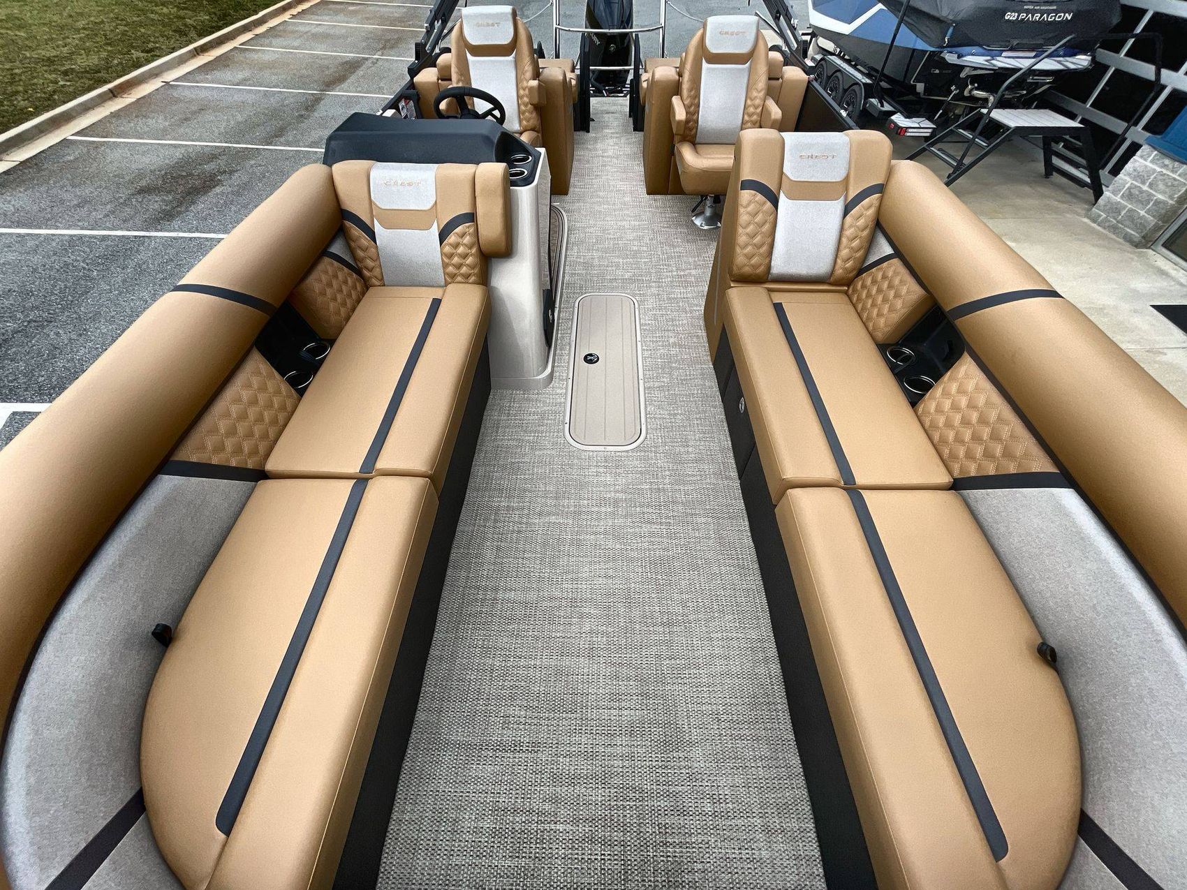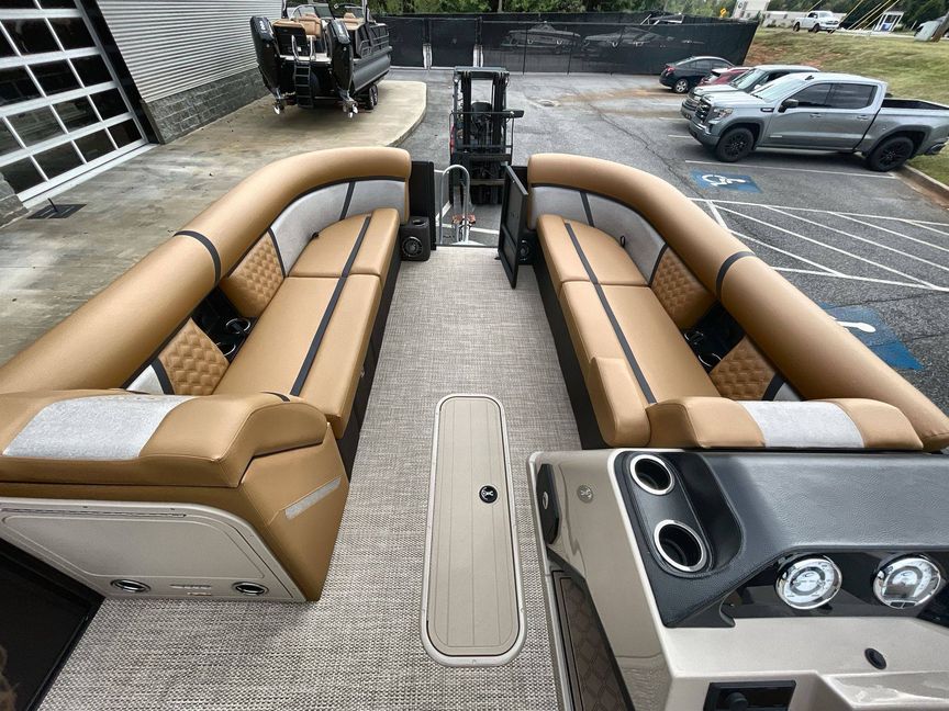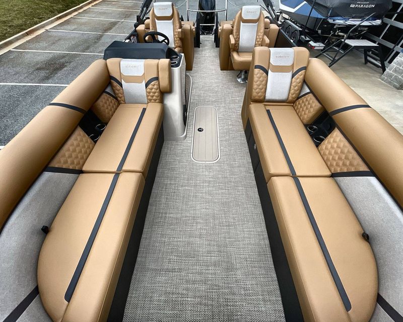 Relax in style with the boat’s Beach Base Vinyl seating, accented with Black Accent Vinyl for an extra touch of class. Enjoy the natural feel underfoot with the luxurious SeaGrass - Compass Solar Tan flooring. The boat comes with an entertainment table mid-ship for all of your socializing needs.