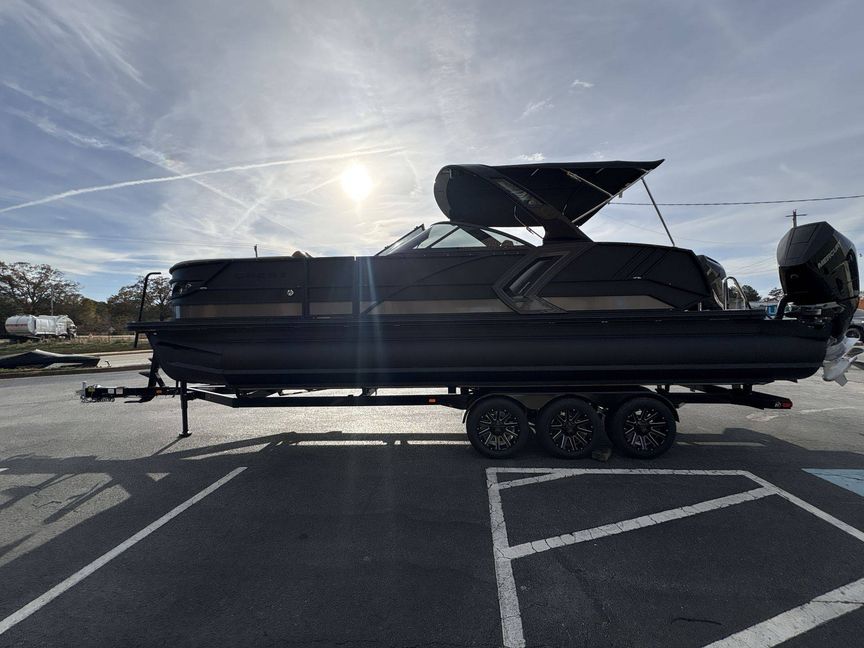 Exterior Design: The exterior of this boat is a testament to luxury and sophistication, donned in a regal Matte Black finish, accented tastefully with Steel details. This 'Black Beauty' is a head-turner with its Powder-Coated Deck Trim and Corner Caps that add a polished, exquisite finish to its overall design.