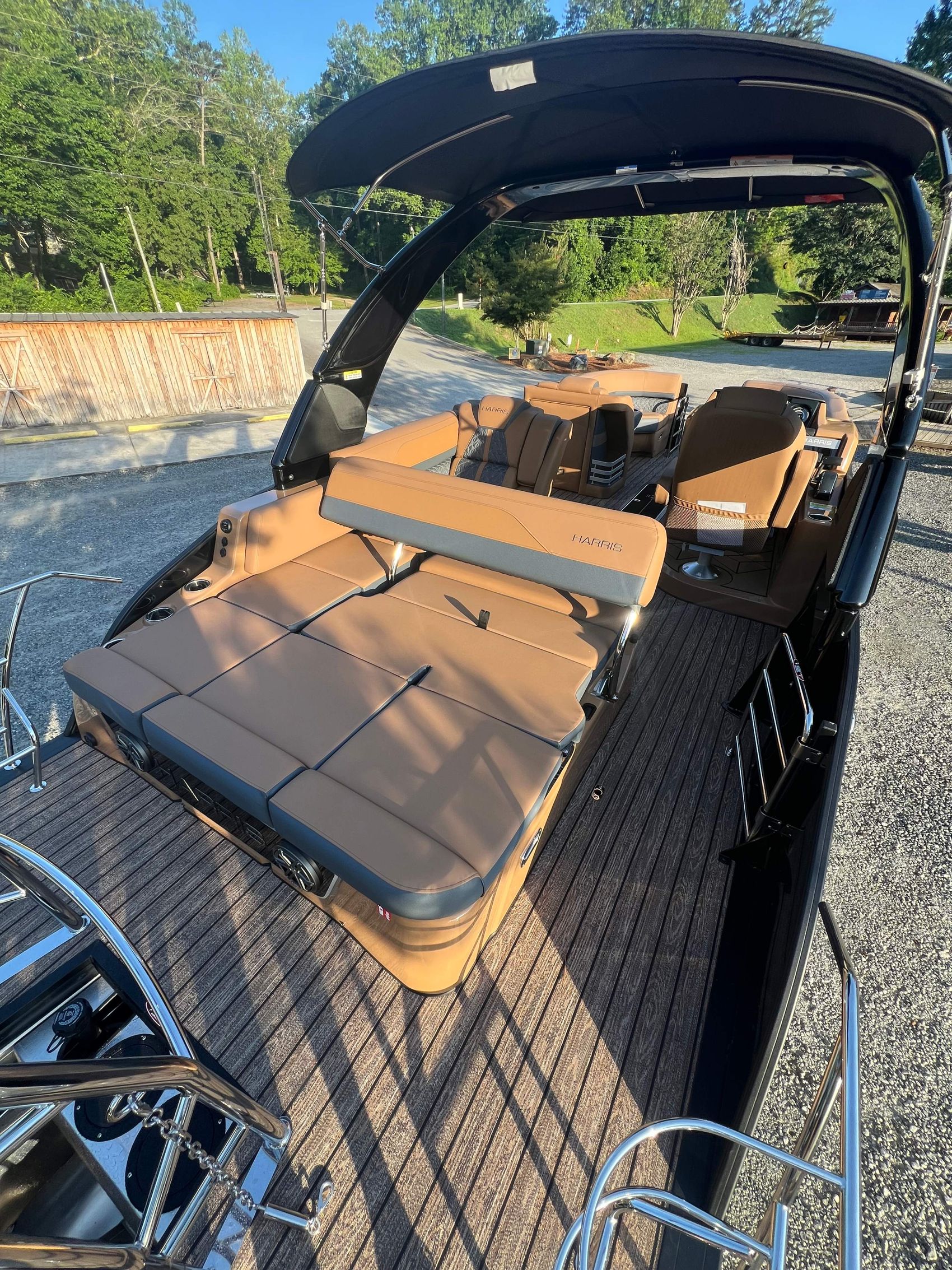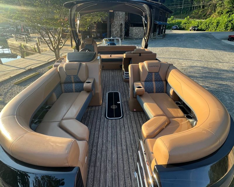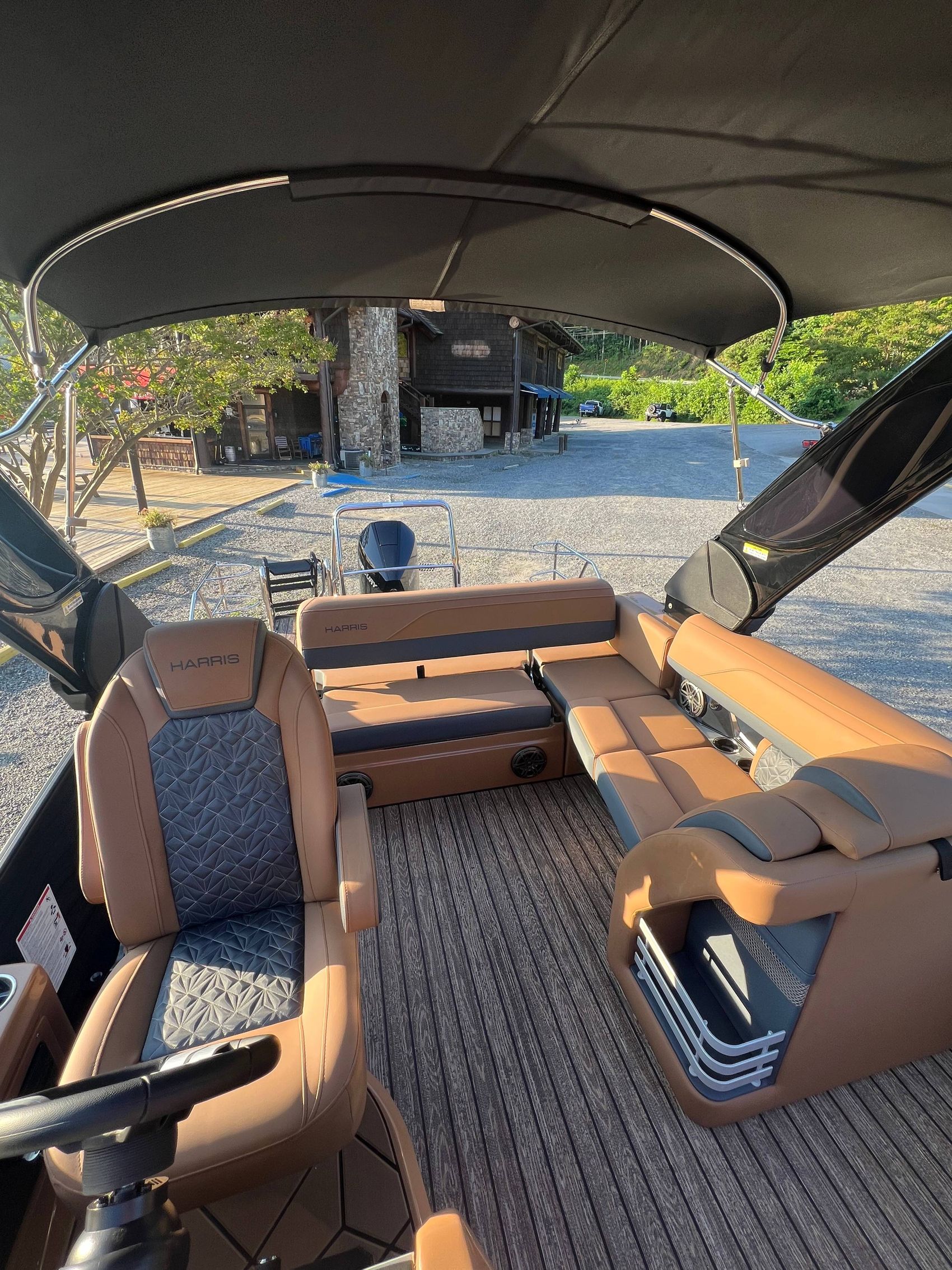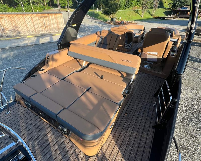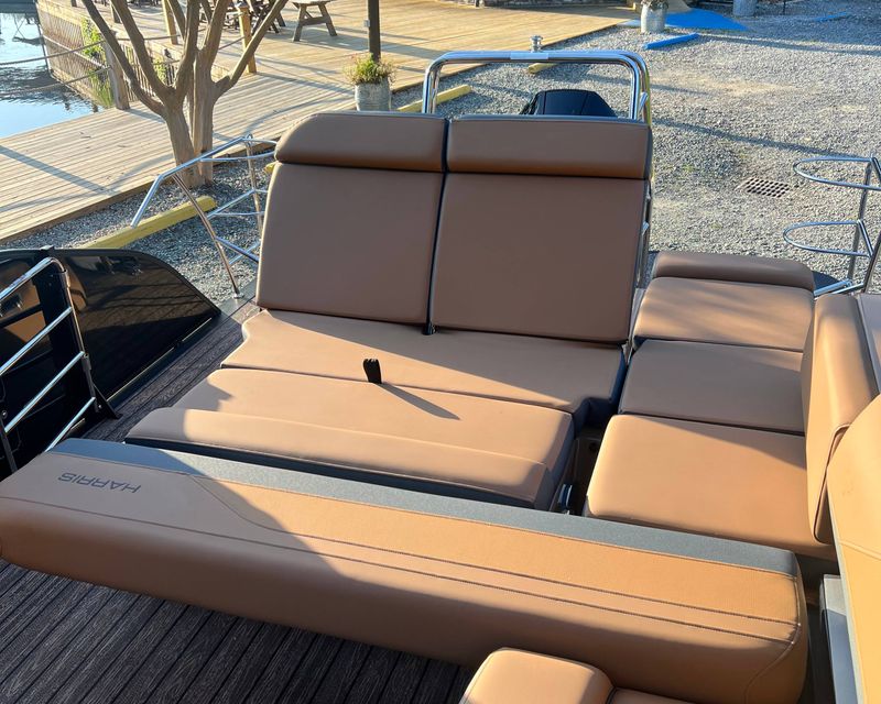 The interior of the 2026 Harris 230 Grand Mariner matches its alluring exterior with comfort features and amenities for up to 14 guests. It includes plush, hand-stitched upholstery, a convenient mid-ship walk-through, a generous sun lounge, and an inviting bow seating area.