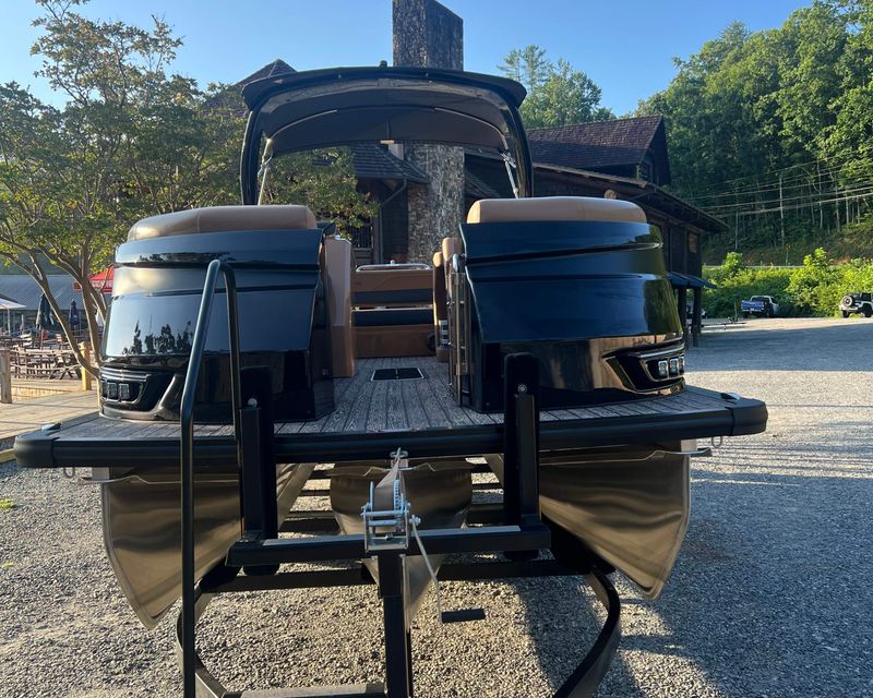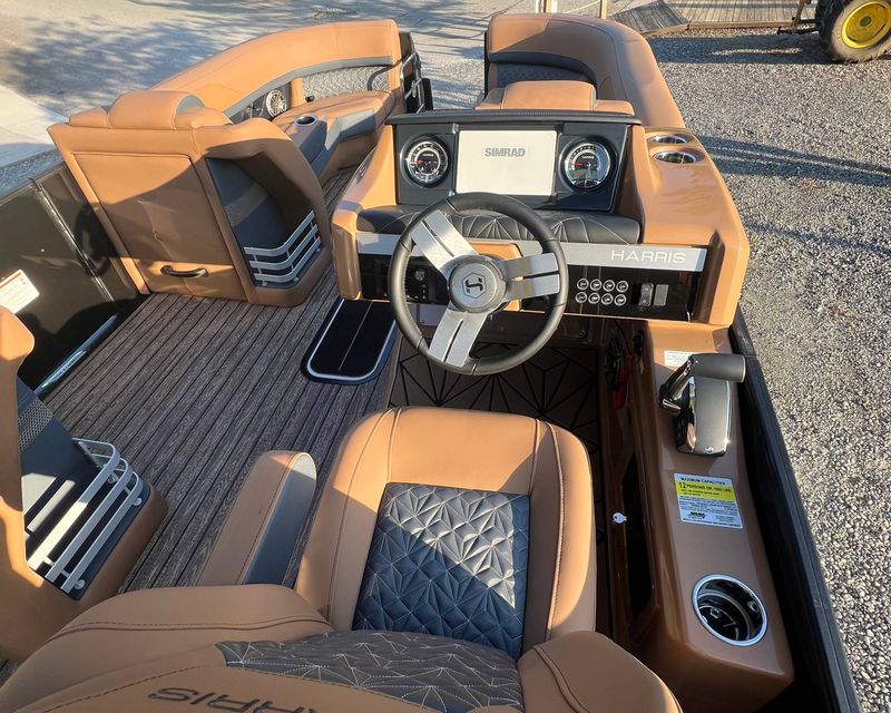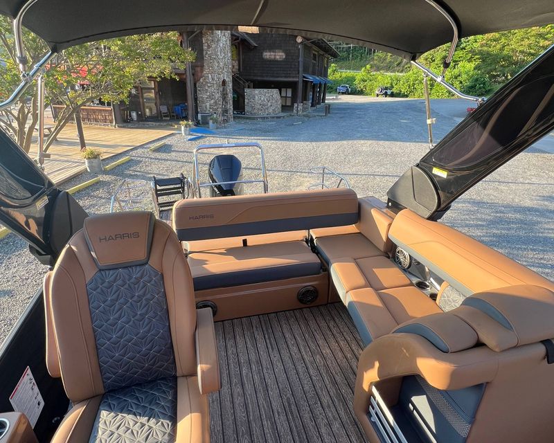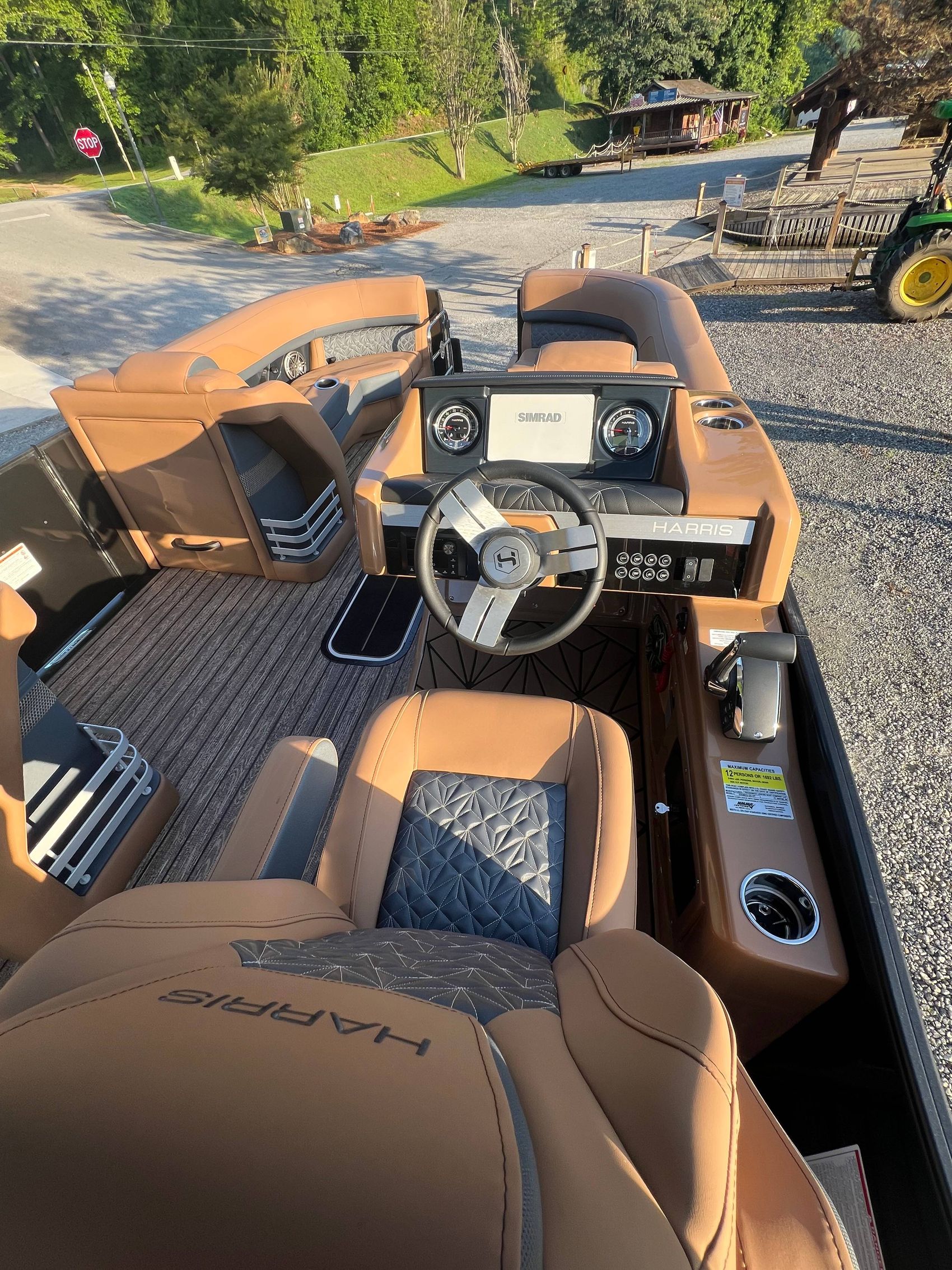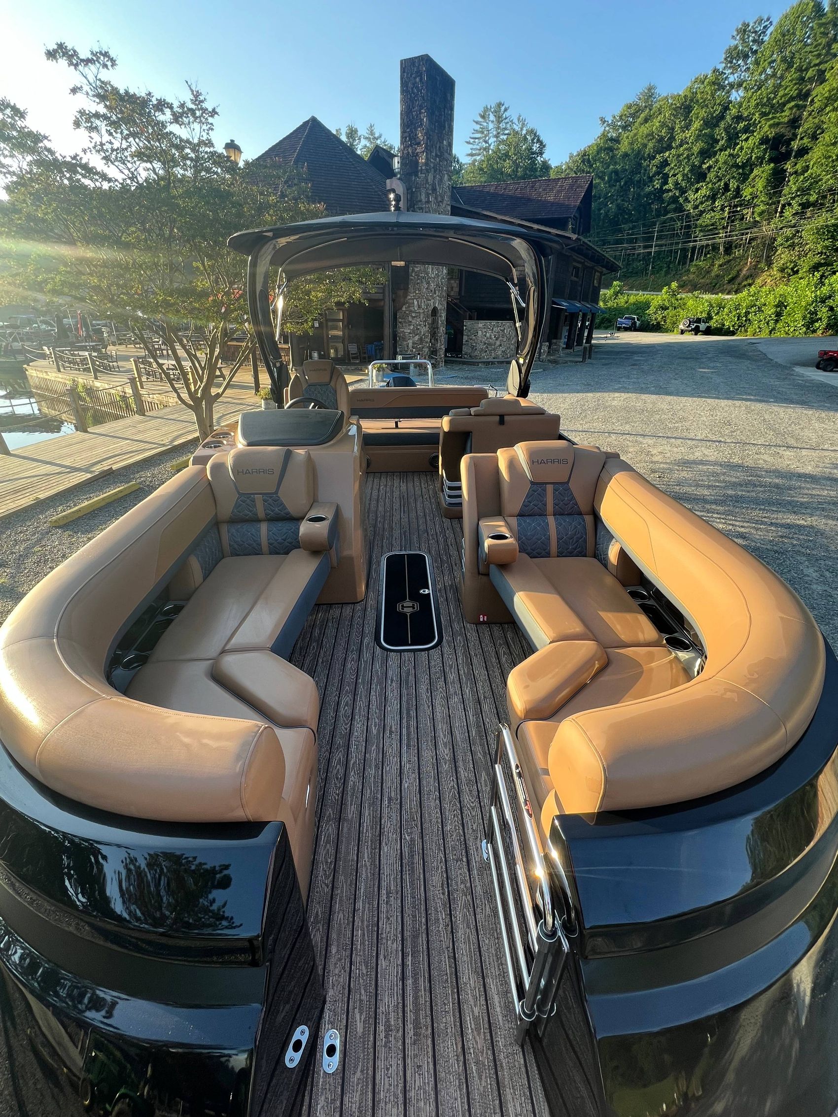 The interior of the 2026 Harris 230 Grand Mariner matches its alluring exterior with comfort features and amenities for up to 14 guests. It includes plush, hand-stitched upholstery, a convenient mid-ship walk-through, a generous sun lounge, and an inviting bow seating area.