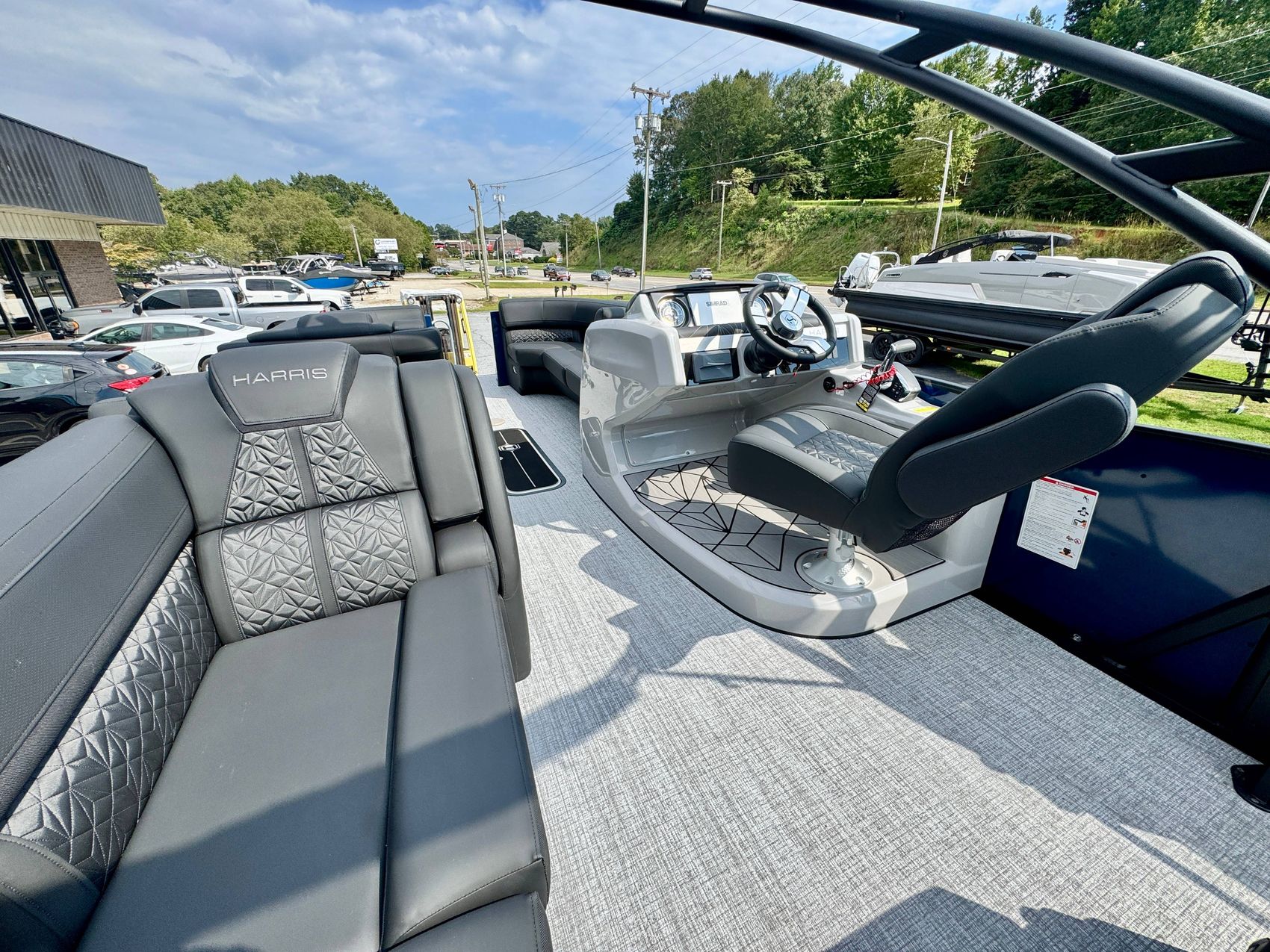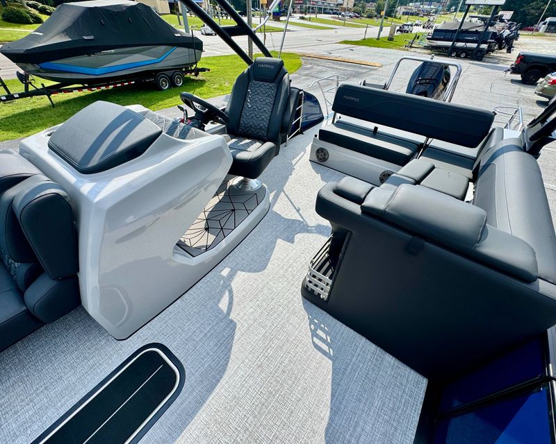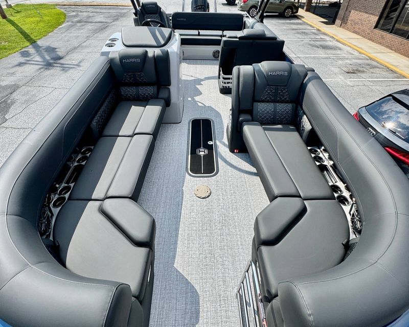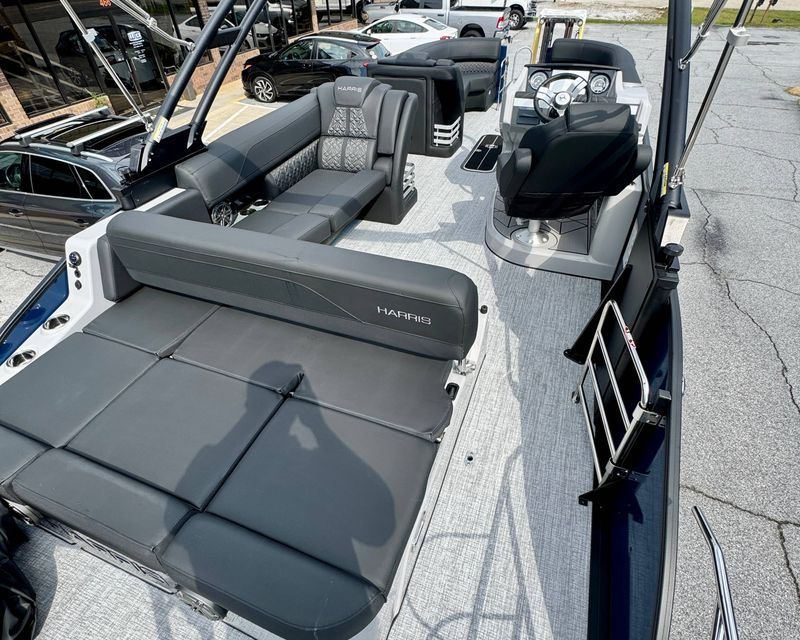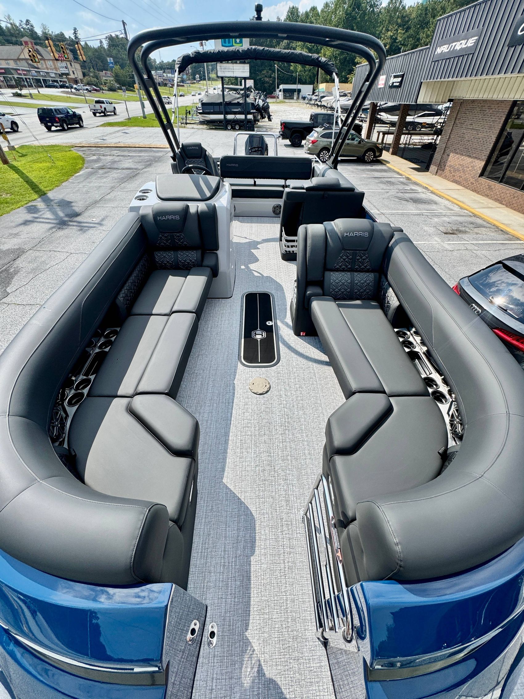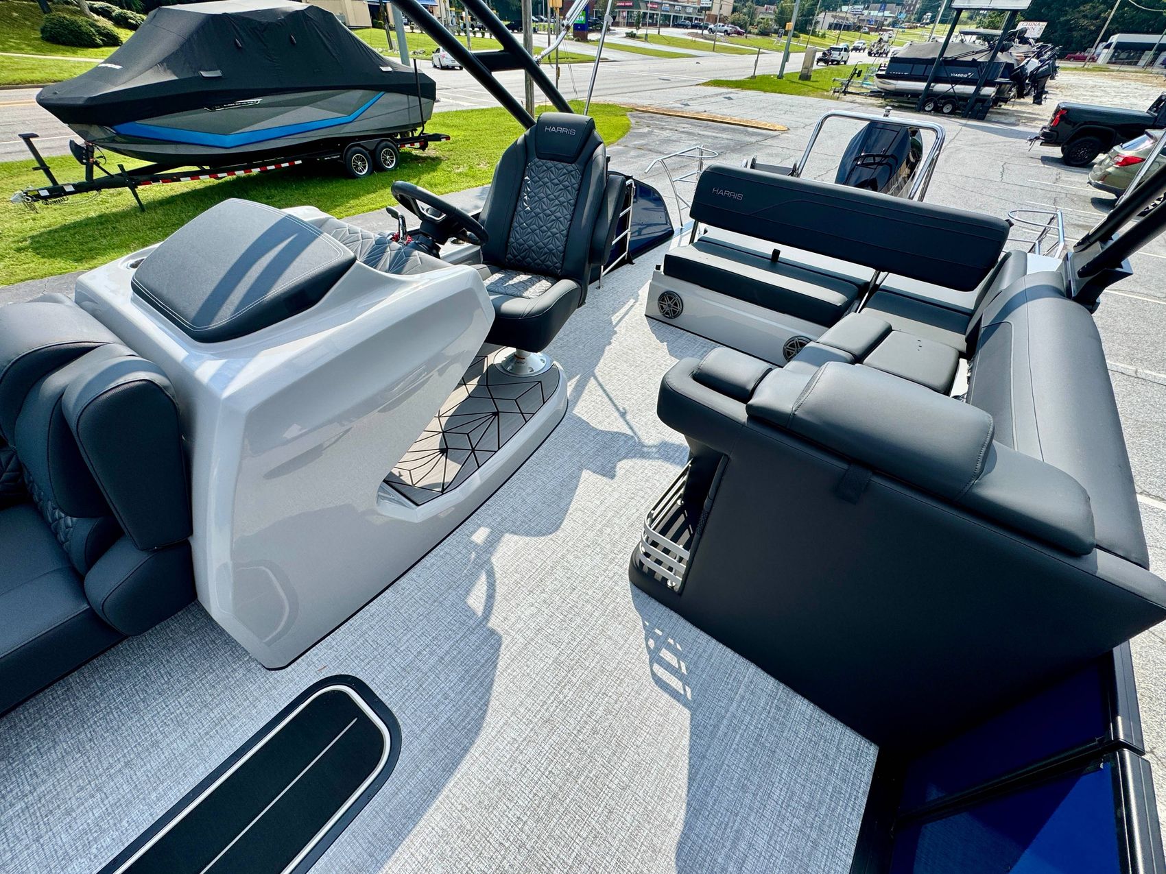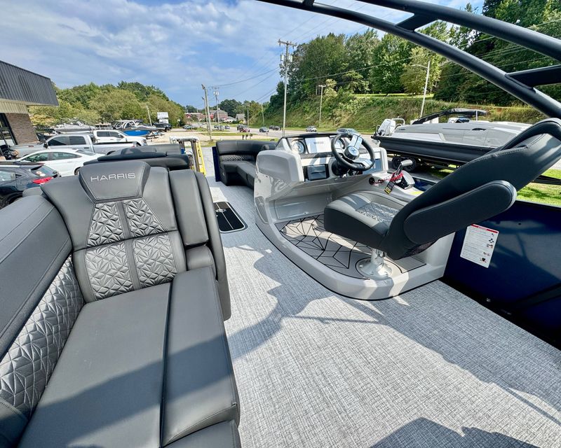 Design and Color: The 2026 Harris Grand Mariner 250 boasts a striking Midnight Blue exterior complemented by a Black Sapphire Accent, adding an element of elegance and luxury to its overall presence. Inside, the boat prides itself on a Luxe Cool Touch Caviar interior, offset by an Onyx Black Accent that adorns the cabin for a cohesive look.
