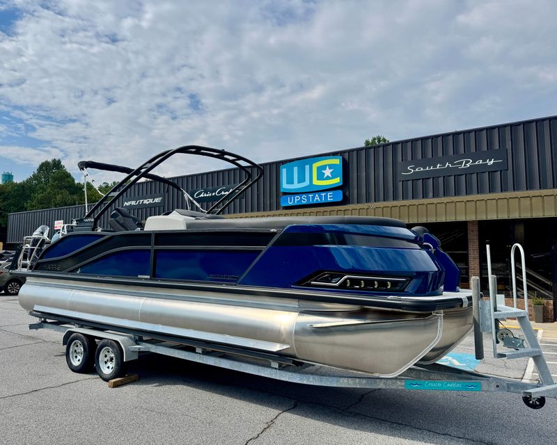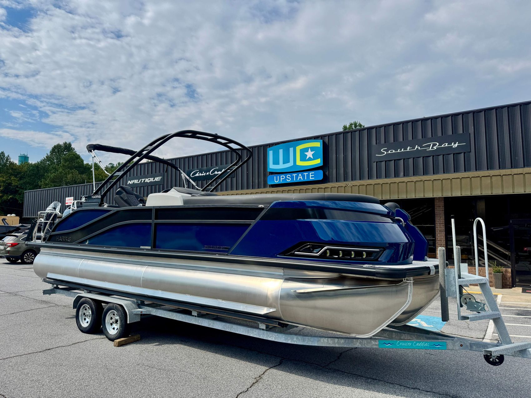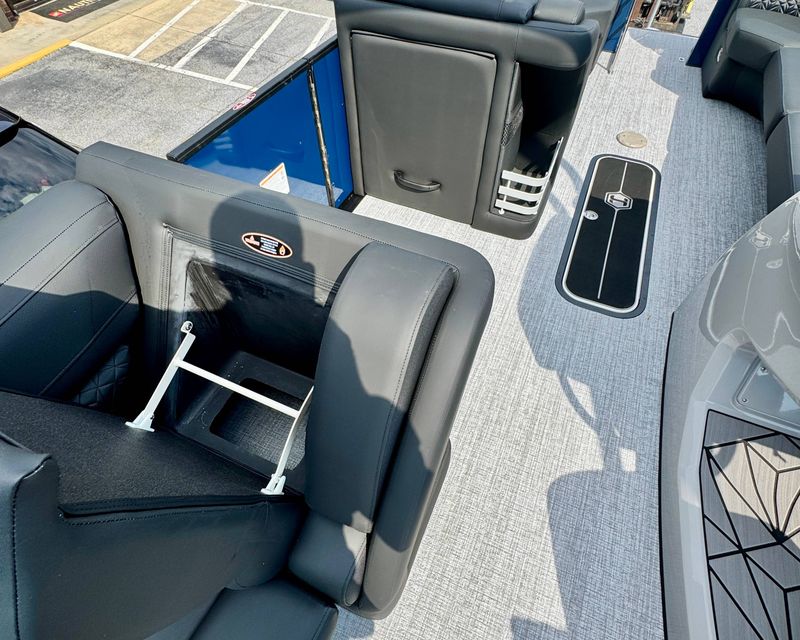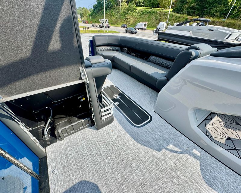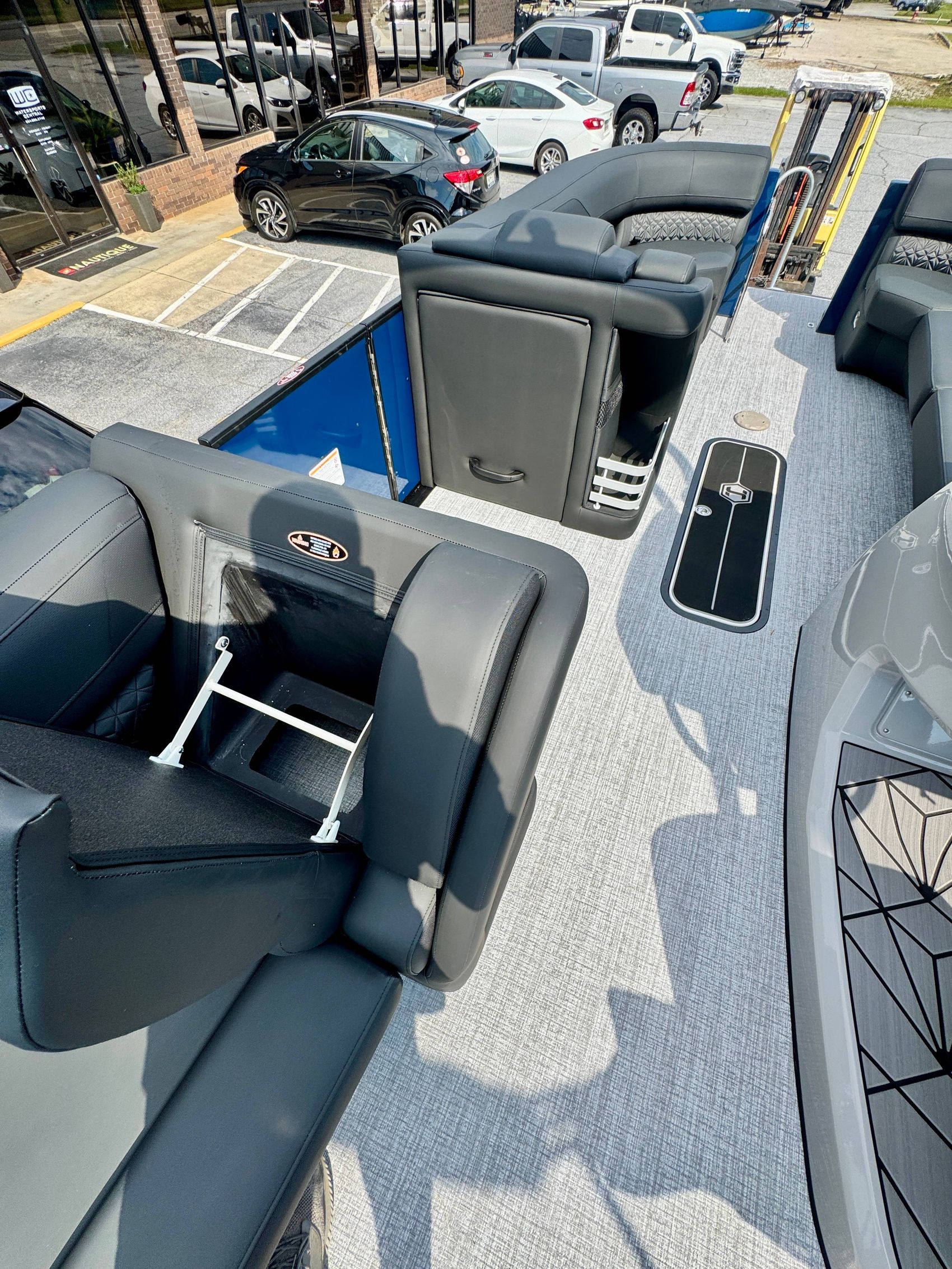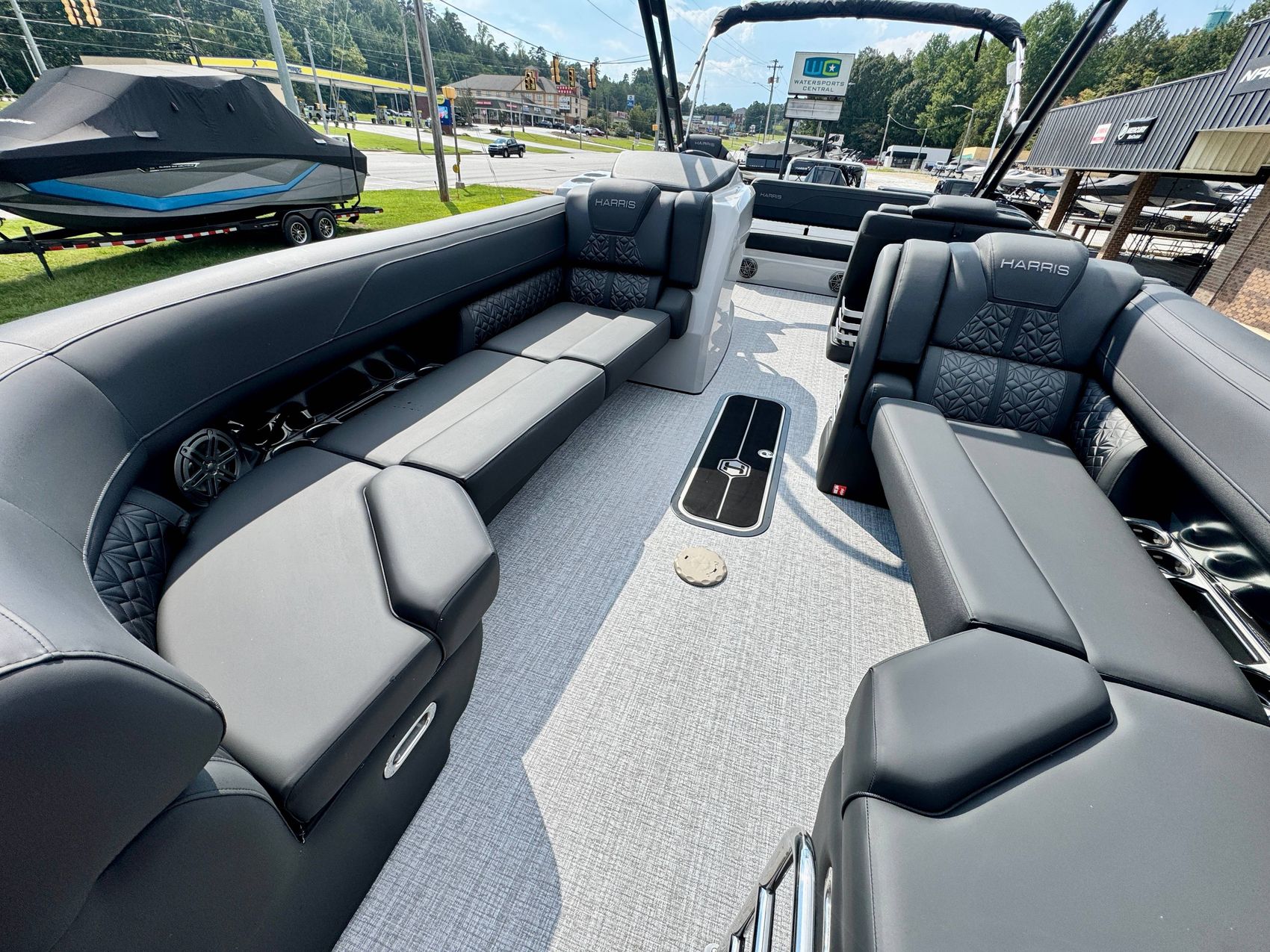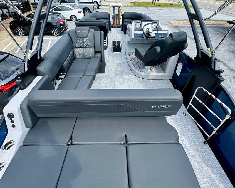 Design and Color: The 2026 Harris Grand Mariner 250 boasts a striking Midnight Blue exterior complemented by a Black Sapphire Accent, adding an element of elegance and luxury to its overall presence. Inside, the boat prides itself on a Luxe Cool Touch Caviar interior, offset by an Onyx Black Accent that adorns the cabin for a cohesive look.