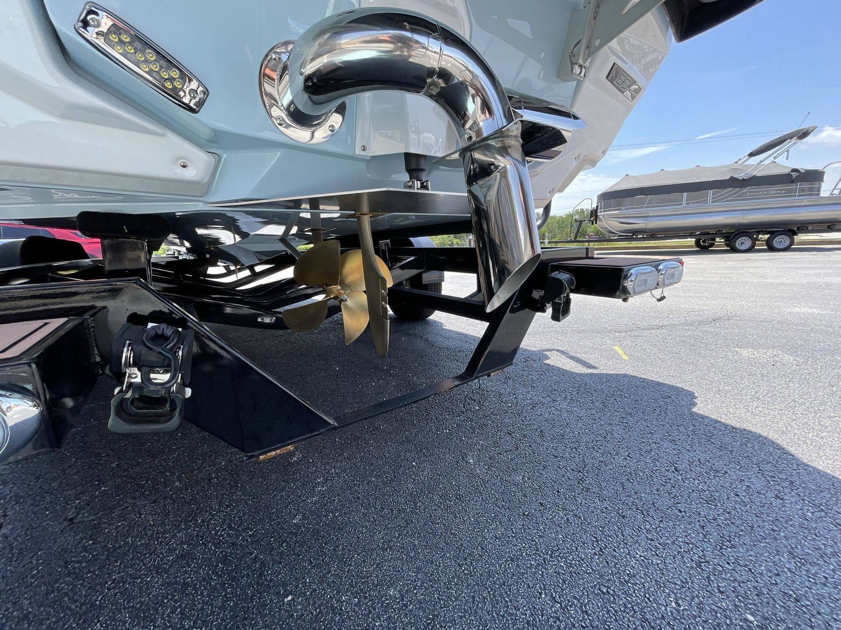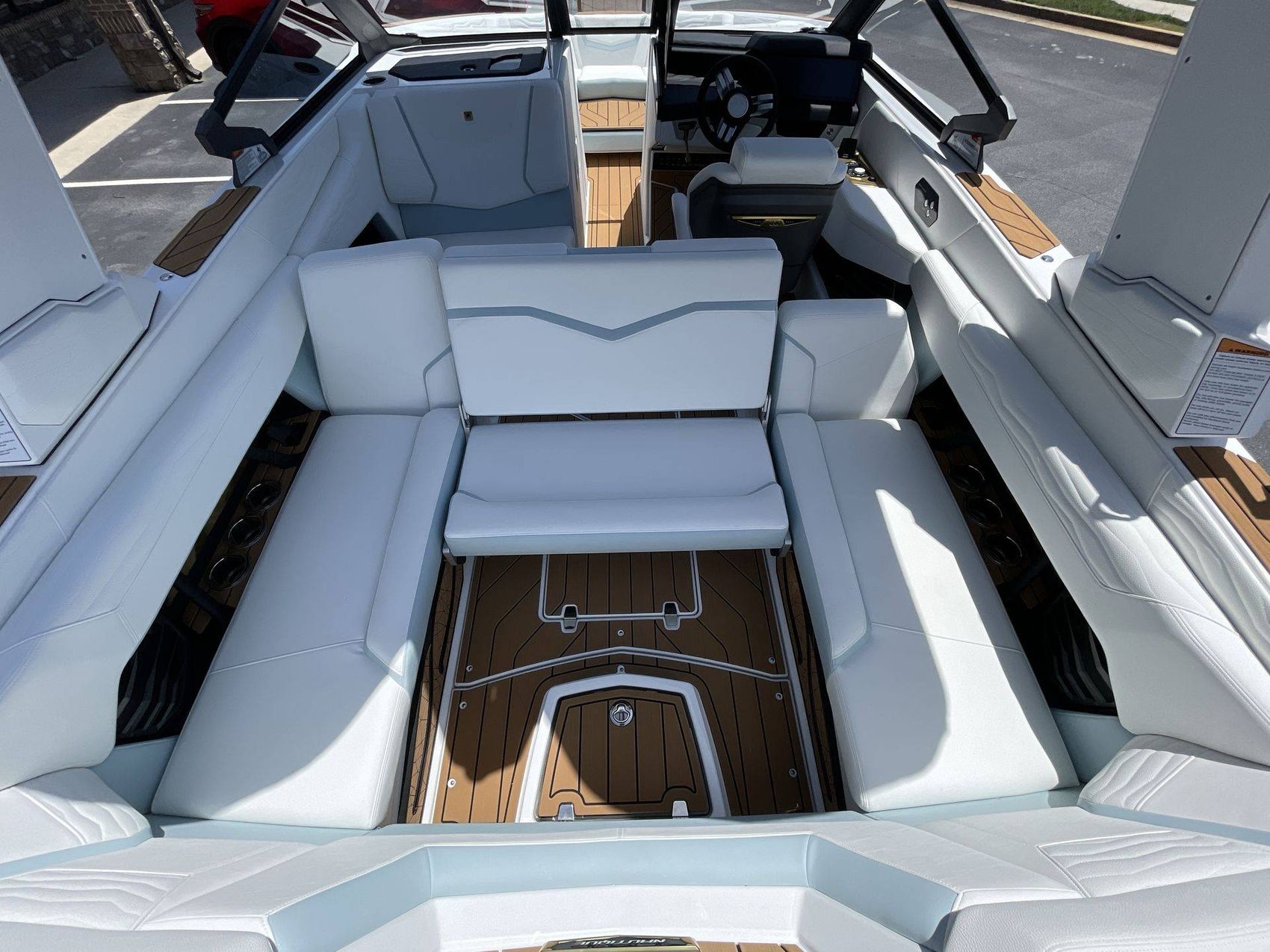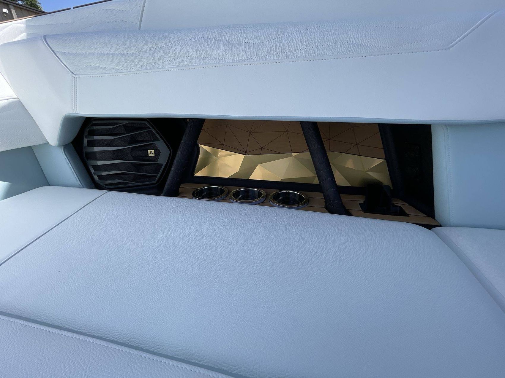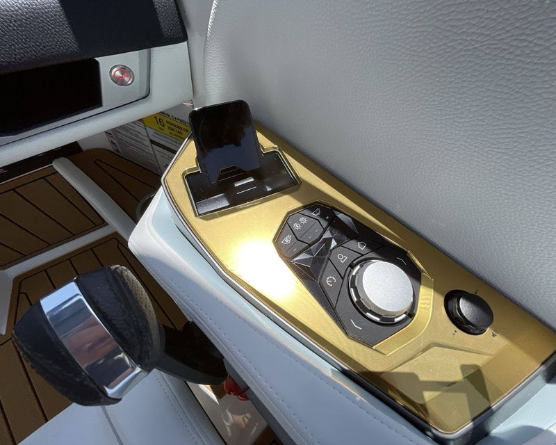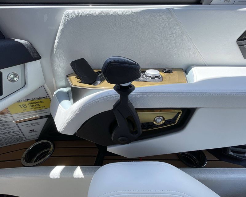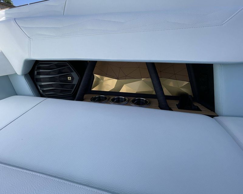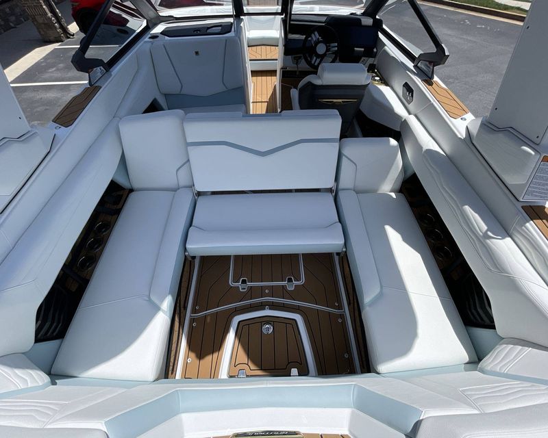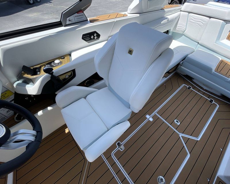 The Mystic White interior deck color along with its Main Stripe Color and Main Accent Stripe Color give the boat a refreshing look. The Hull Bottom and Platform are done in a striking Steel Blue Color. The interior also features a Legacy Gold Chrome Finish with Illusion Frost.