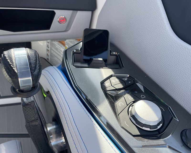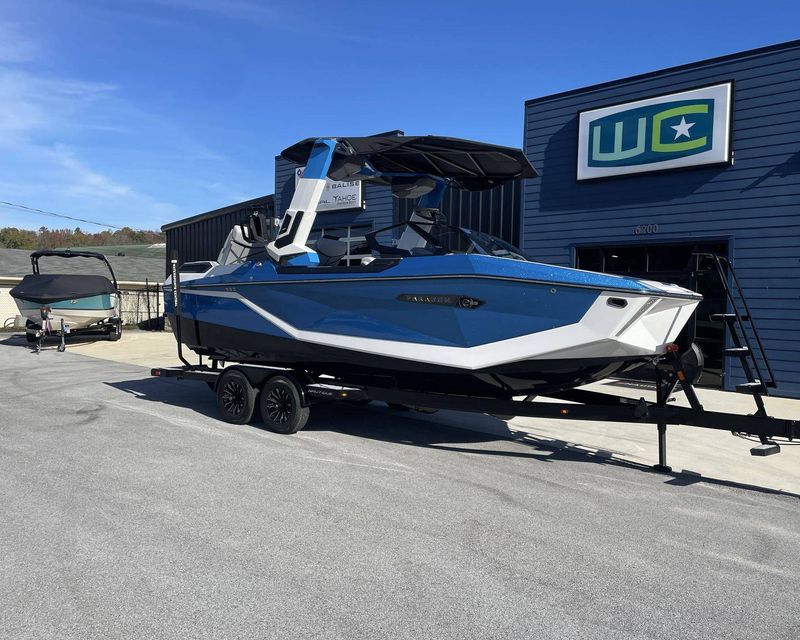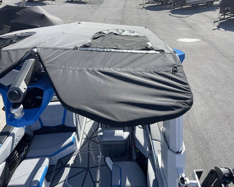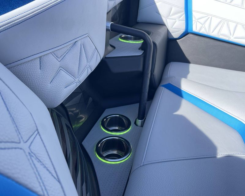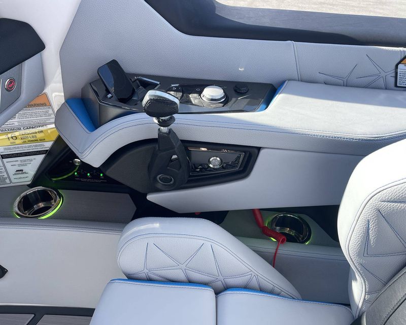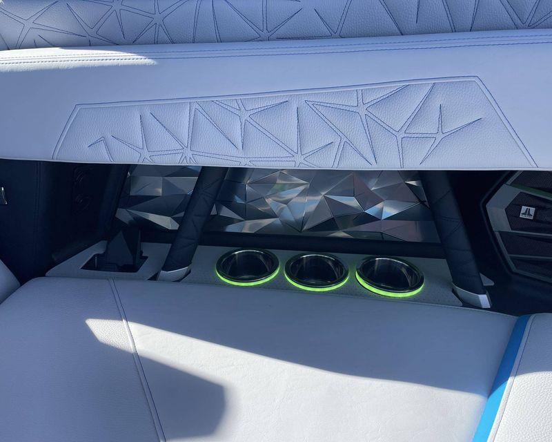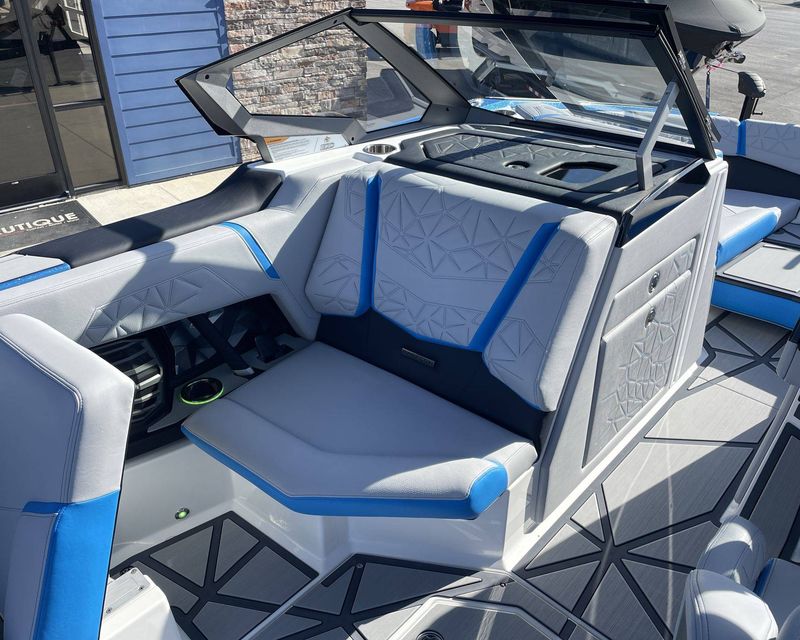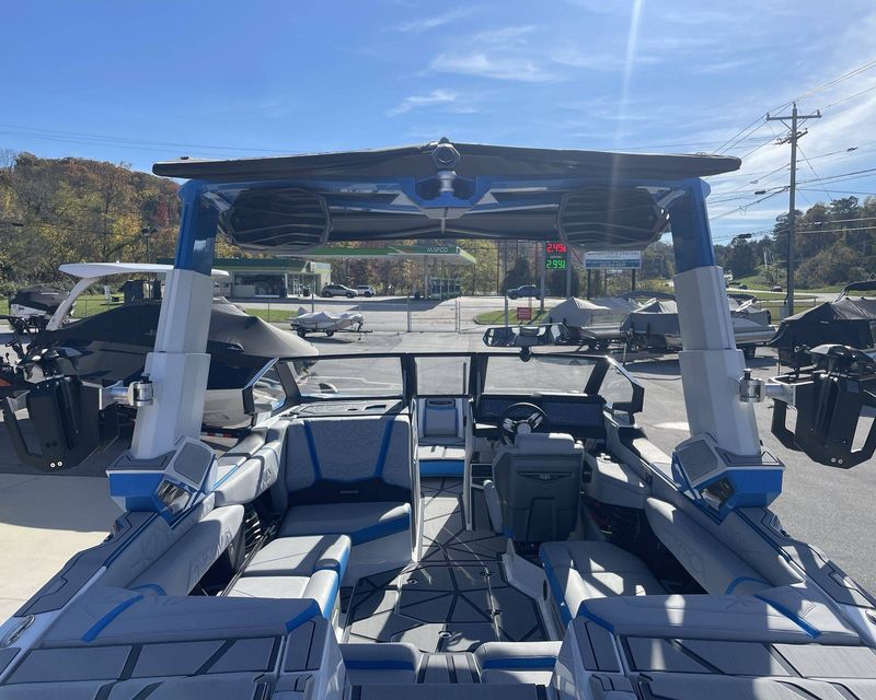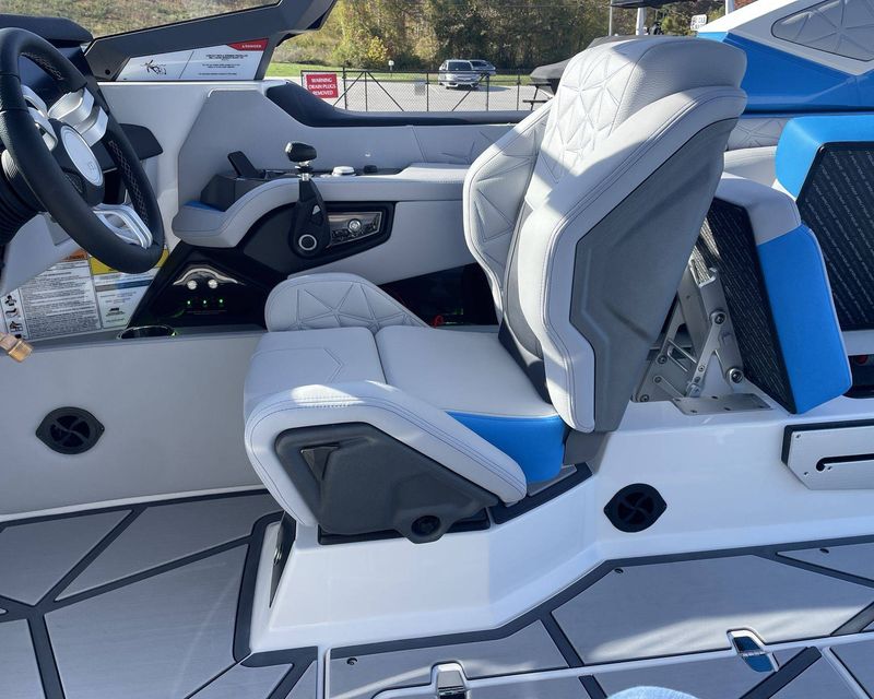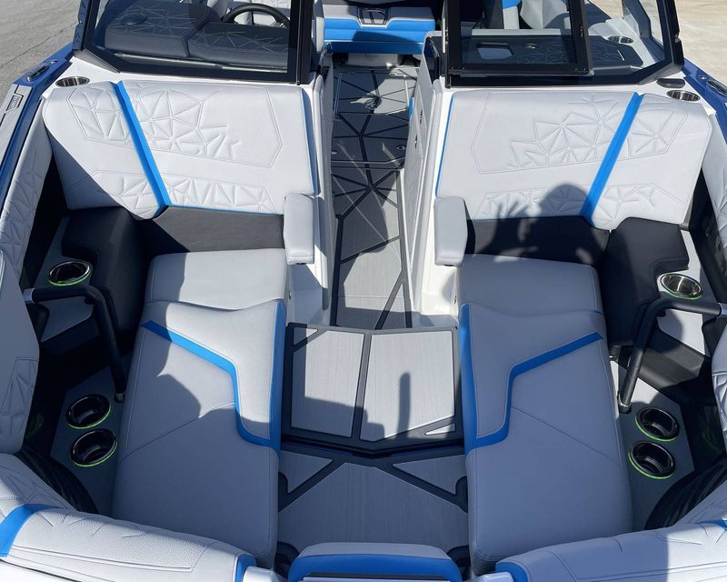 Styled with Black Chrome Finish badging - with Illusion Frost interiors and exteriors - the boat's color scheme features Mystic White, Masters Blue Metal Flake, and Jet Black, contributing to its commanding presence.