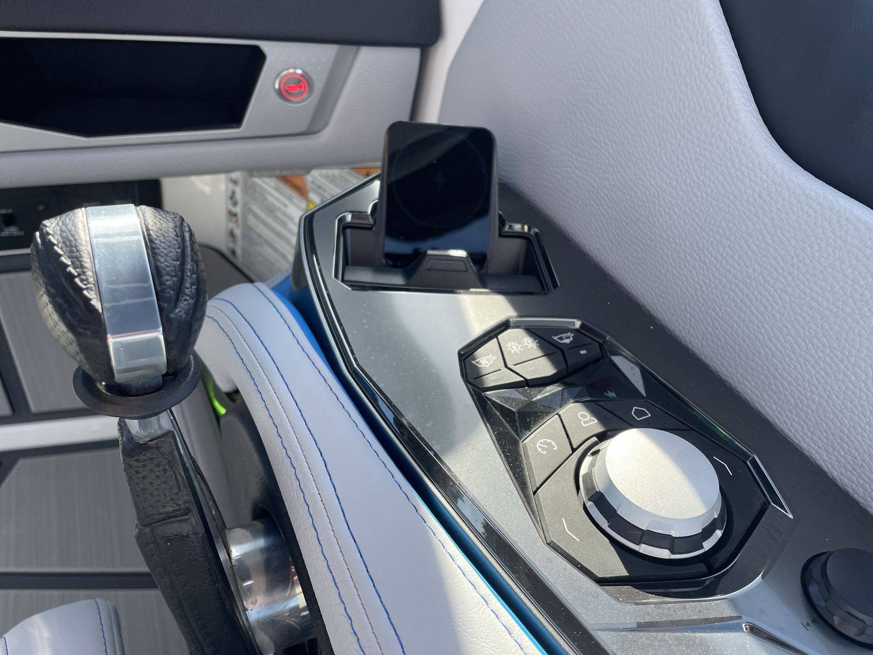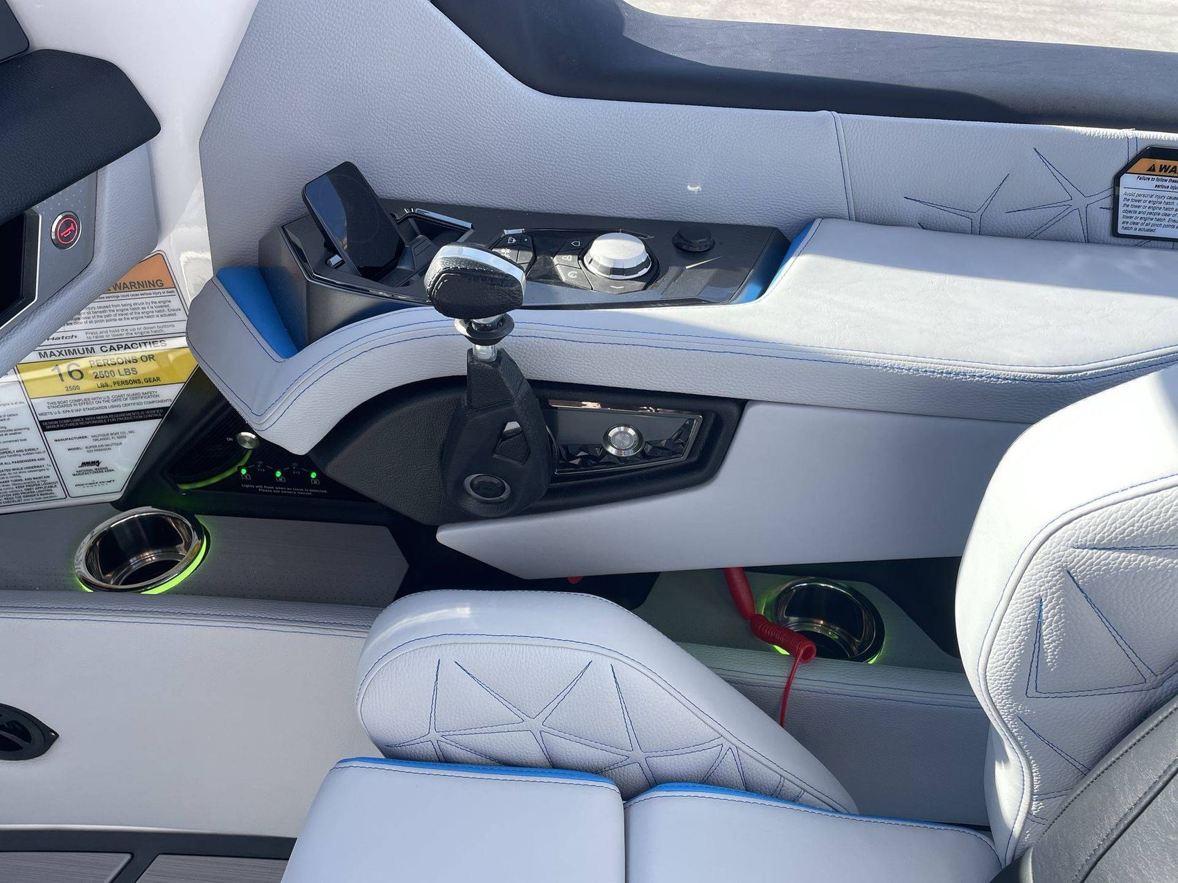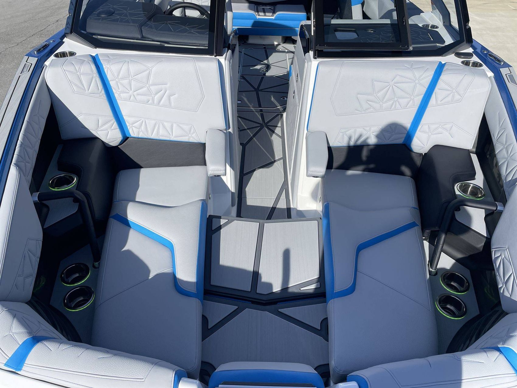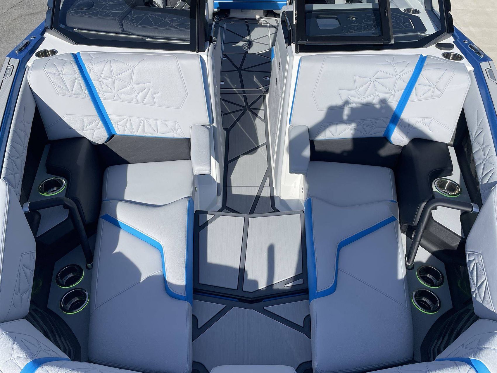 Styled with Black Chrome Finish badging - with Illusion Frost interiors and exteriors - the boat's color scheme features Mystic White, Masters Blue Metal Flake, and Jet Black, contributing to its commanding presence.