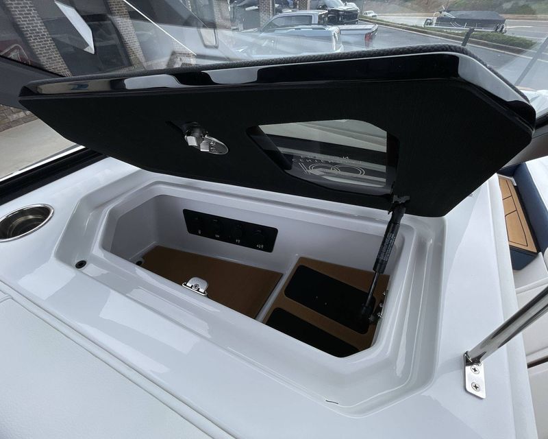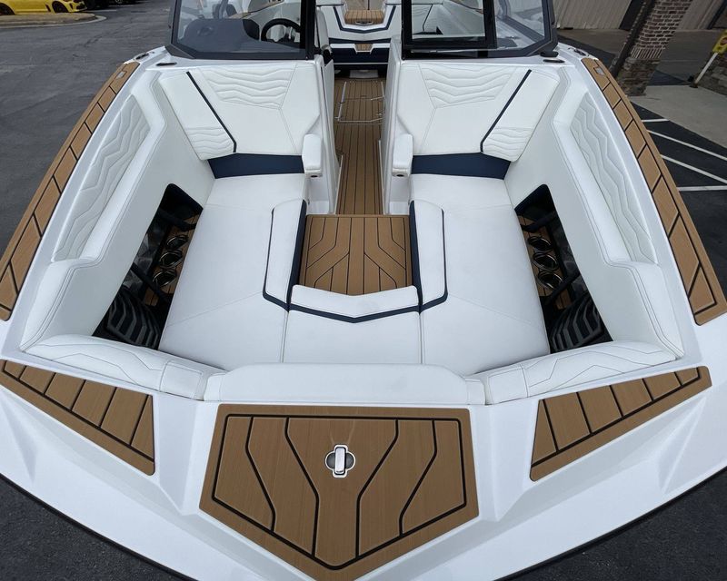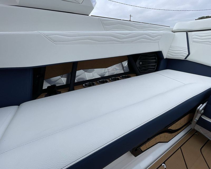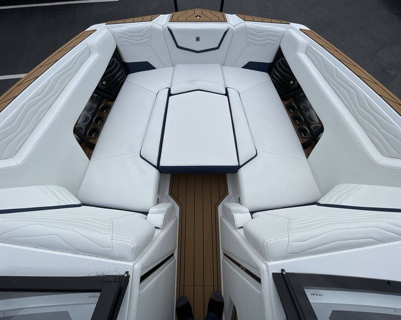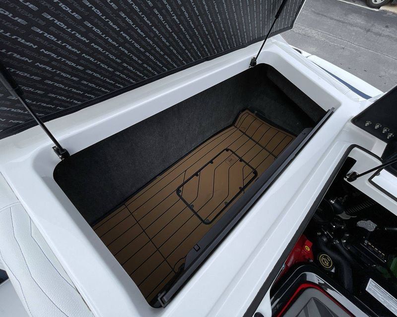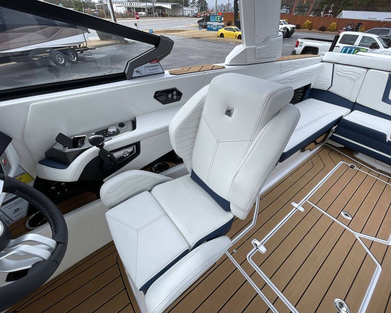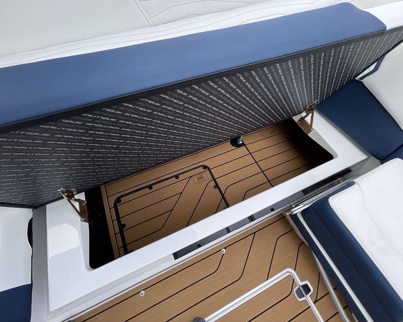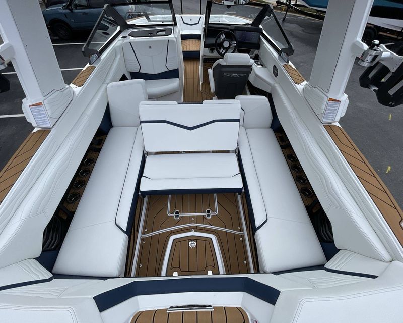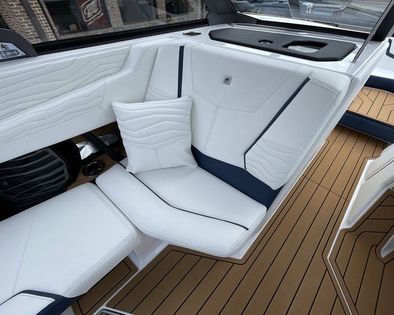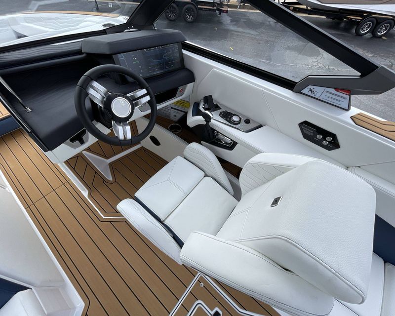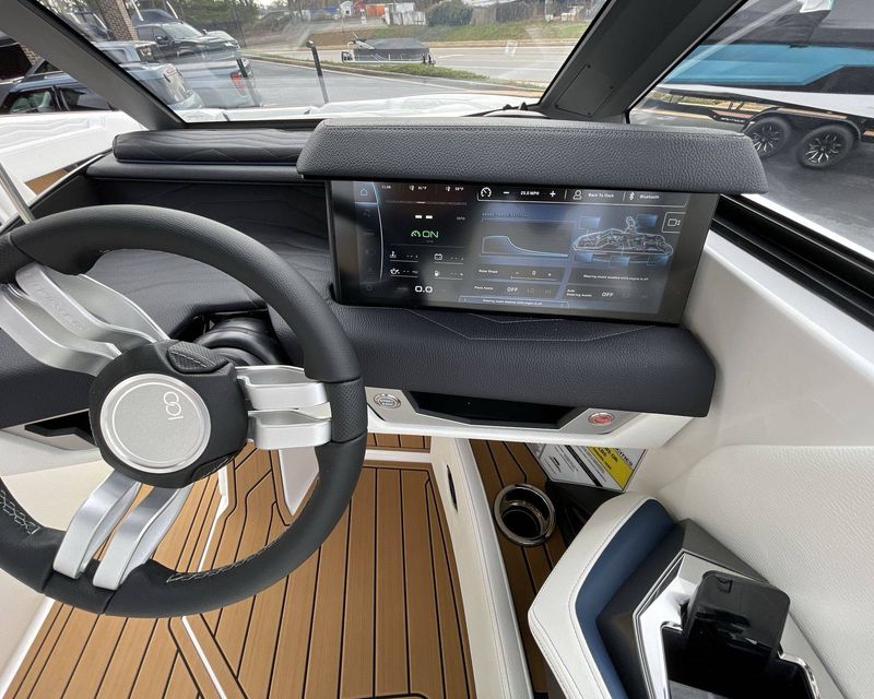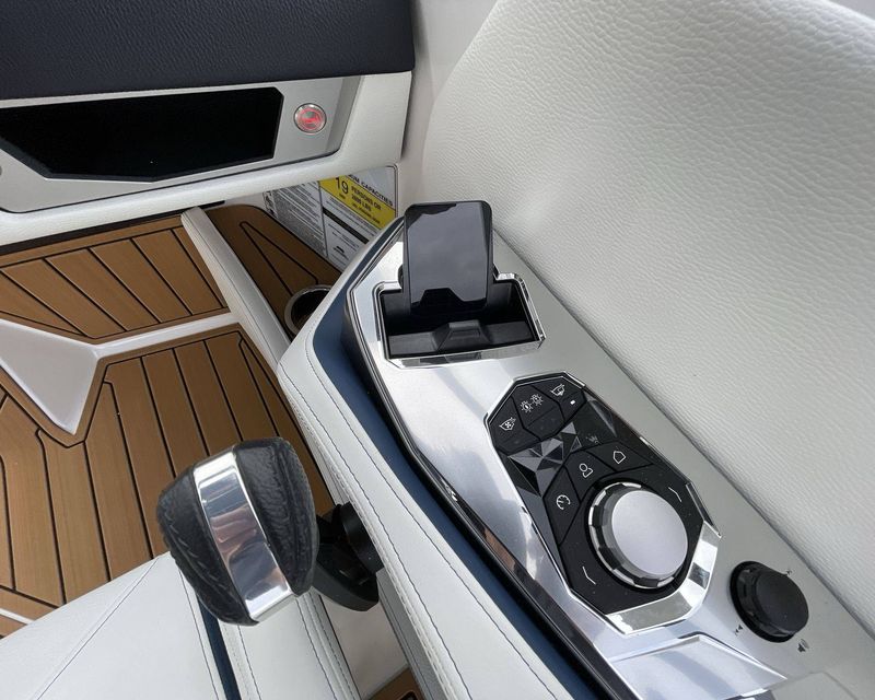 The boat hosts a range of sophisticated features such as LINC Panoray - Navionics Maps, Nautique Integrated Steering Assist, Phender Pro (6) - Boat Fender Attachment System, Wireless Chargers (Magnetic, Pockets, and Glovebox) and Transom Mounted Remote Control Stereo.