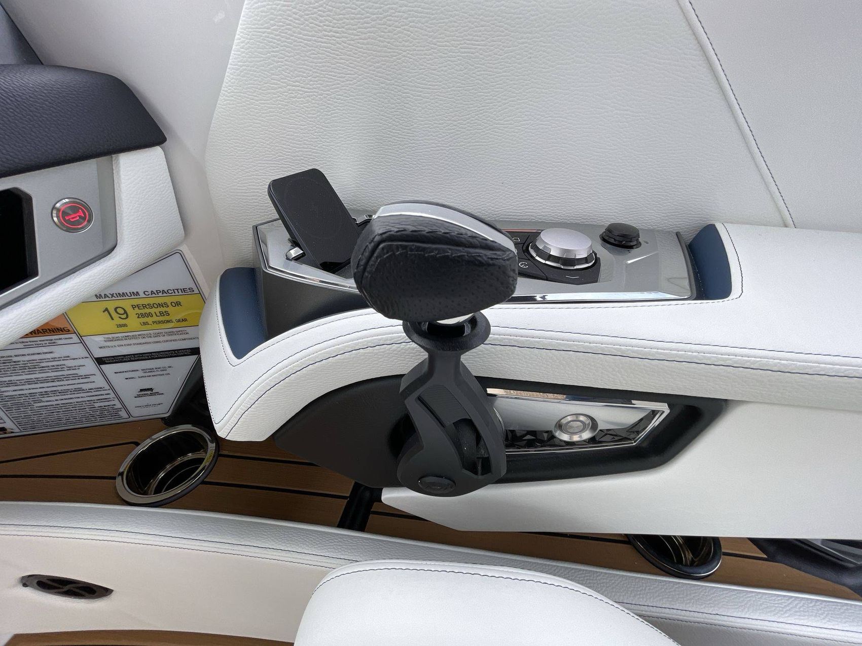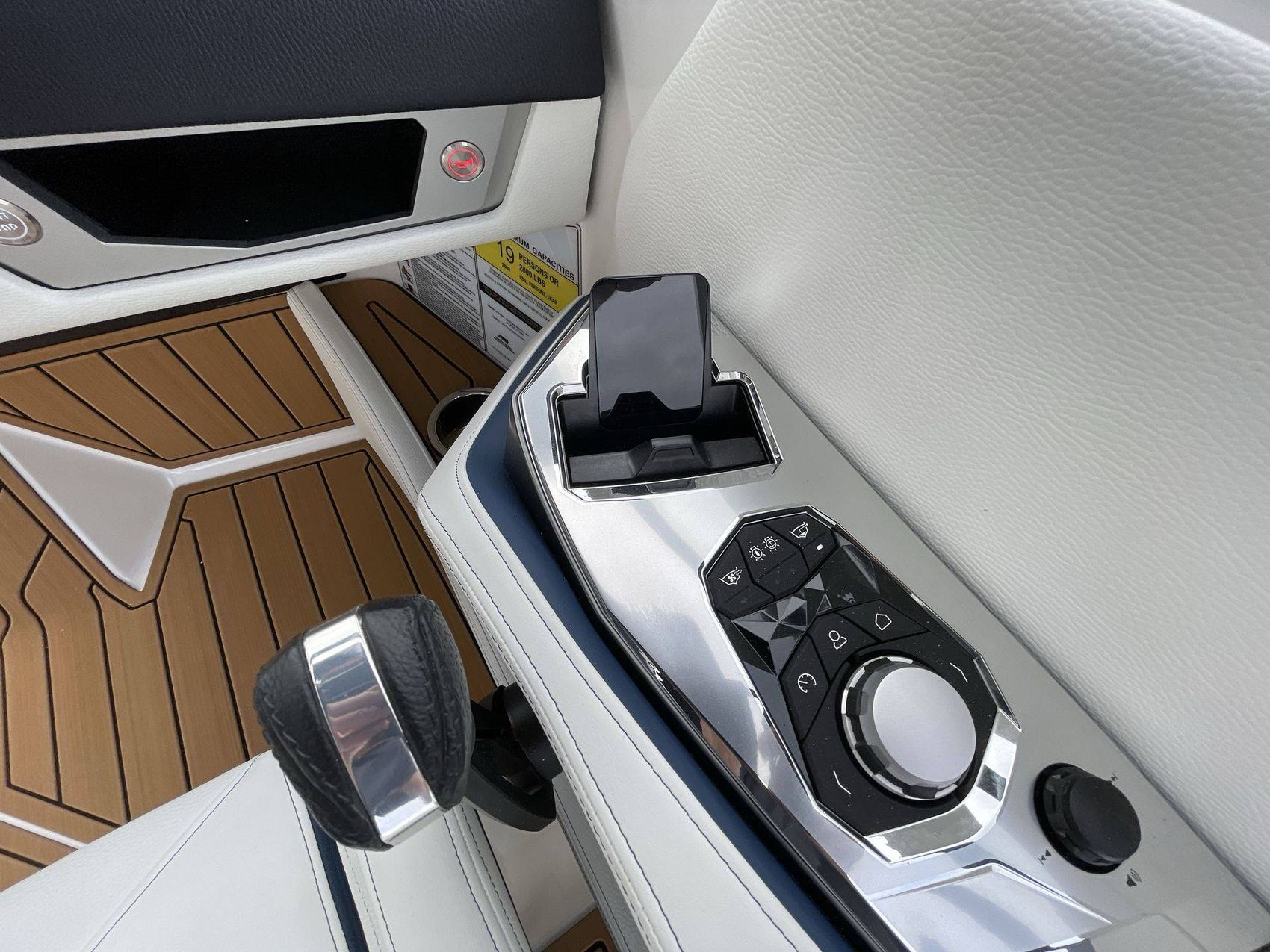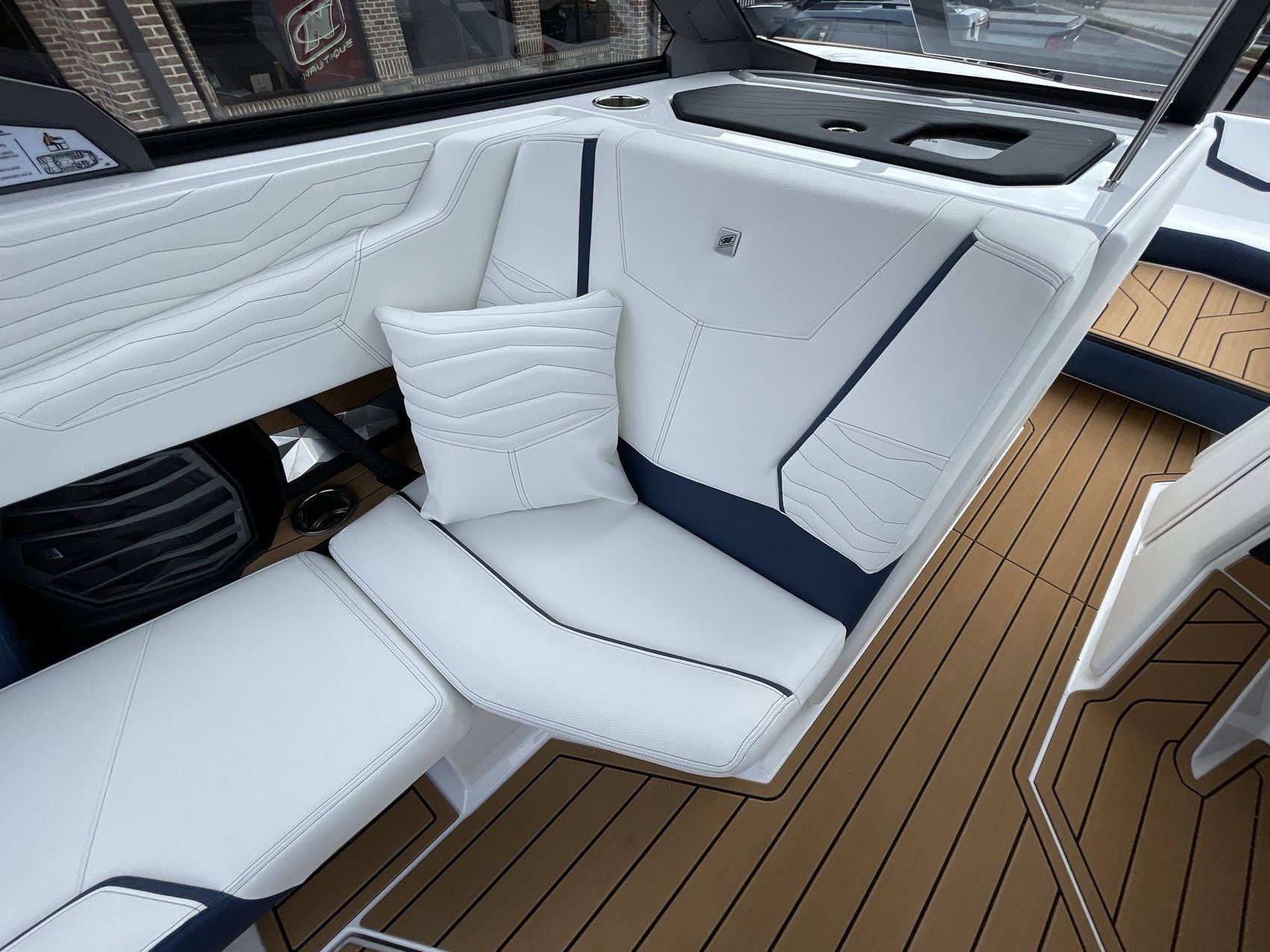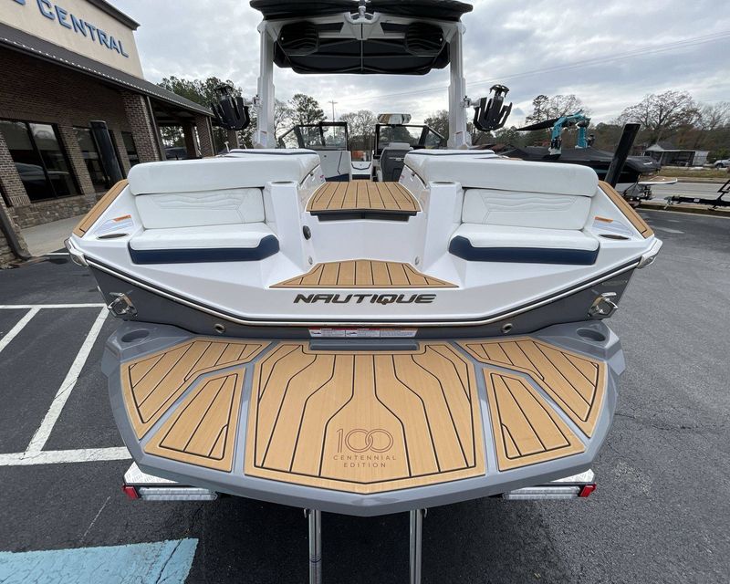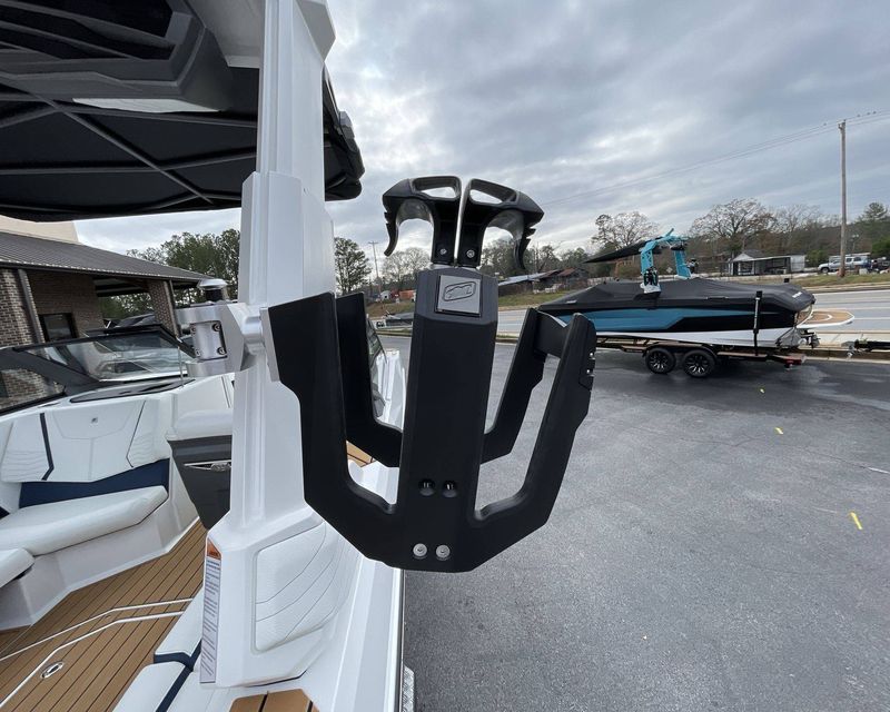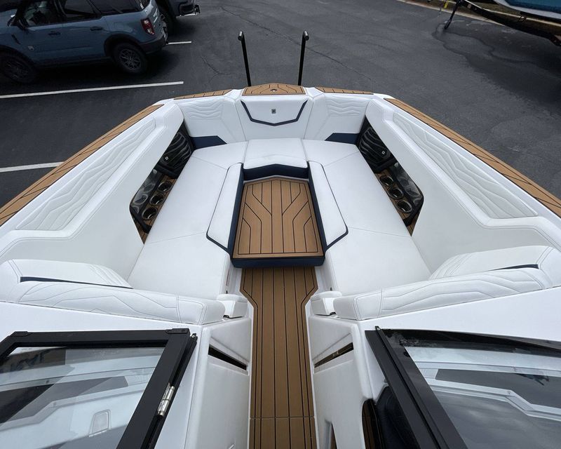 The boat hosts a range of sophisticated features such as LINC Panoray - Navionics Maps, Nautique Integrated Steering Assist, Phender Pro (6) - Boat Fender Attachment System, Wireless Chargers (Magnetic, Pockets, and Glovebox) and Transom Mounted Remote Control Stereo.
