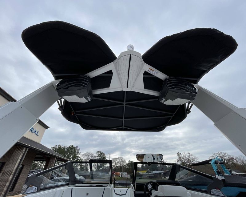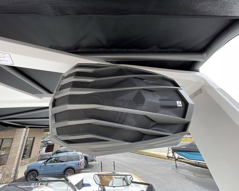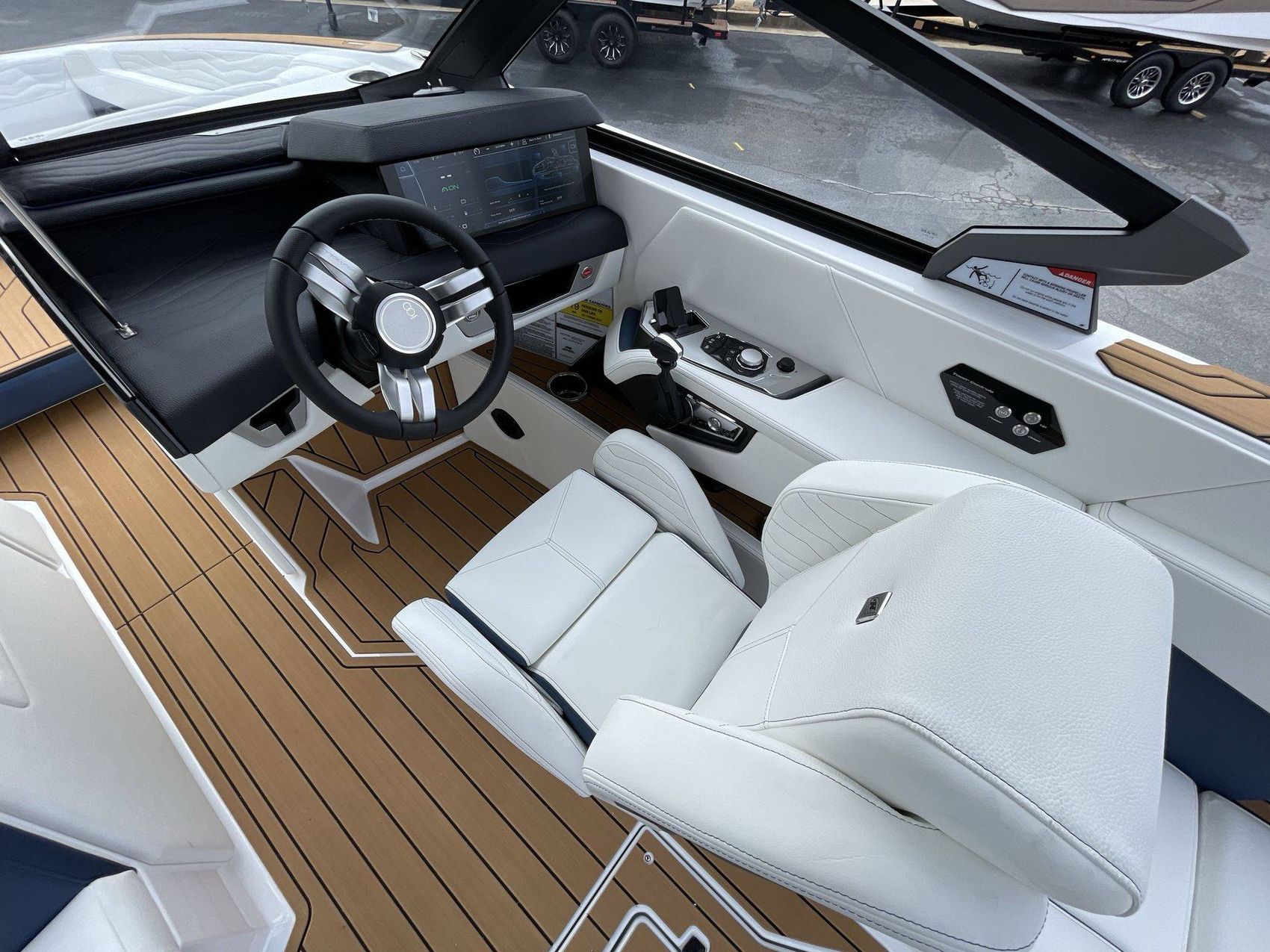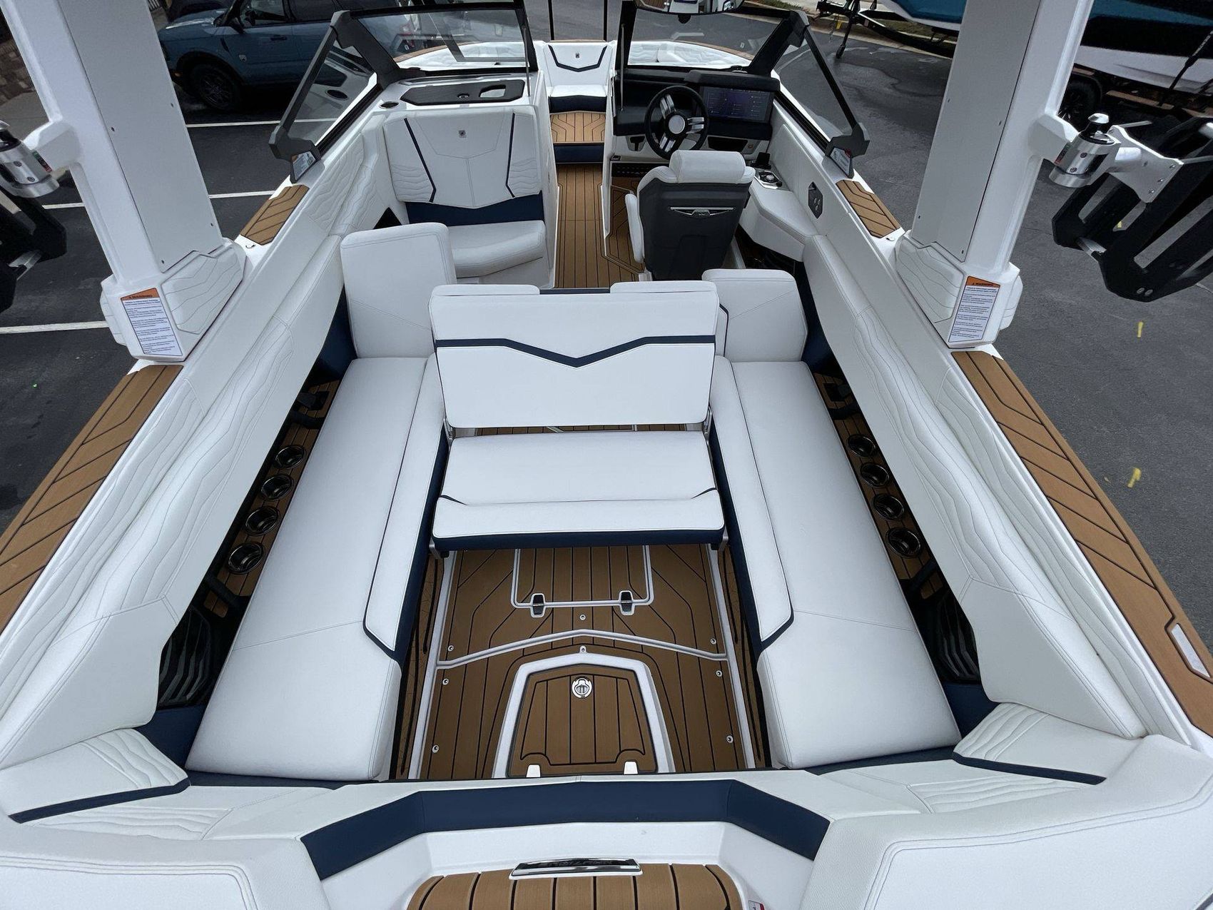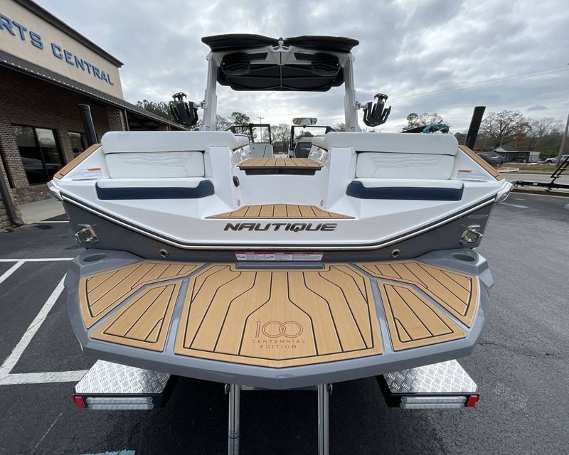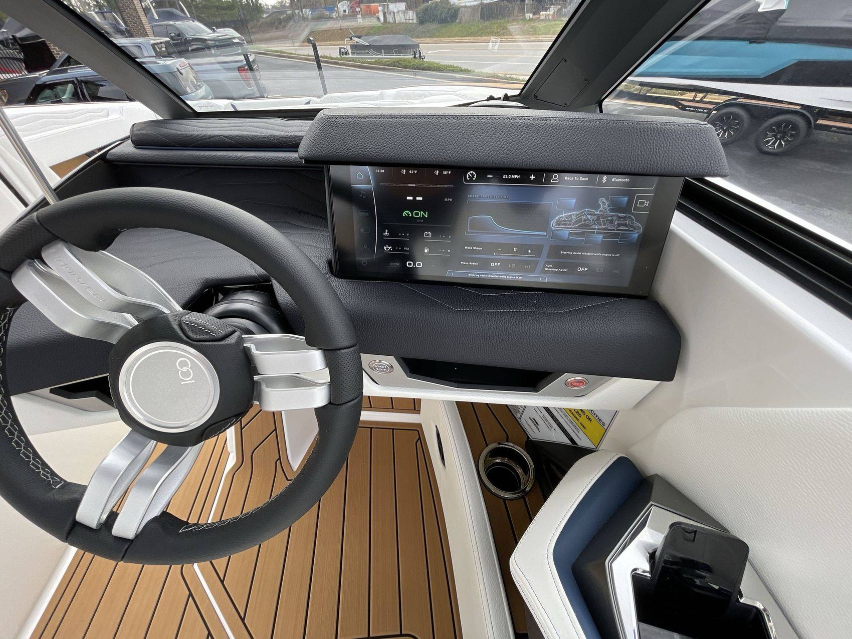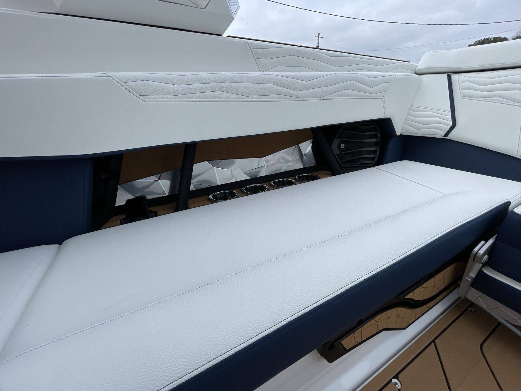 The boat hosts a range of sophisticated features such as LINC Panoray - Navionics Maps, Nautique Integrated Steering Assist, Phender Pro (6) - Boat Fender Attachment System, Wireless Chargers (Magnetic, Pockets, and Glovebox) and Transom Mounted Remote Control Stereo.