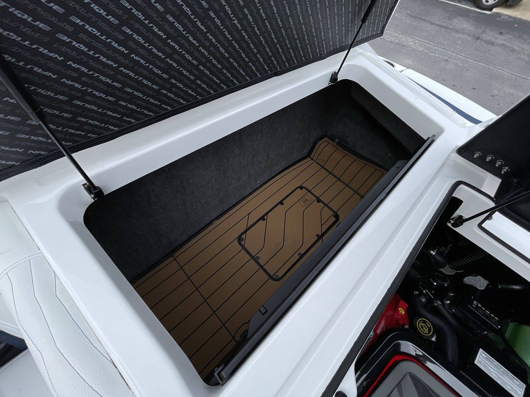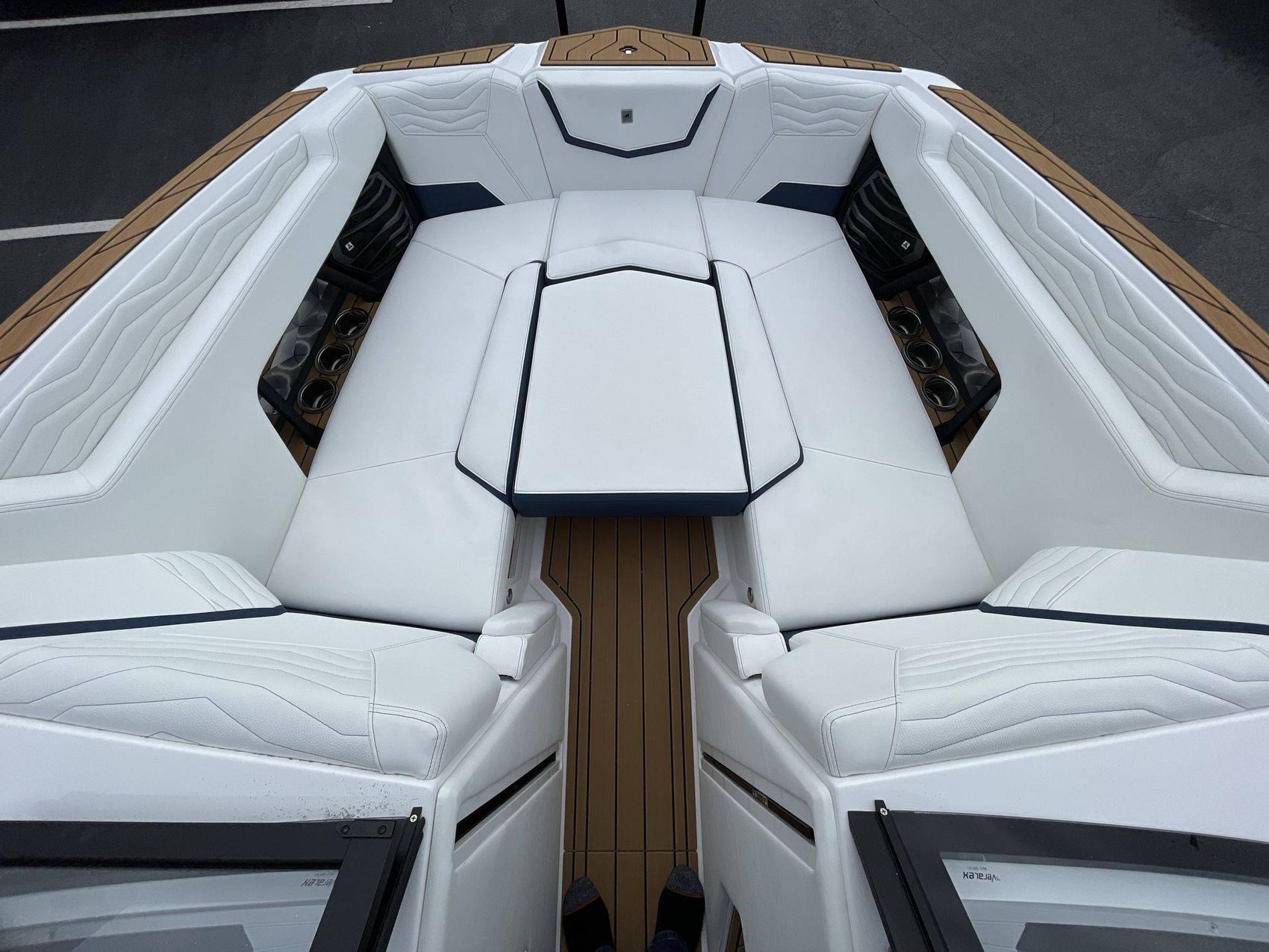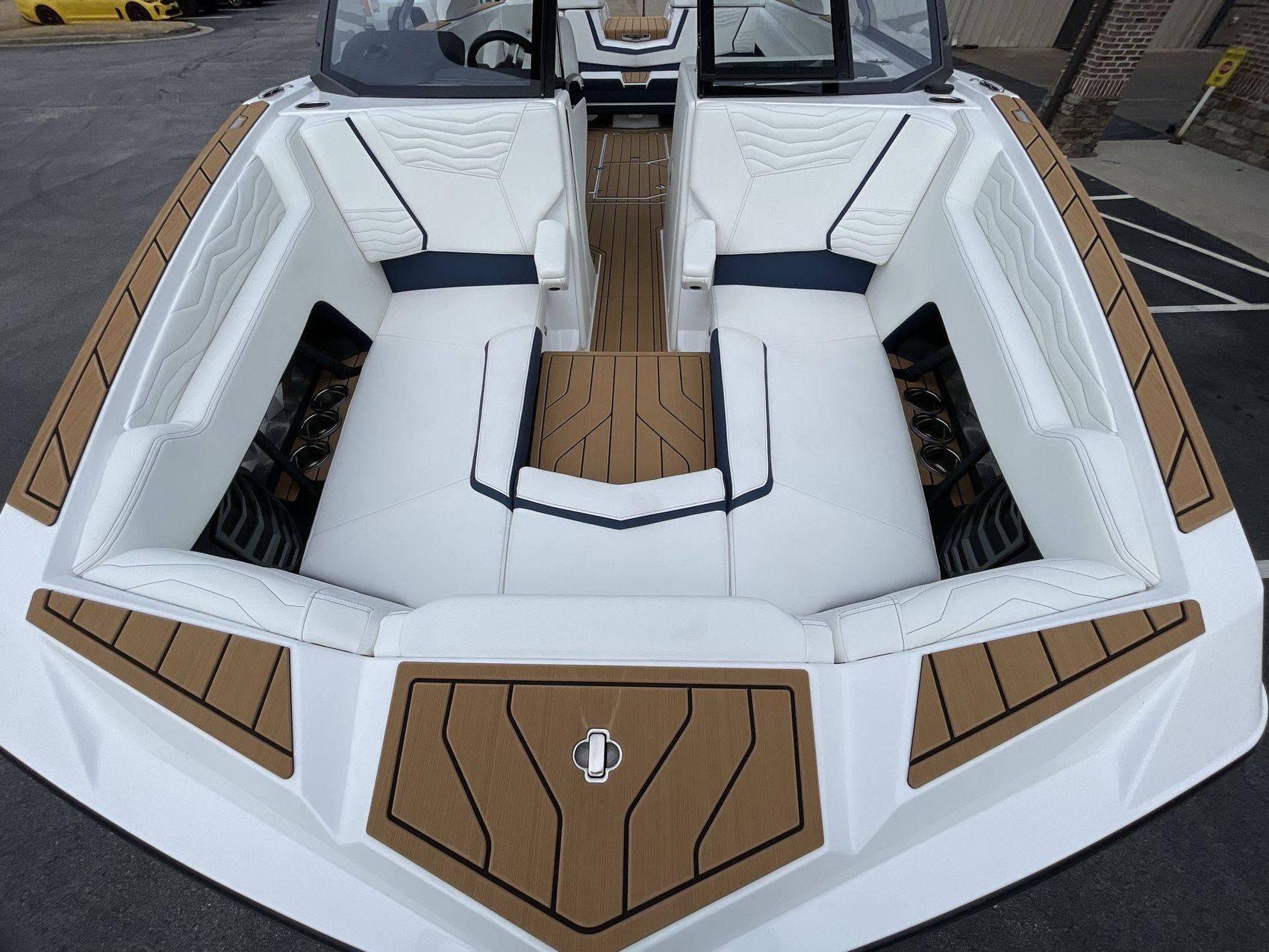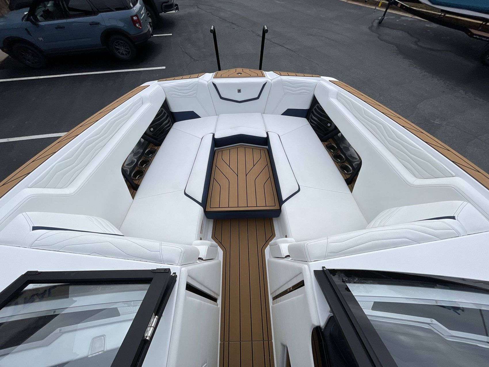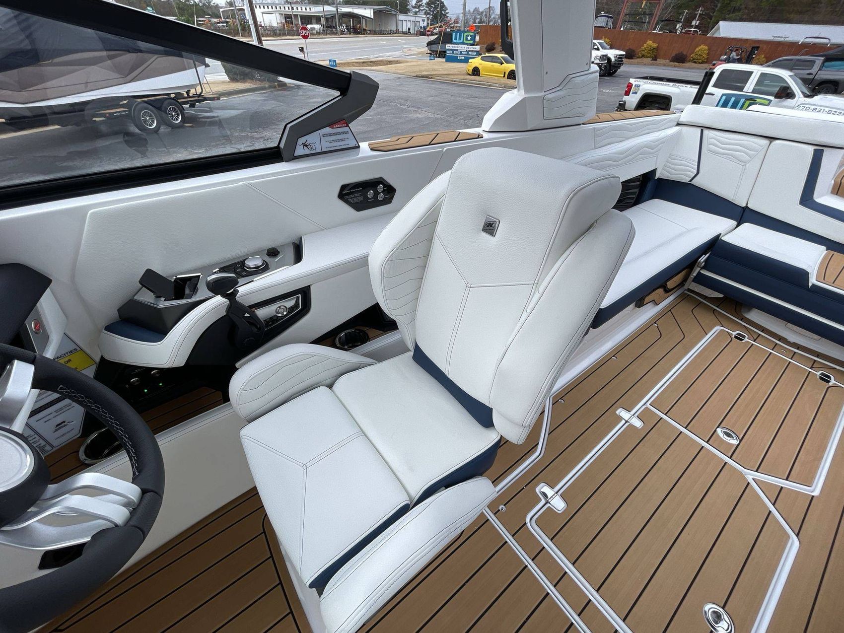 The boat hosts a range of sophisticated features such as LINC Panoray - Navionics Maps, Nautique Integrated Steering Assist, Phender Pro (6) - Boat Fender Attachment System, Wireless Chargers (Magnetic, Pockets, and Glovebox) and Transom Mounted Remote Control Stereo.
