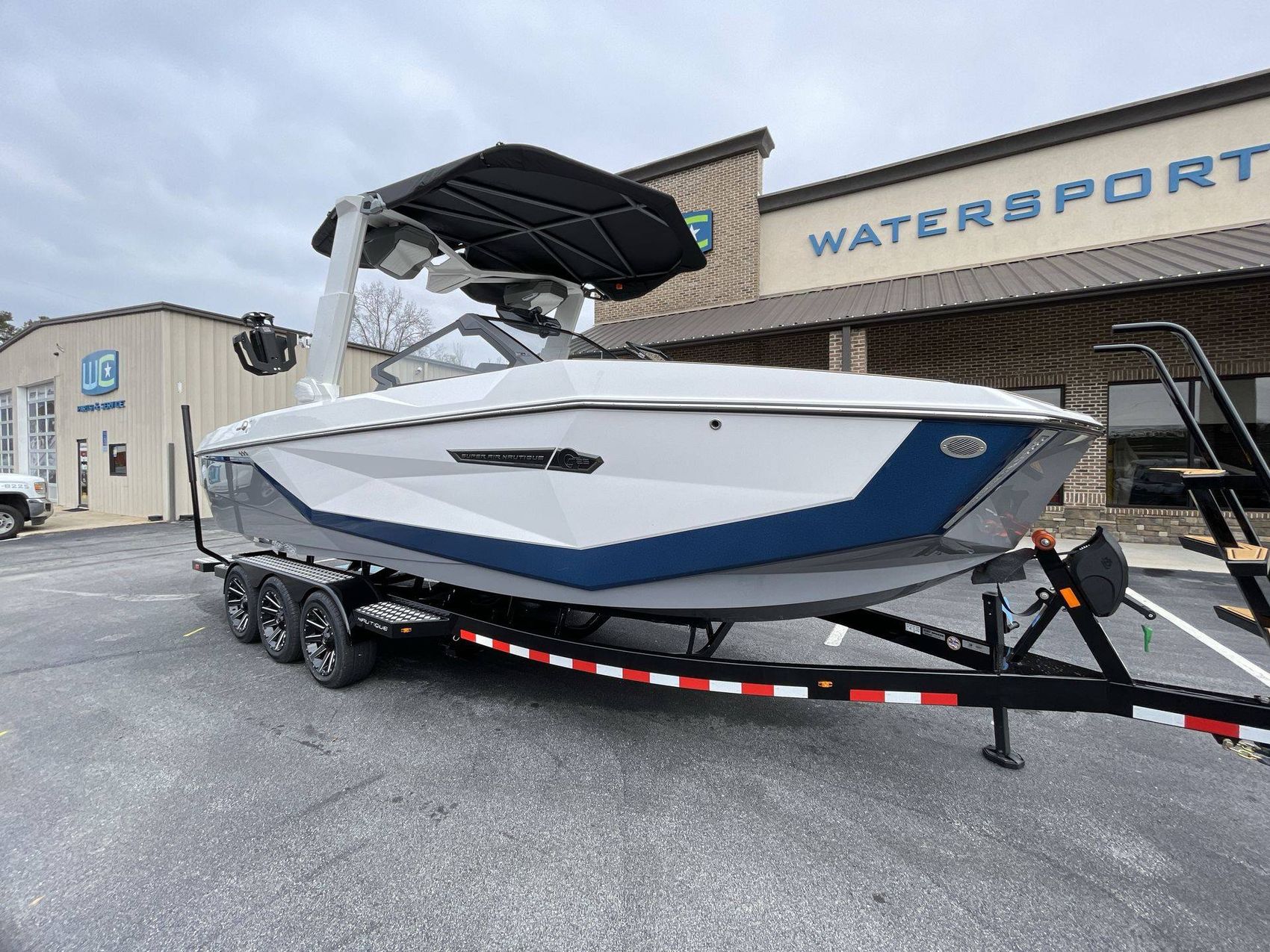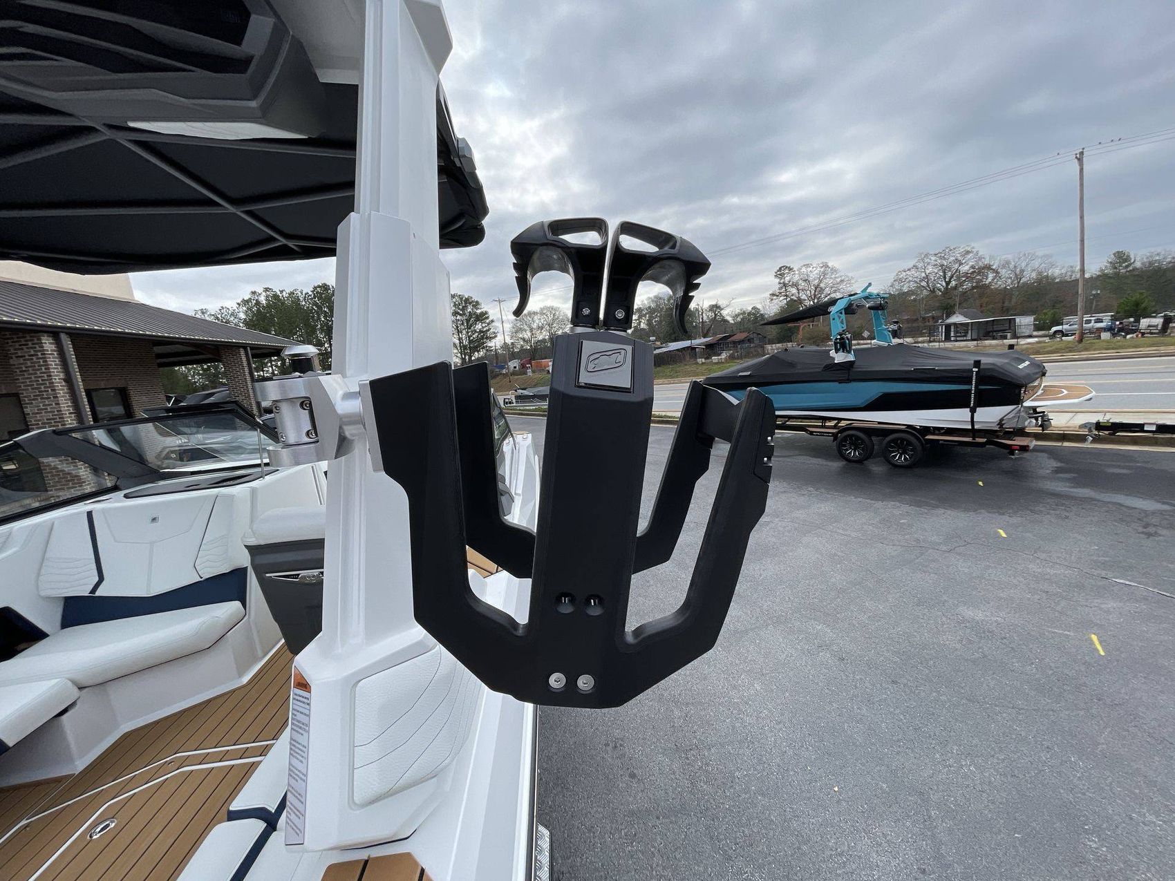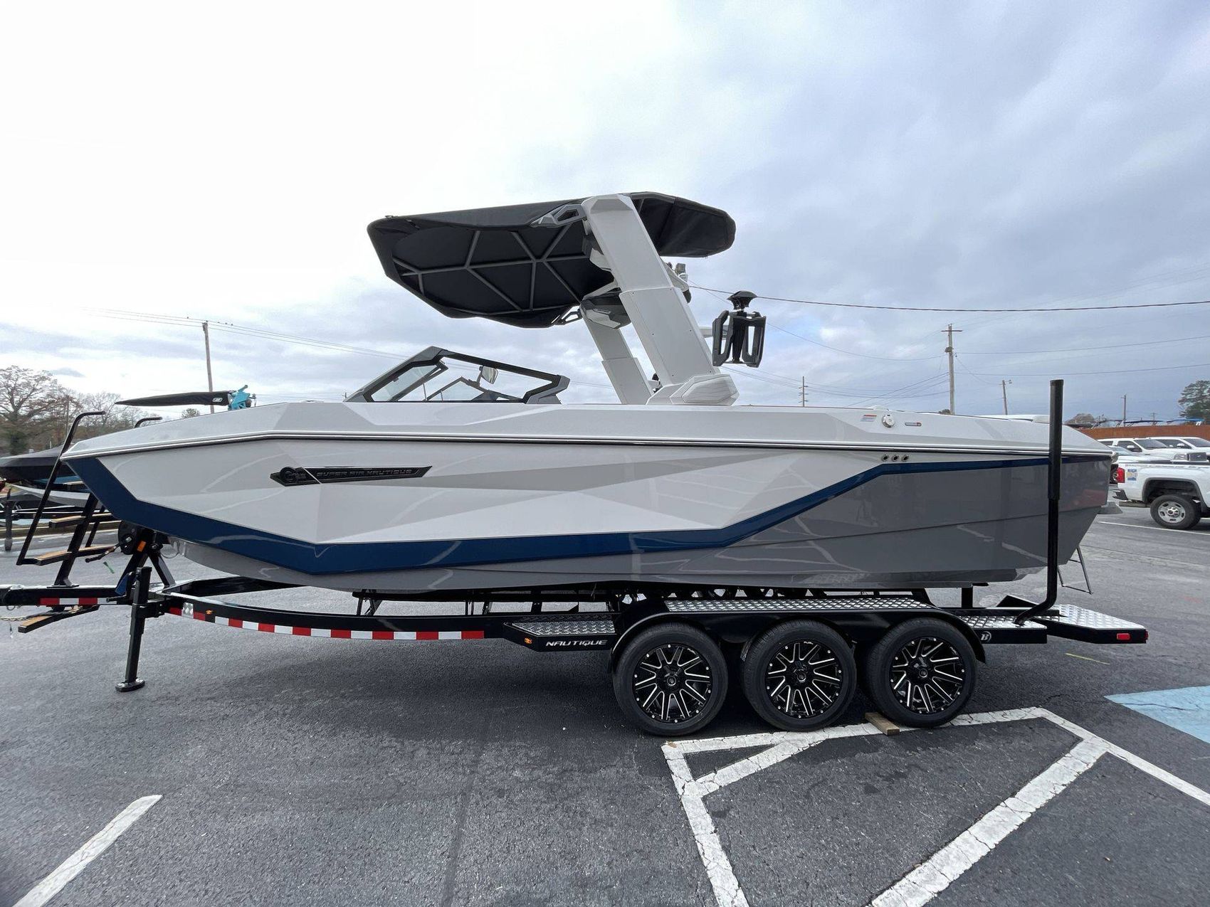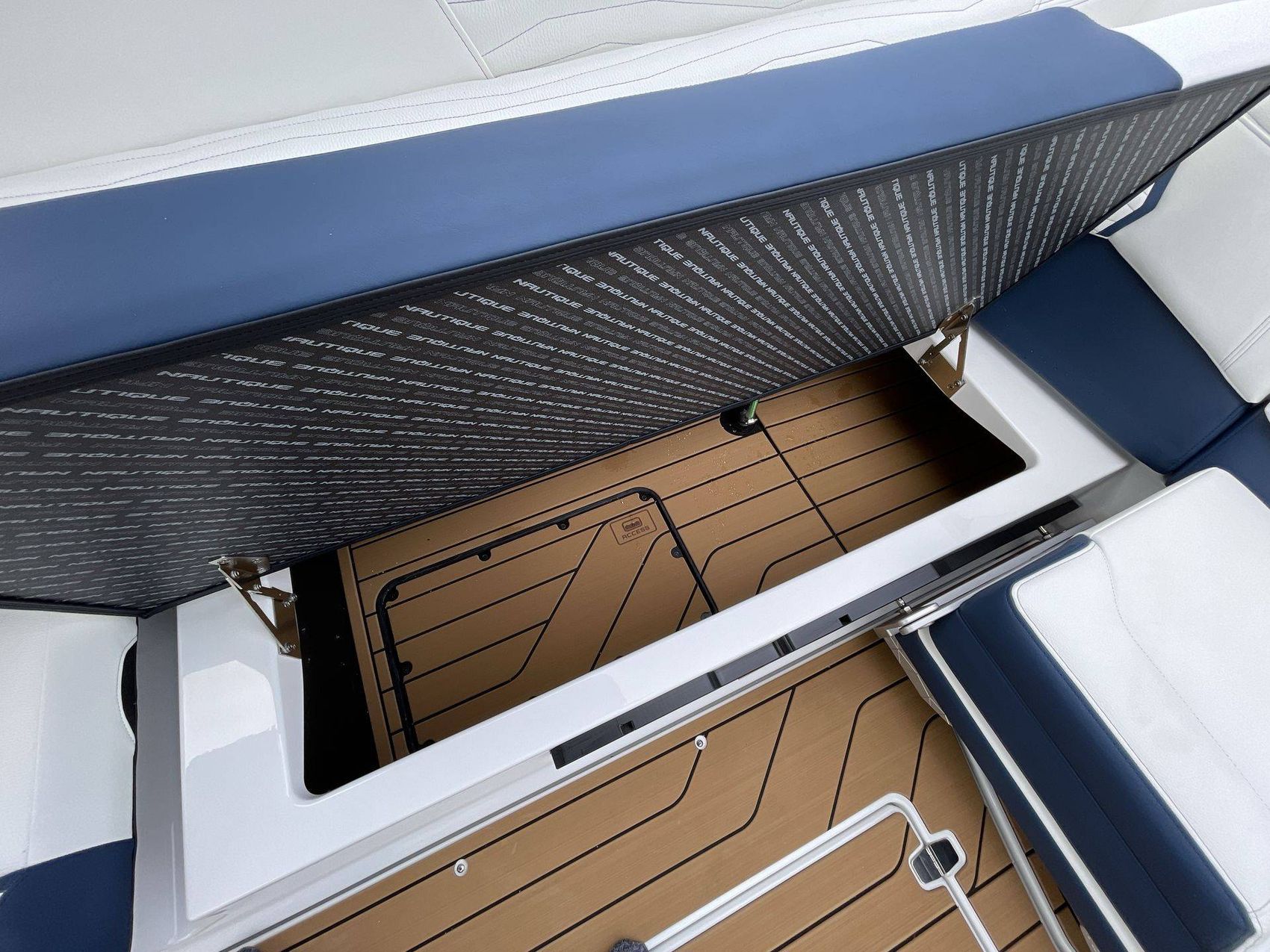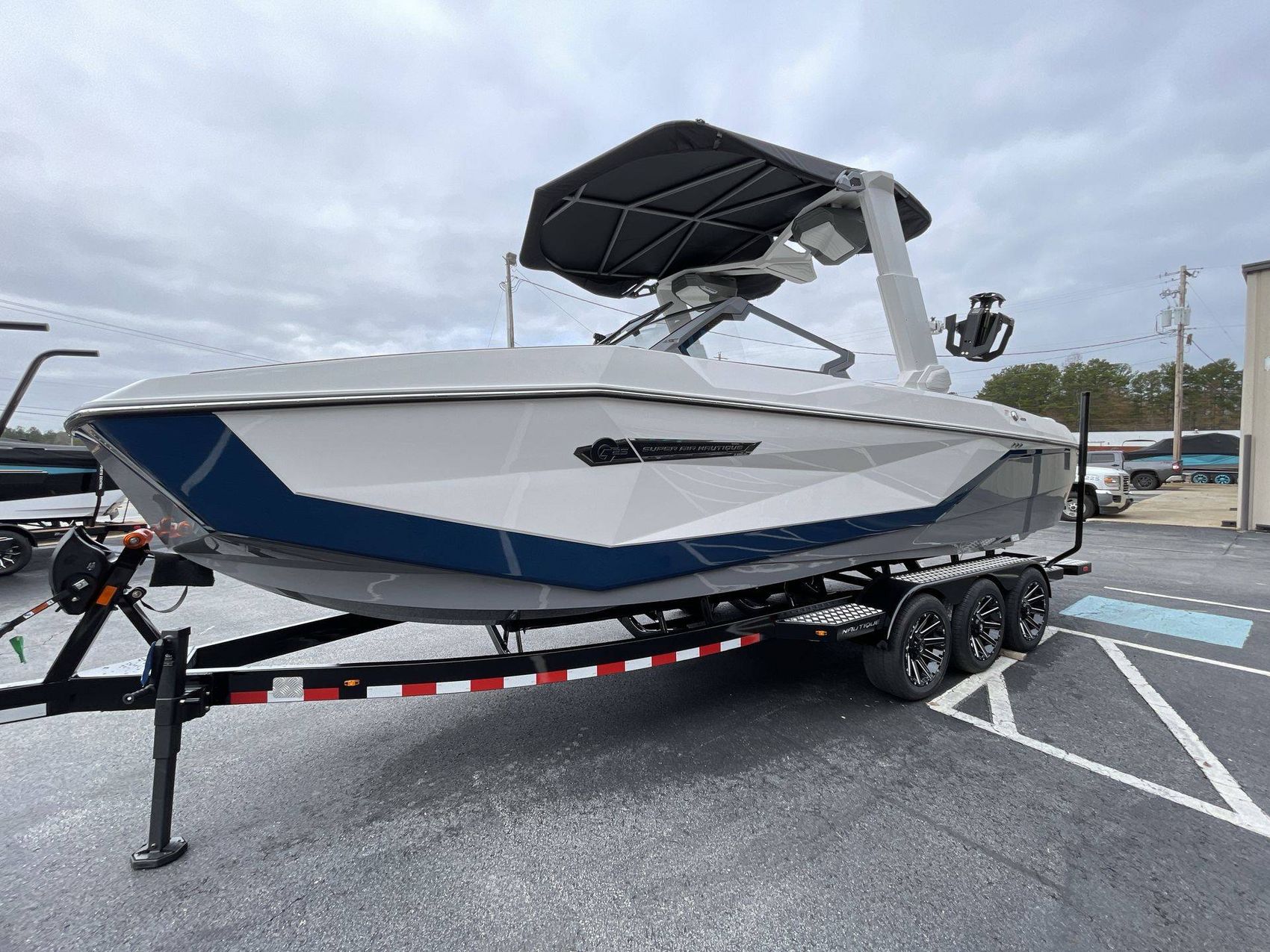 The boat hosts a range of sophisticated features such as LINC Panoray - Navionics Maps, Nautique Integrated Steering Assist, Phender Pro (6) - Boat Fender Attachment System, Wireless Chargers (Magnetic, Pockets, and Glovebox) and Transom Mounted Remote Control Stereo.