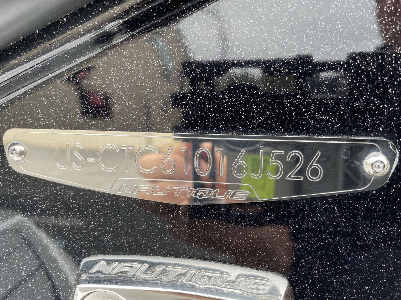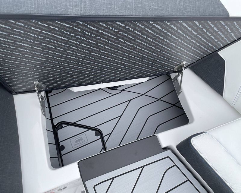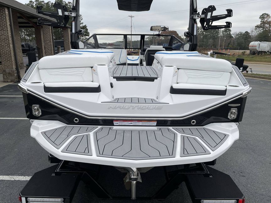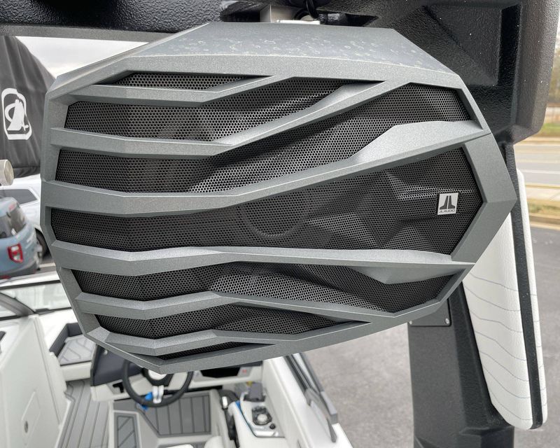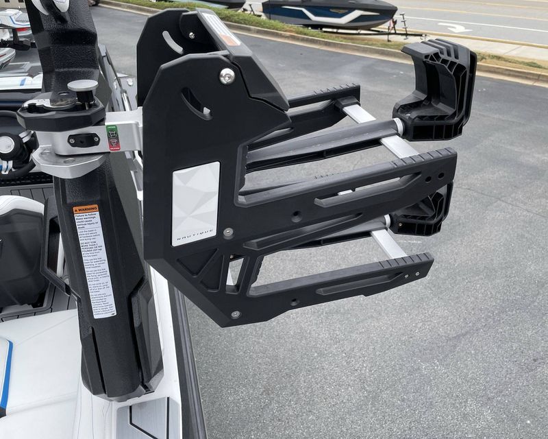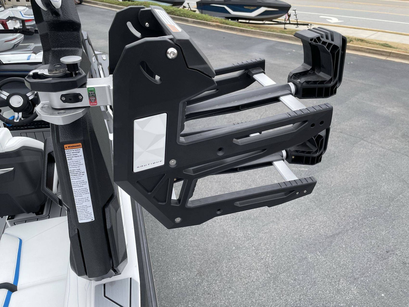 This boat comes equipped with numerous tower accessories including a Tower Mounted Tri-Fold Bimini with Surf Pockets, offering ample space for storing gear. Other features include an Actuated Flight Control Tower, Nautique Strapless Board Racks for easy accessibility, and a Tower Prep Kit JL Audio M Series Studio (Pre-Wired 8 Channel Amp) for an enhanced audio experience.