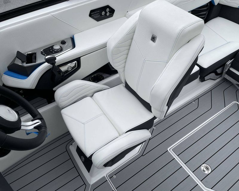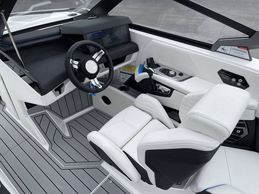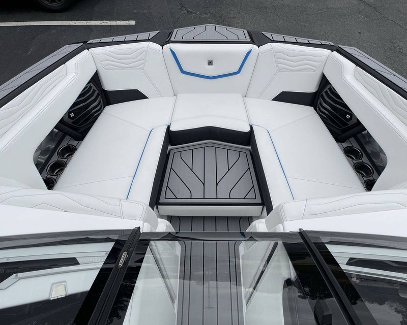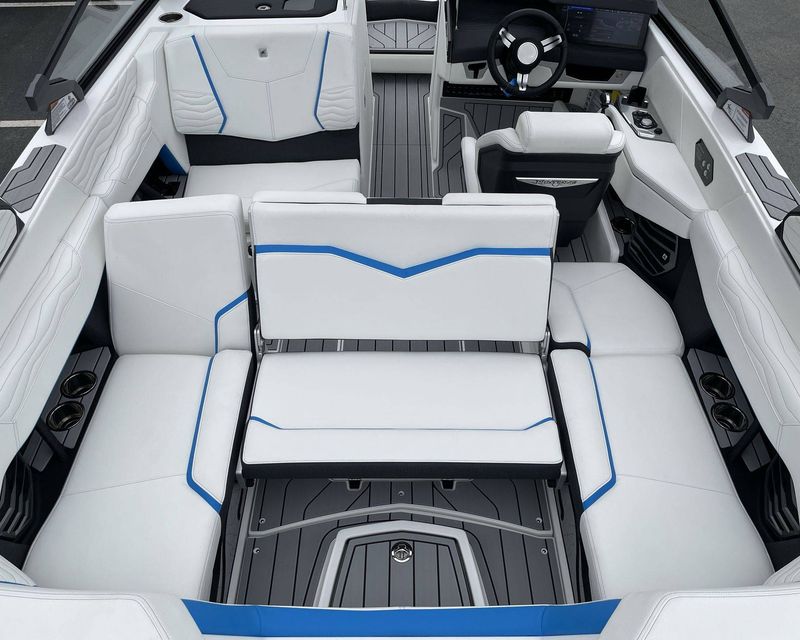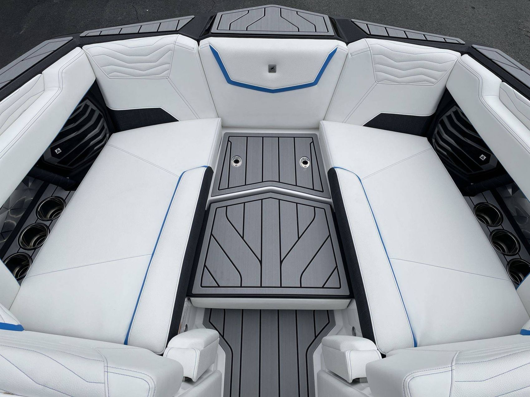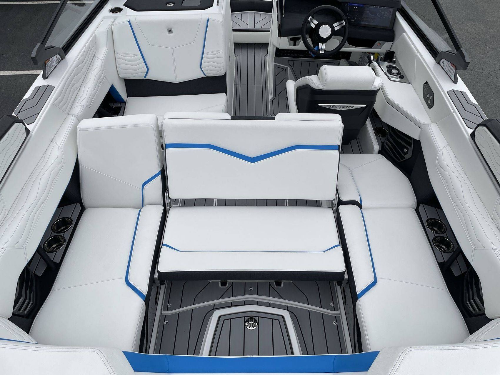 The design of the boat is completed with a variety of color options such as Mystic White for the interior deck, Jet Black Metal Flake as the main stripe color, and Masters Blue as the main accent stripe color. The vessel is finished off with White Chrome with Illusion Frost for Chromax Badging and Bright Chrome Finish with Illusion Frost for the Interior Chromax Badging.