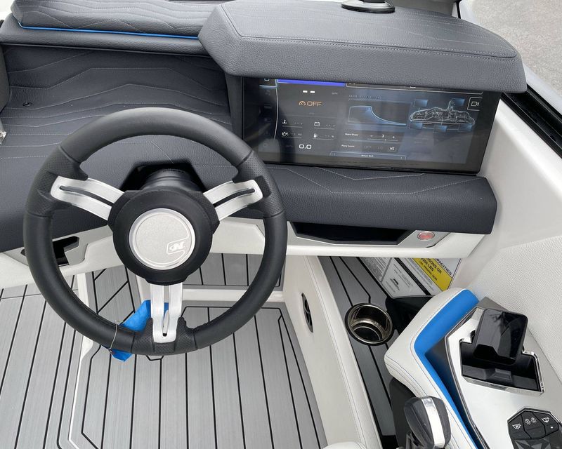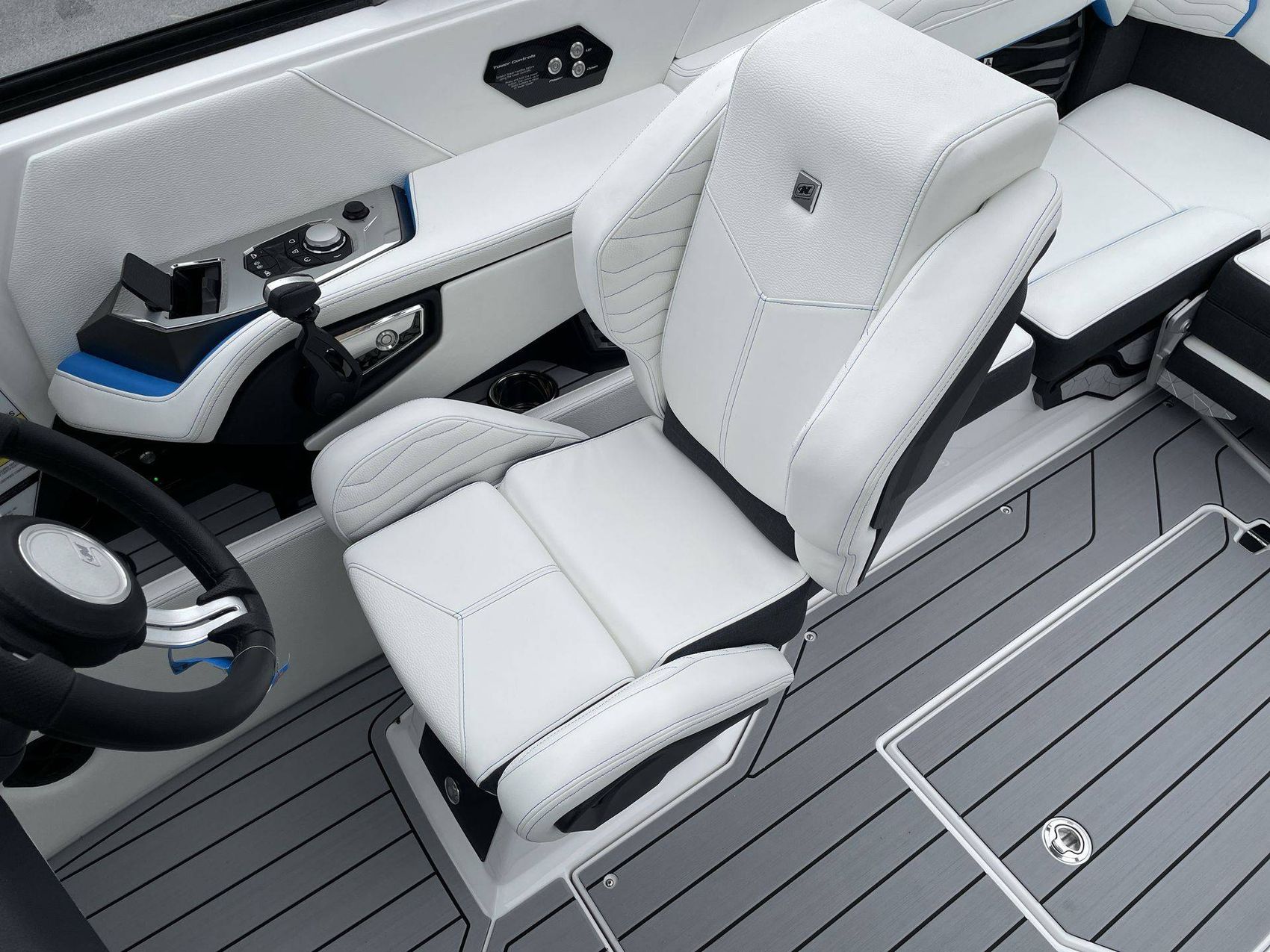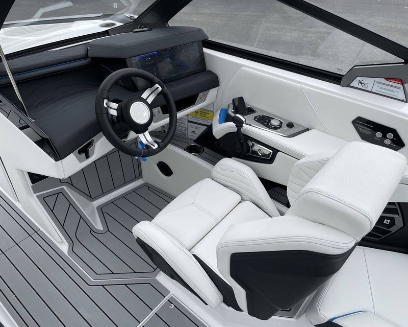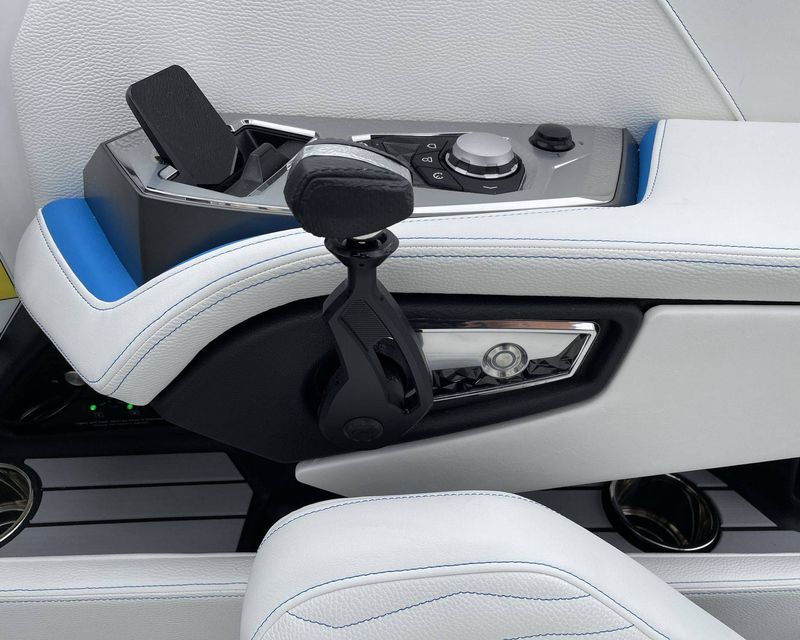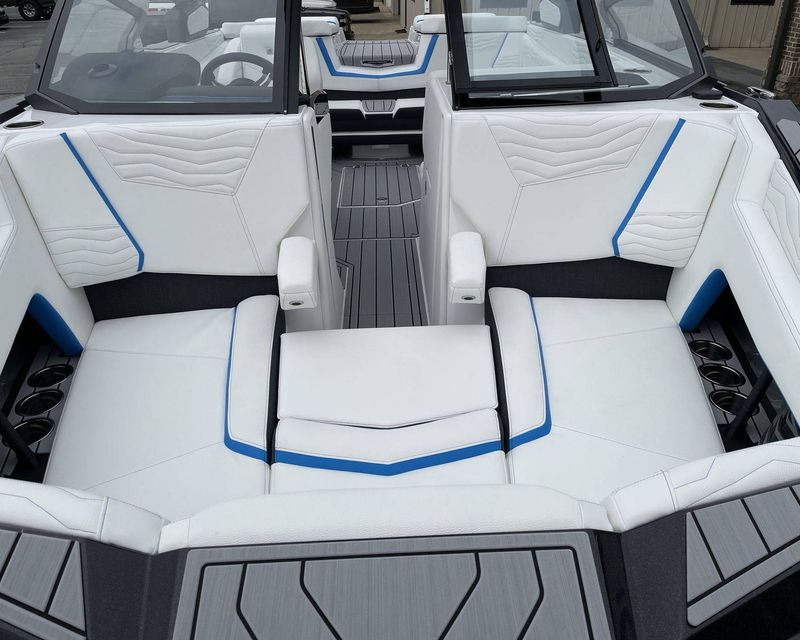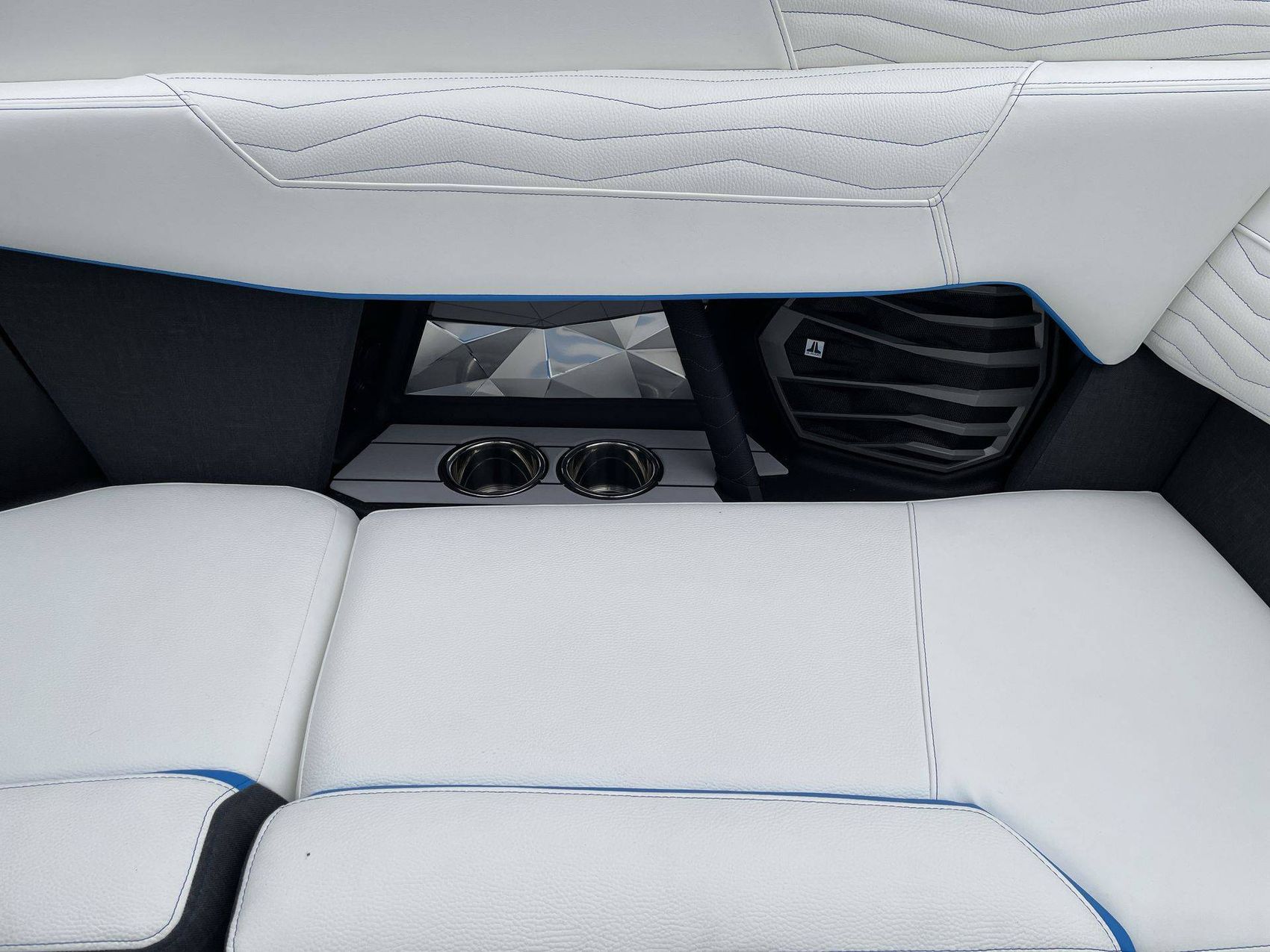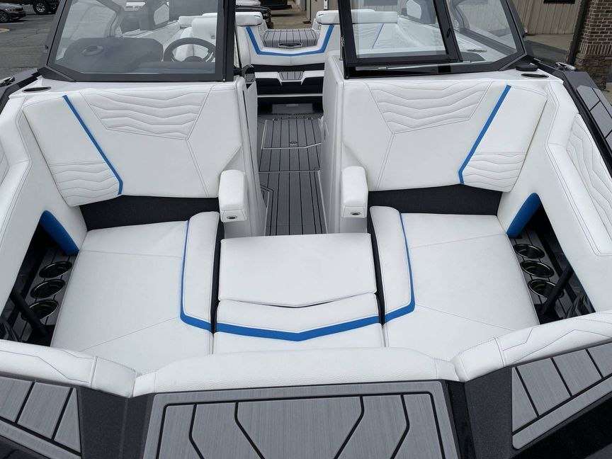 The design of the boat is completed with a variety of color options such as Mystic White for the interior deck, Jet Black Metal Flake as the main stripe color, and Masters Blue as the main accent stripe color. The vessel is finished off with White Chrome with Illusion Frost for Chromax Badging and Bright Chrome Finish with Illusion Frost for the Interior Chromax Badging.