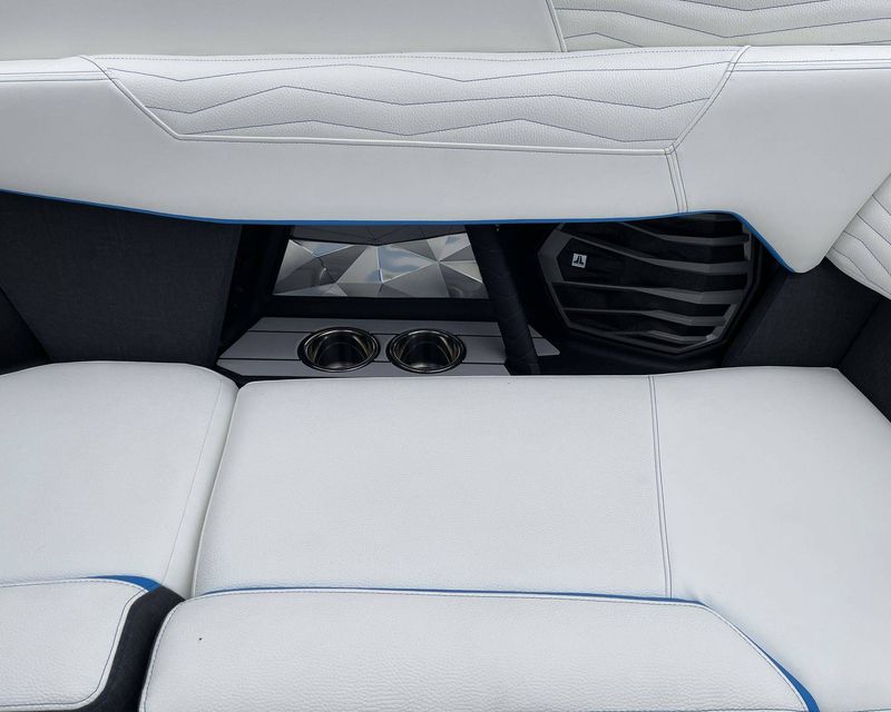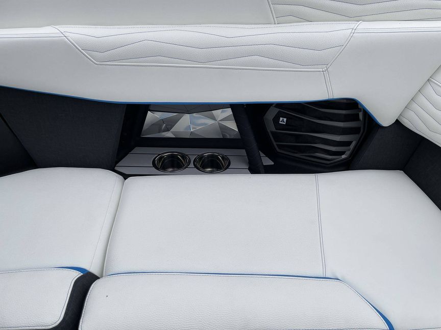 The Super Air Nautique G21 offers comfortable seating, featuring Retractable Bow Armrests and a Filler Cushion for the Bow seating area. The boat's stereo system comes fitted with a JL Audio M6 Series Studio Elite with Wavefront, complete with a Transom Mounted Remote Control.