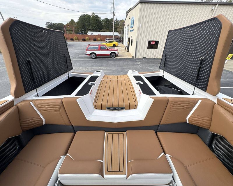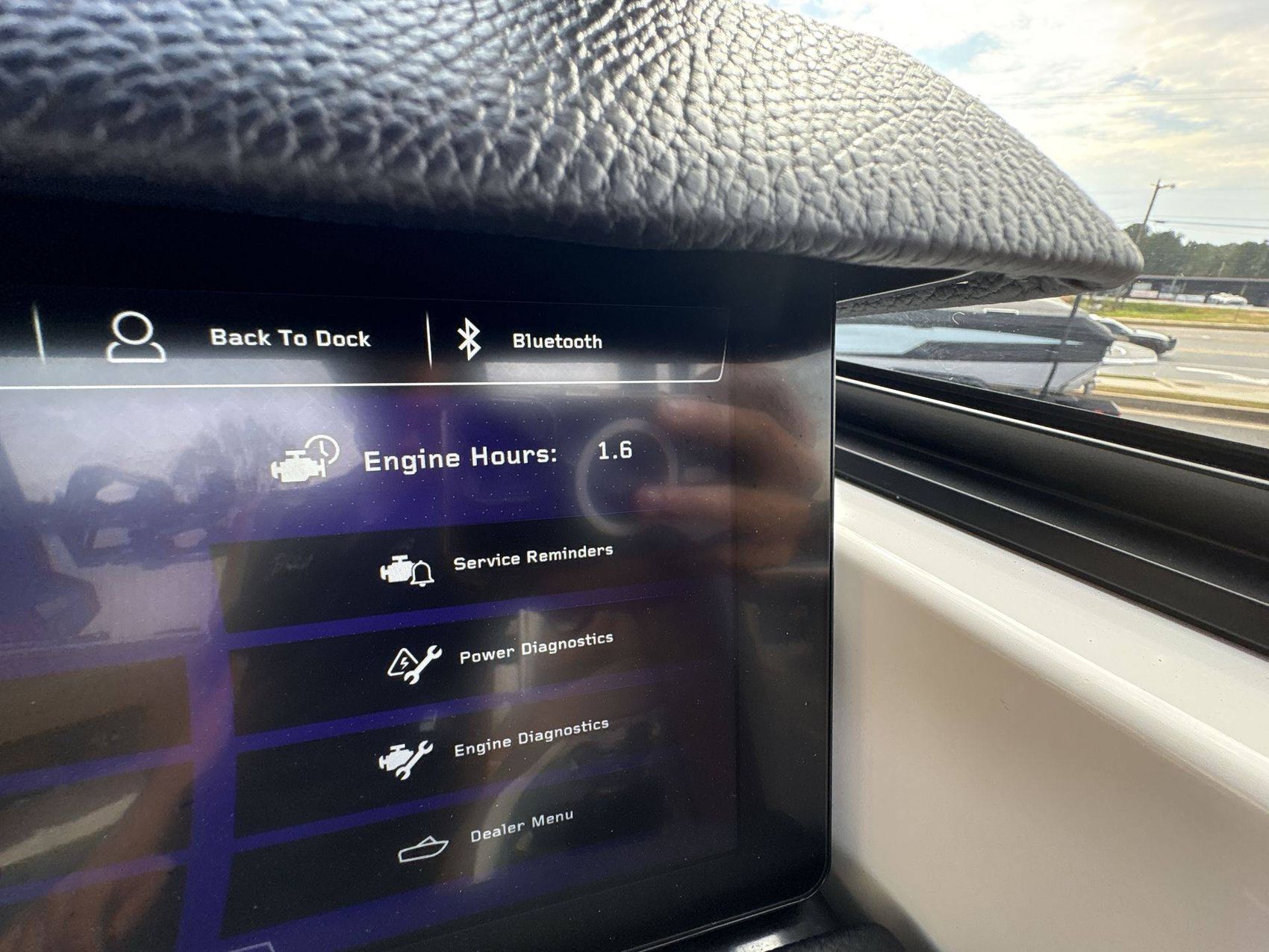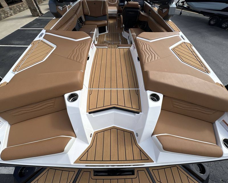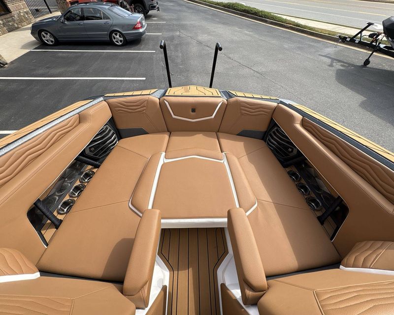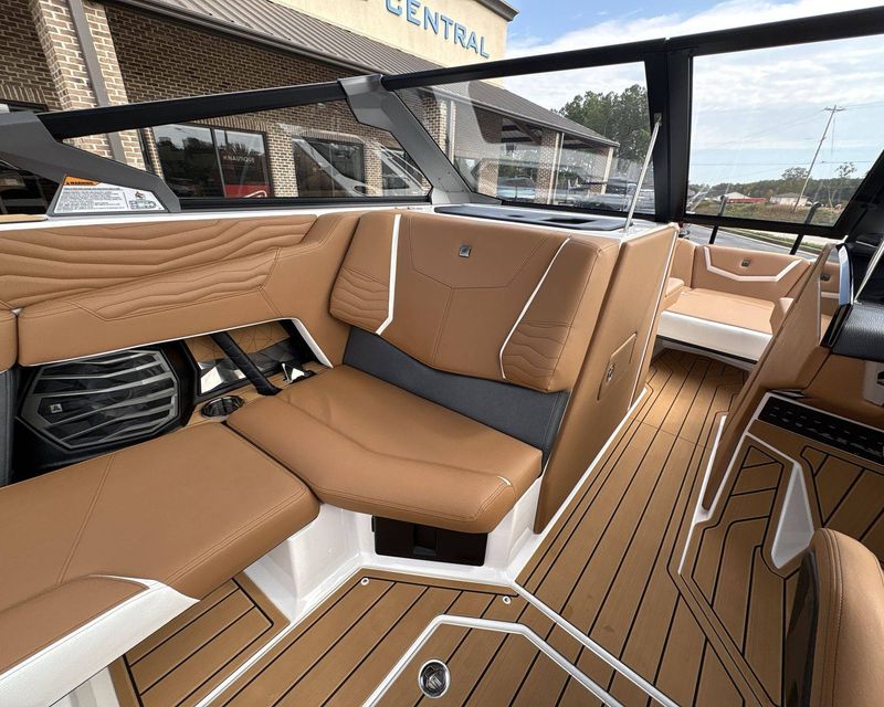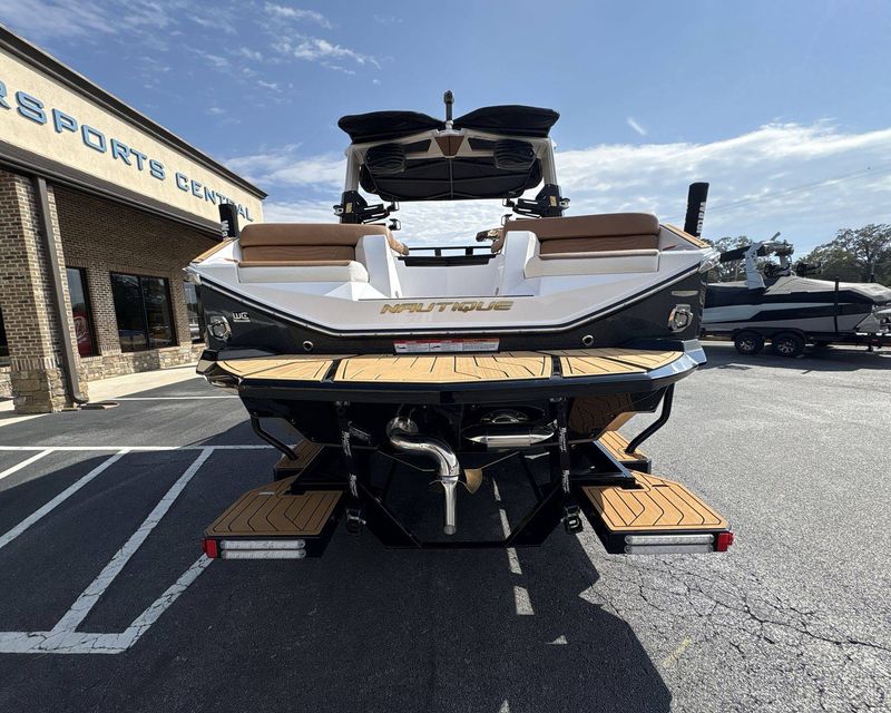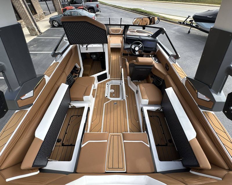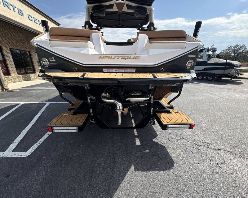 In addition to the standard features, the boat includes a host of optional extra features including an air pump inflator system, additional ballast of 1,200 lbs, a heater with defroster, enhanced courtesy lighting package, underwater lights, Nautique Integrated Steering Assist, and a tandem spoke leather steering wheel. Wireless chargers are available in magnetic, pockets and glovebox.