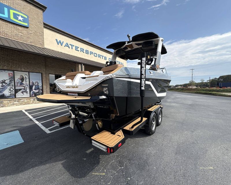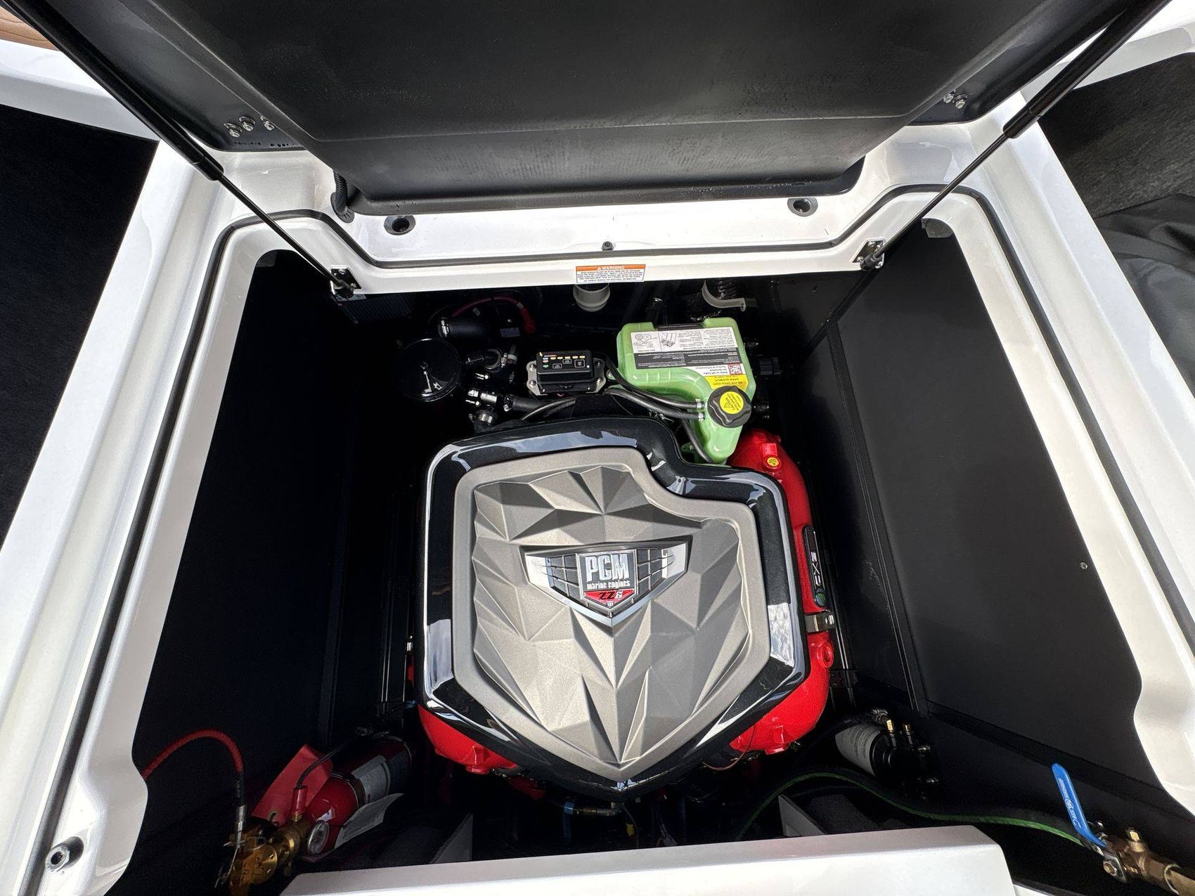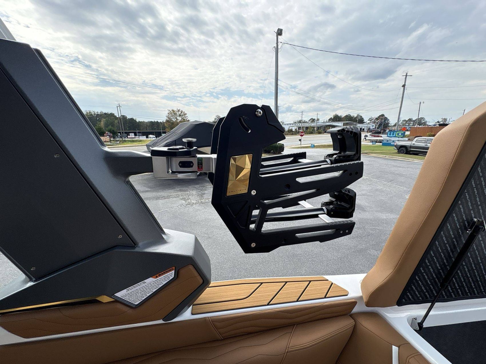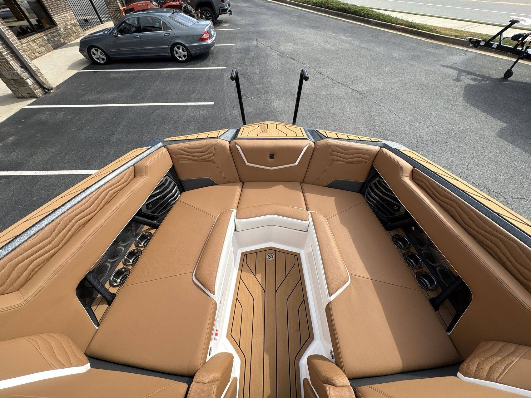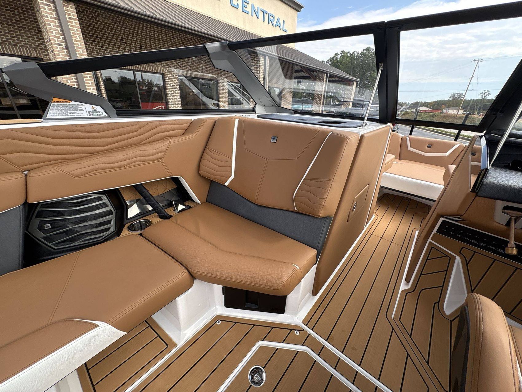 In addition to the standard features, the boat includes a host of optional extra features including an air pump inflator system, additional ballast of 1,200 lbs, a heater with defroster, enhanced courtesy lighting package, underwater lights, Nautique Integrated Steering Assist, and a tandem spoke leather steering wheel. Wireless chargers are available in magnetic, pockets and glovebox.