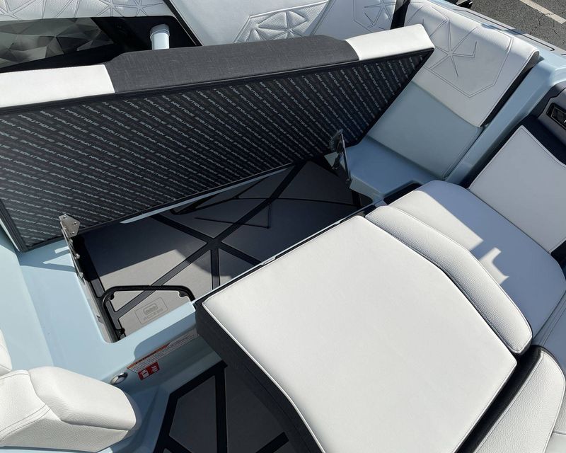 The boat also has an Air Pump Inflator System, an additional 1,200 lbs of Supplemental Ballast, a Heater with Defroster, LINC Panoray - Navionics Maps, and a Surf Select with Surf Switch. These features enhance comfort, convenience, and performance while on water.