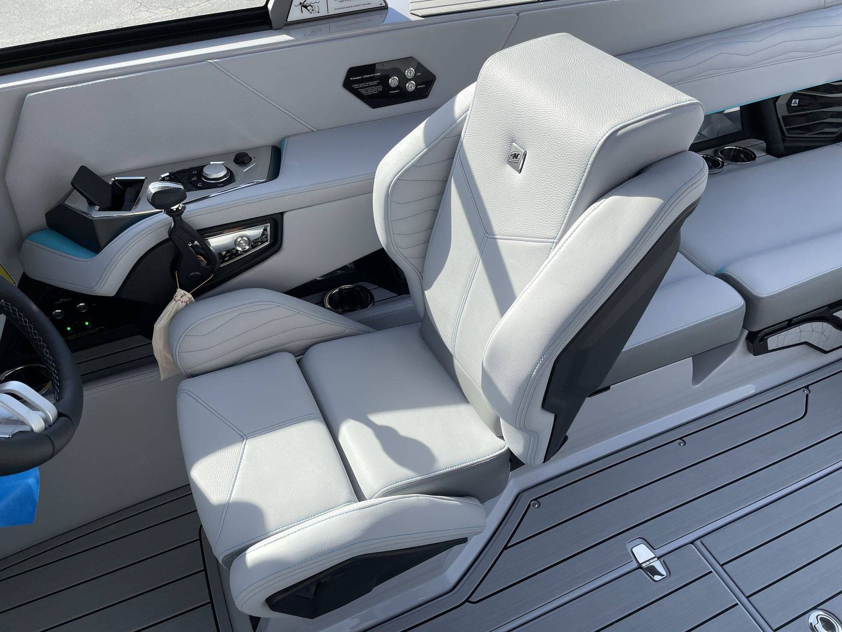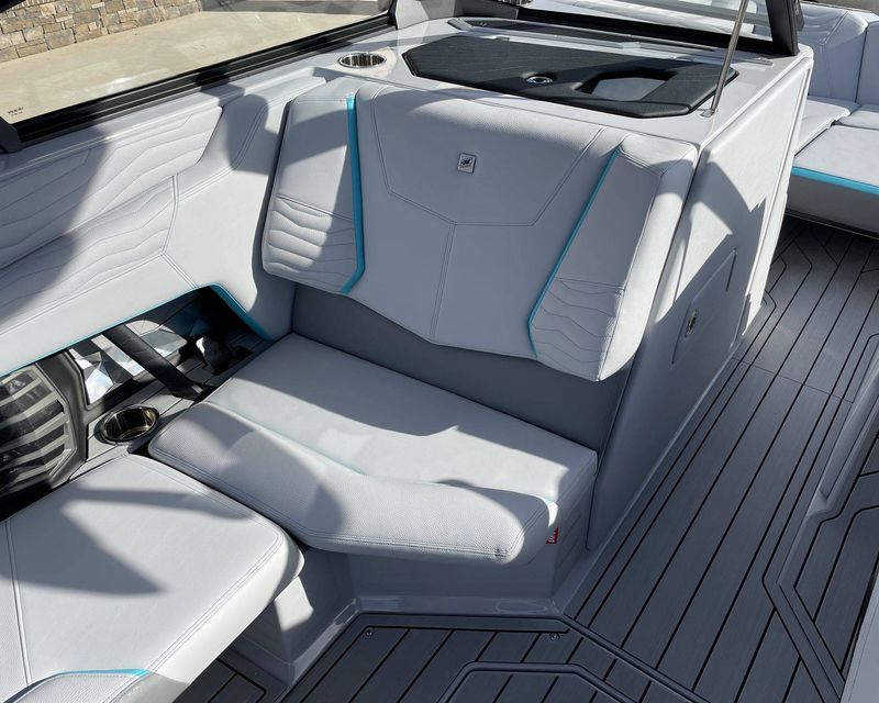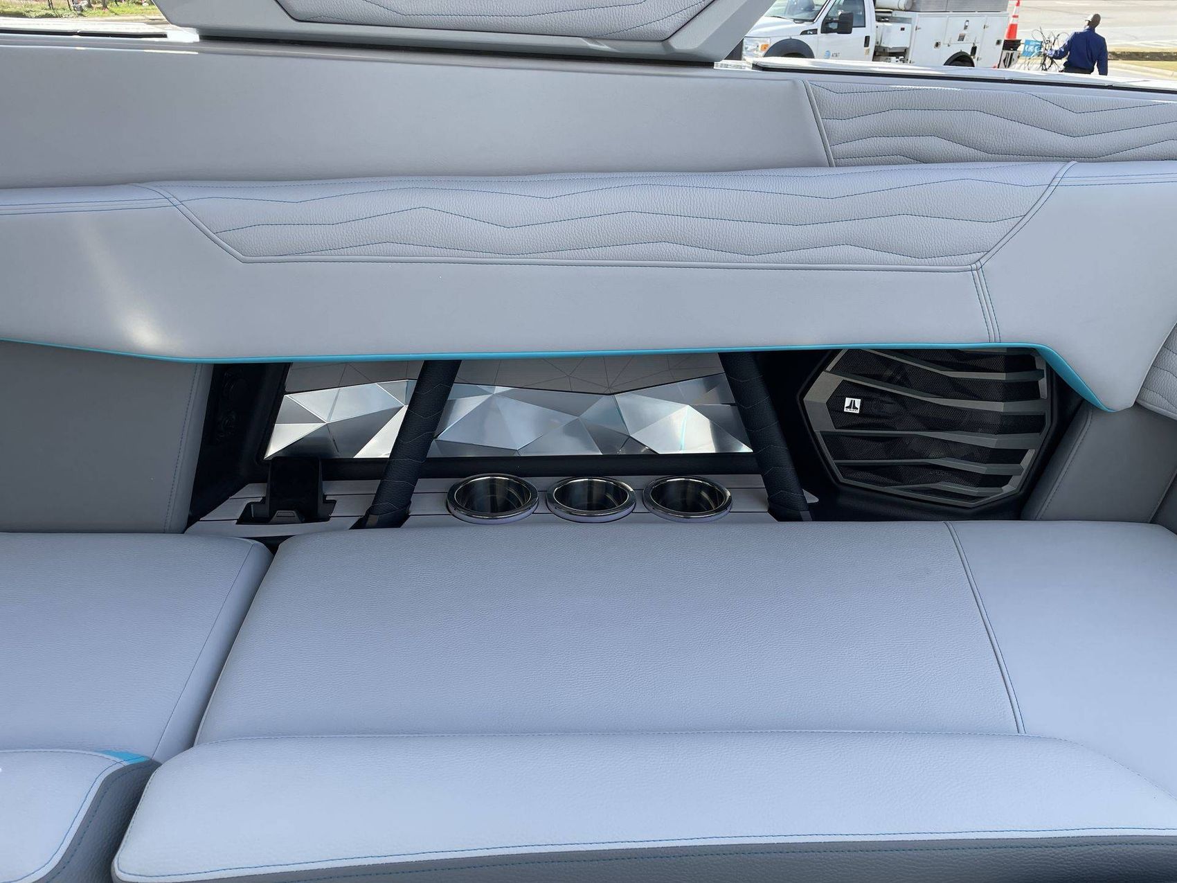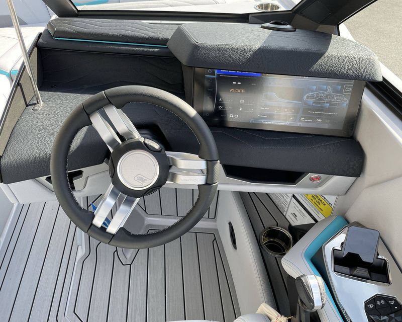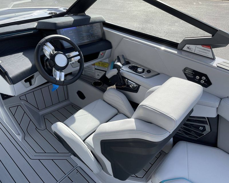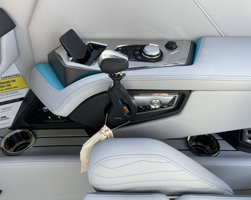 Your comfort is our priority. This boat comes equipped with an additional 1,200lb ballast, a heater with defroster, an enhanced lighting package, underwater lights, a LINC Panoray Navionics map, a Nautique integrated steering assist, a tandem spoke leather steering wheel, and wireless chargers strategically placed in the pockets and glovebox.