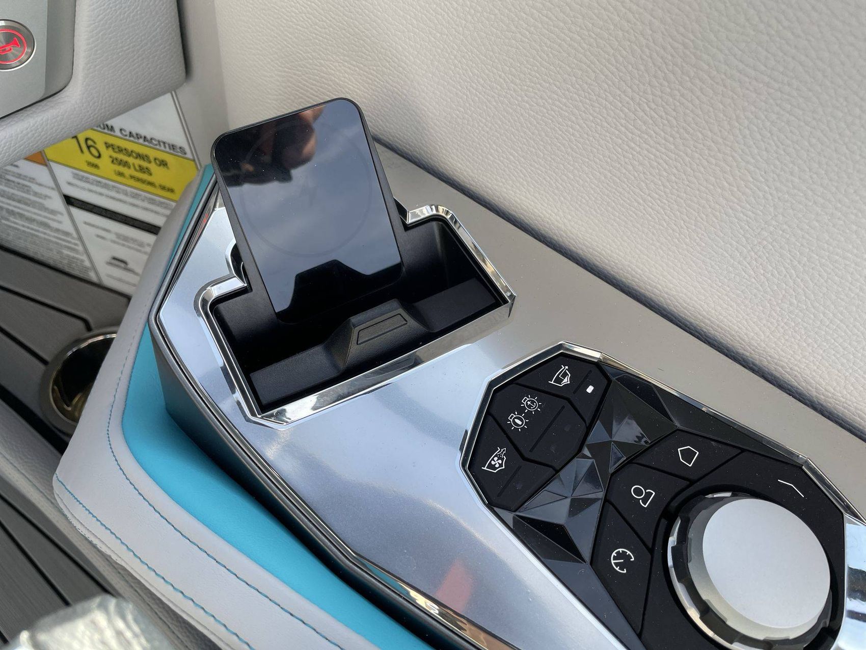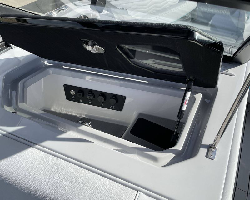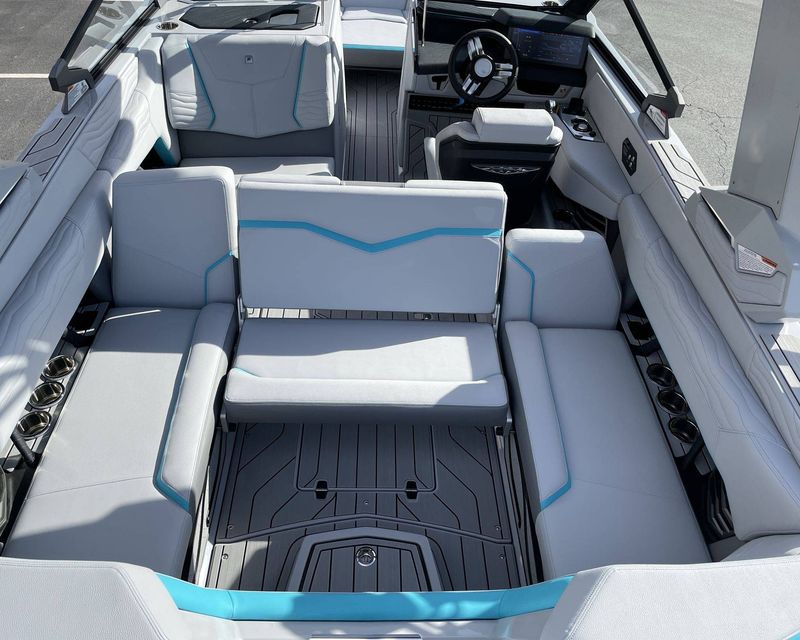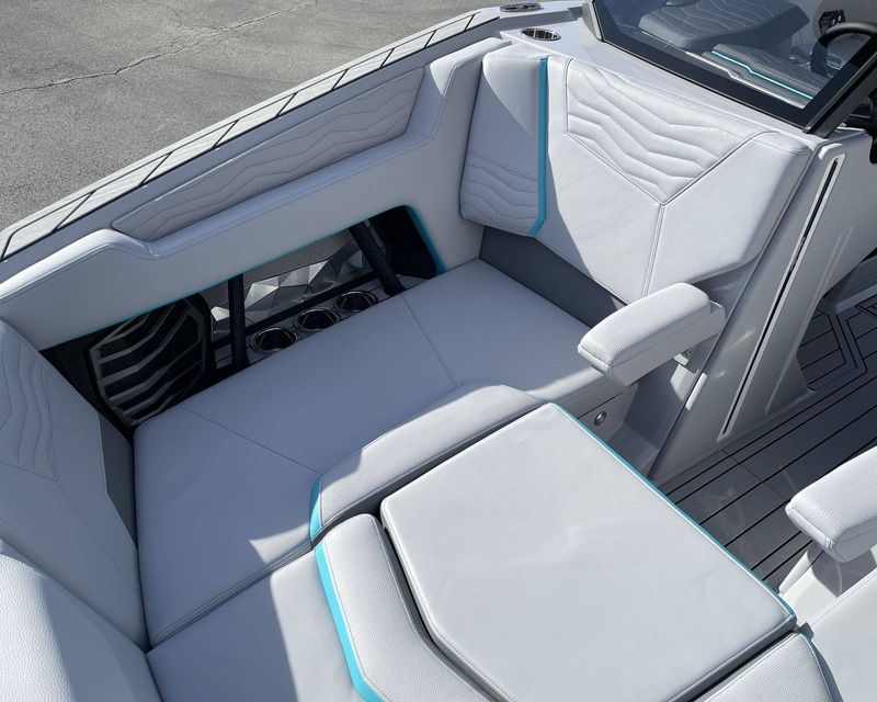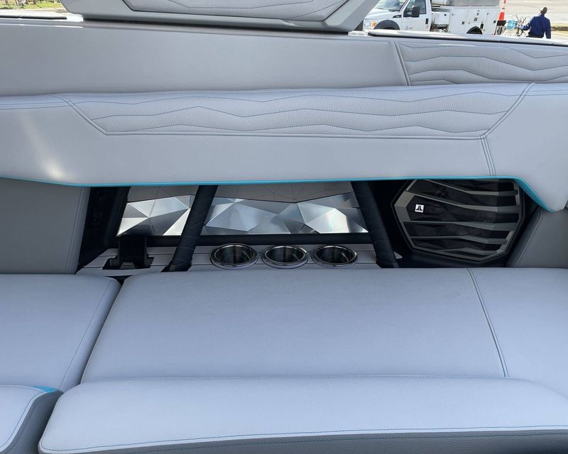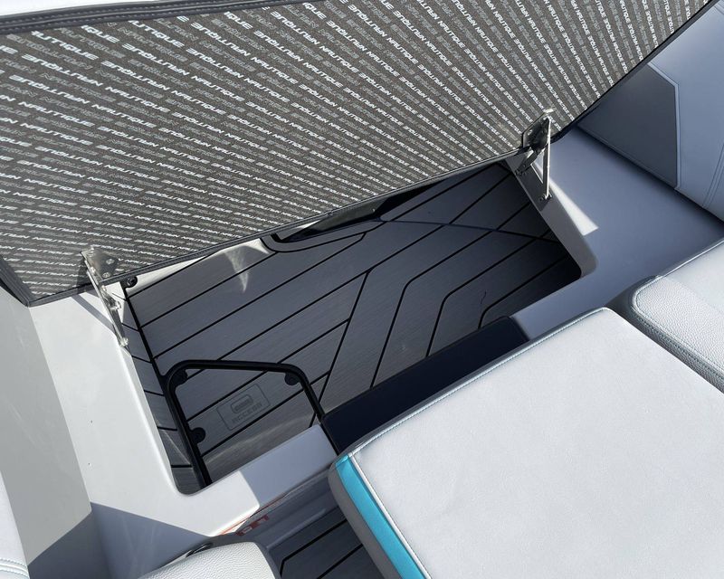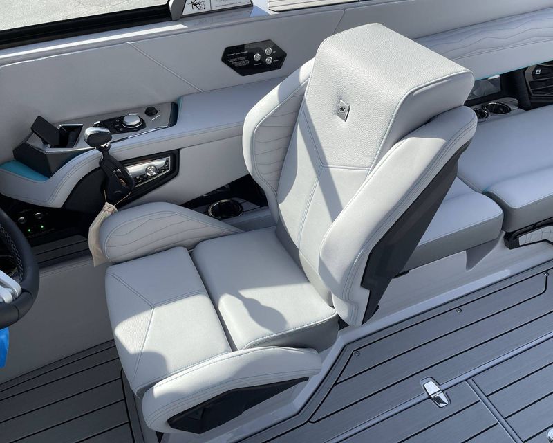 Your comfort is our priority. This boat comes equipped with an additional 1,200lb ballast, a heater with defroster, an enhanced lighting package, underwater lights, a LINC Panoray Navionics map, a Nautique integrated steering assist, a tandem spoke leather steering wheel, and wireless chargers strategically placed in the pockets and glovebox.