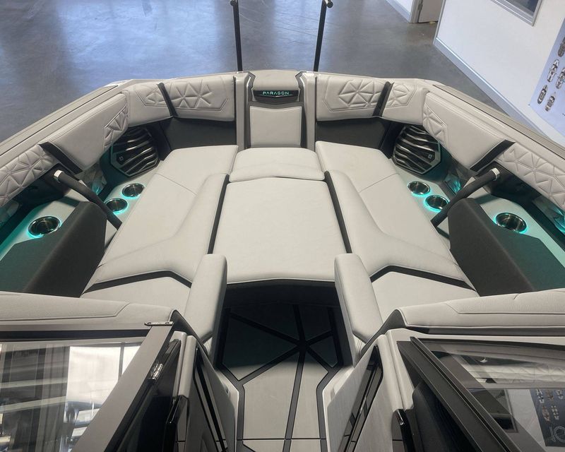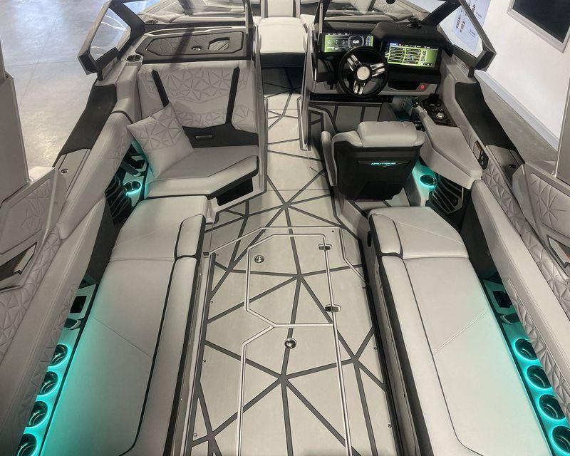 This boat comes with an air pump inflator system, an additional 1,200 lbs of supplemental ballast for peak performance, and a heater with a defroster for comfort. It also features Navionics maps on a LINC Panoray for better navigation, two sets of pillows for extra comfort, and a Surf Select with Surf Switch for leisure activities.