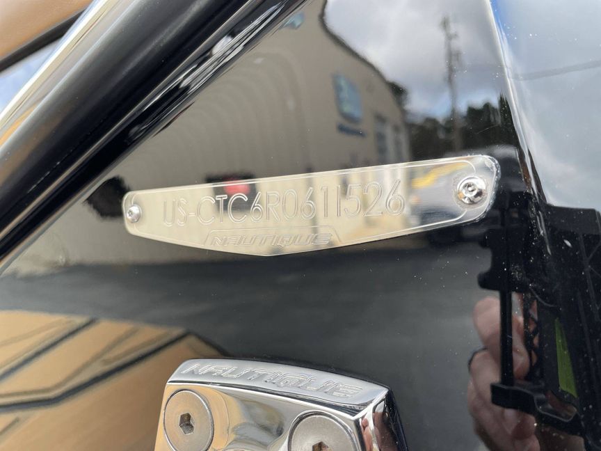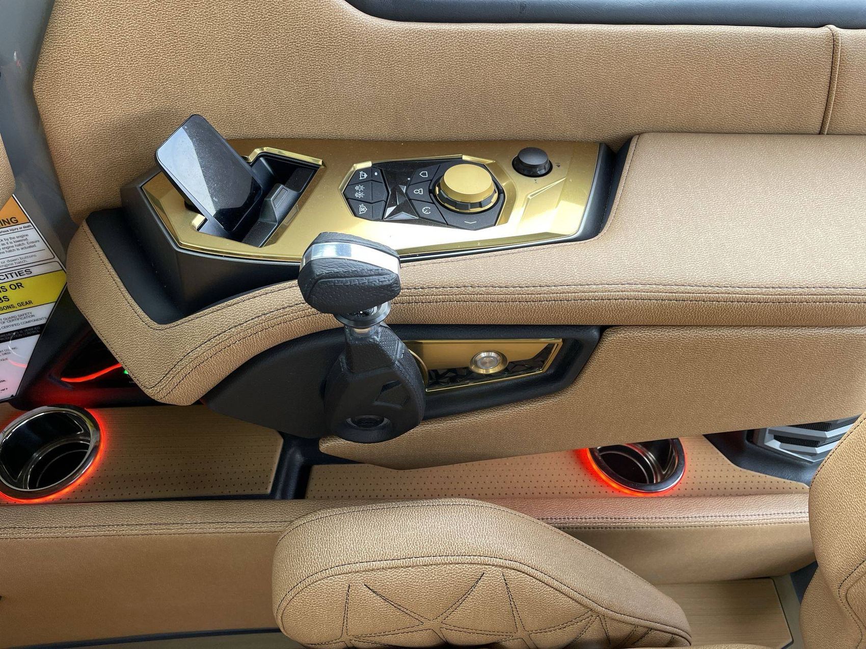The boat boasts of an appealing Anthracite Metal Flake finish on the main stripe and accent stripe. The forward accent, hull bottom, FCT Color, Platform, and NSS covers are finished in Jet Black, while the interior deck color is Tungsten Grey. The Primary and Secondary Interior Colors are Luxtouch Mojave Brown and Jet Black respectively. Certain other details such as the Non-Skid Color (Mocha) and the Interior and Secondary Stitch Thread Color (Black) add to the elegance of the boat. The boat also includes a special Chromax Badging in Legacy Gold Chrome Finish with Illusion Frost.