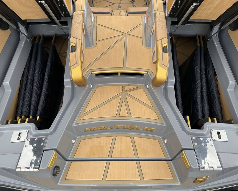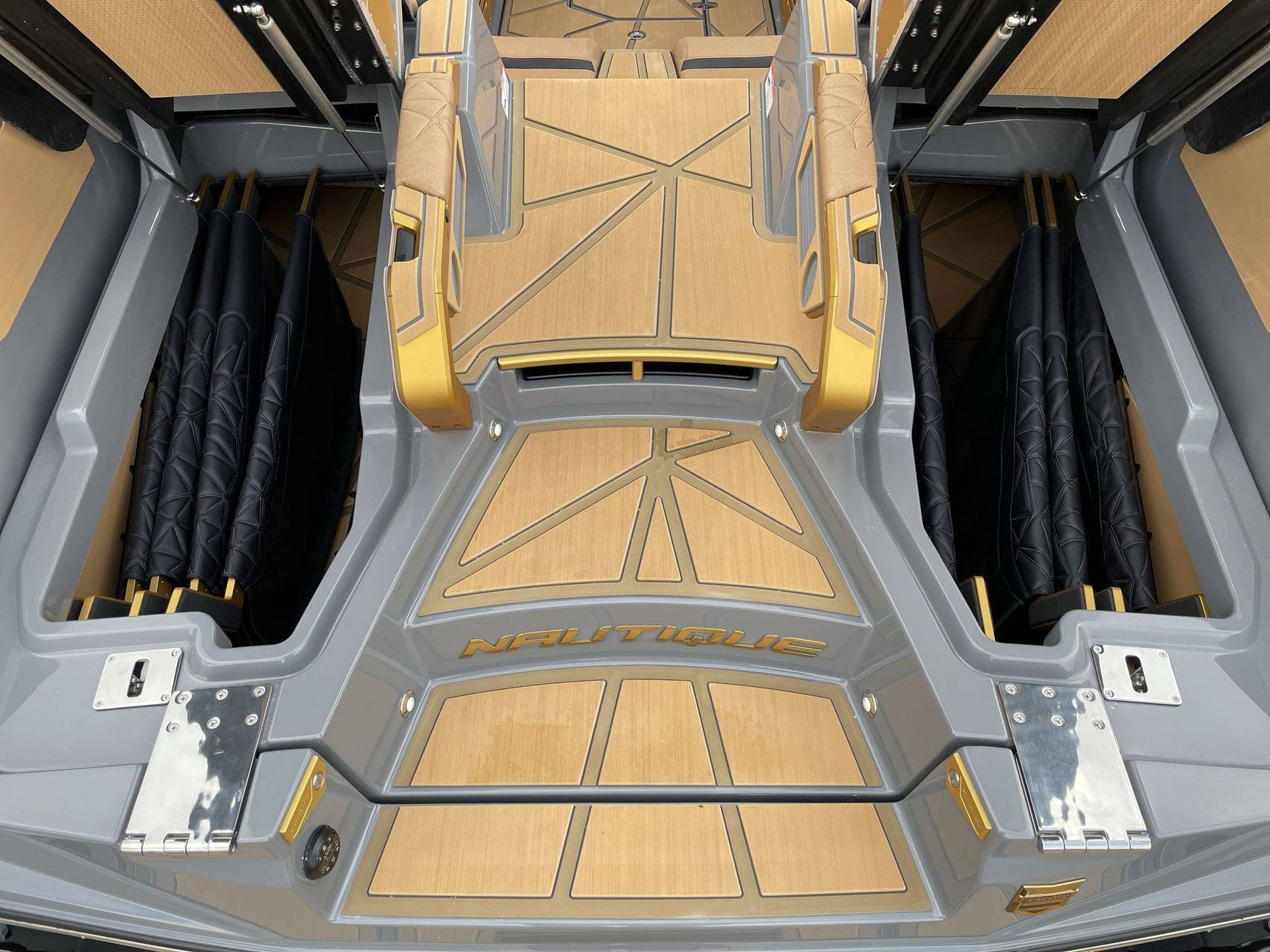 Designed to optimize your leisure and sporting experiences, our boat comes with an extendable Sun Shade in the aft region. Moreover, the boat has been fitted with the Nautique Strapless Board Rack Foil attachment and Nautique Strapless Board Racks for convenient storage of sporting gear.