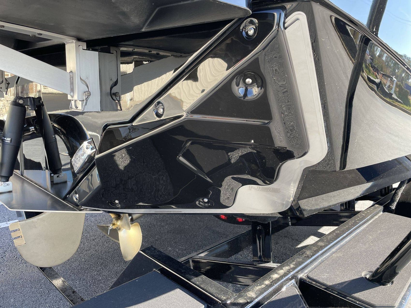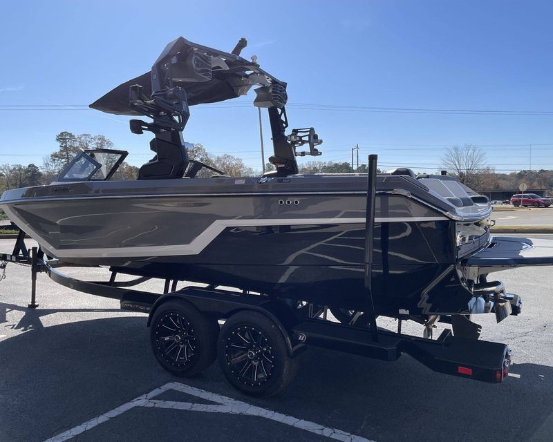 The boat features a Tower Mounted Tri-Fold Bimini with Surf Pockets, a Flight Control Tower - Actuated with a Go Pro Ready Quick Mount. The Nautique Strapless Board Racks optimize storage. The Tower Prep Kit includes JL Audio M Series Elite(Pre-Wired 4 Channel Amp).