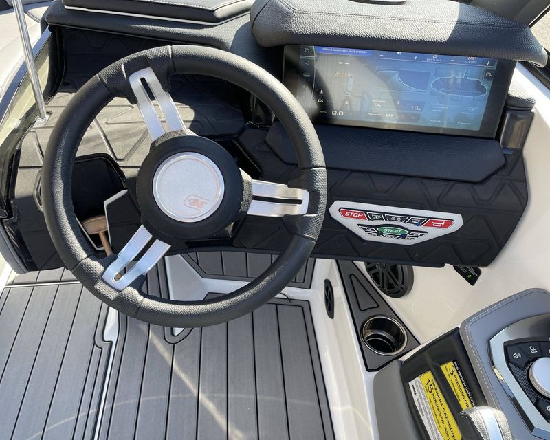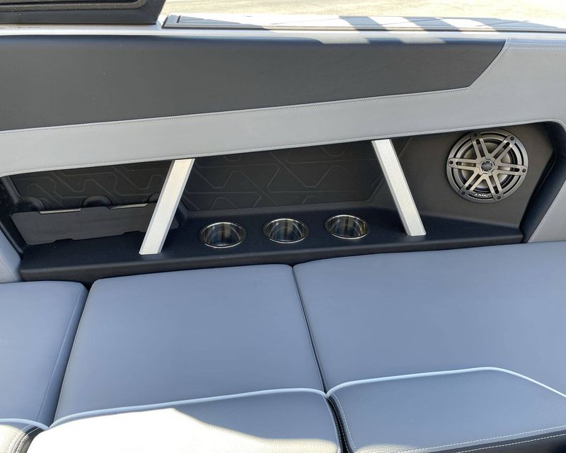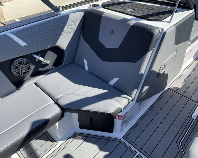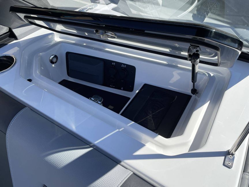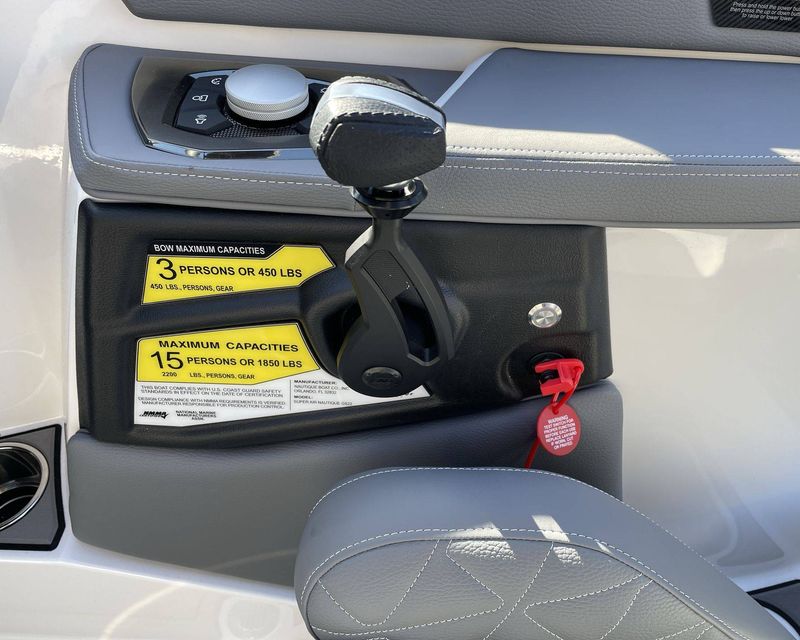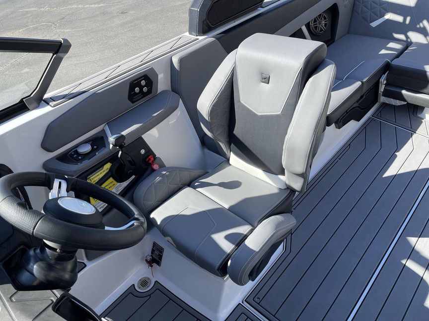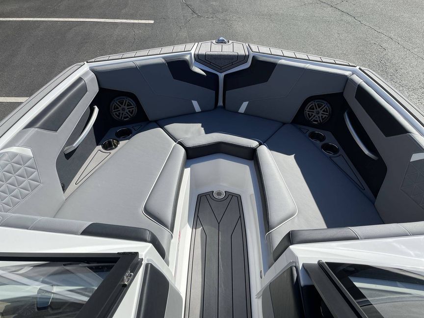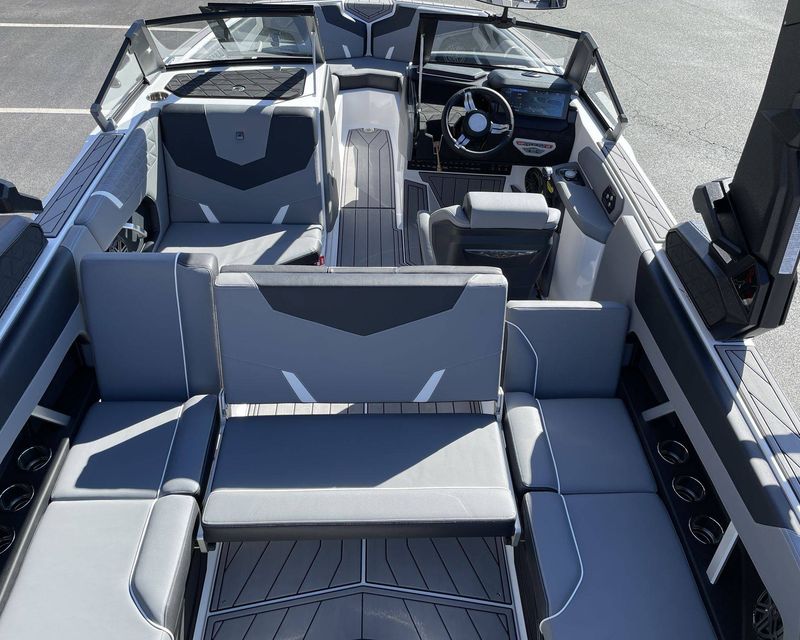 The custom options include an Air Pump Inflator System, additional 500 LBS Ballast, Heater with Defroster, Docking/Daytime Running Lights, and Underwater Lights. LINC Panoray - Navionics Maps provide navigation. Additionally, the boat also comes with a Retractable Ski Pylon, Wireless Charging, and Sliding Reversible Stern Seat.