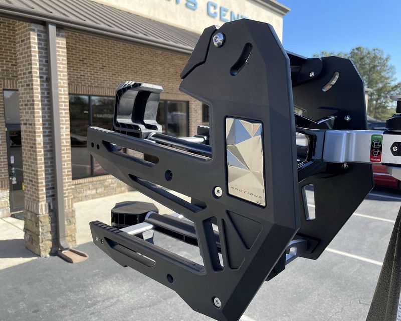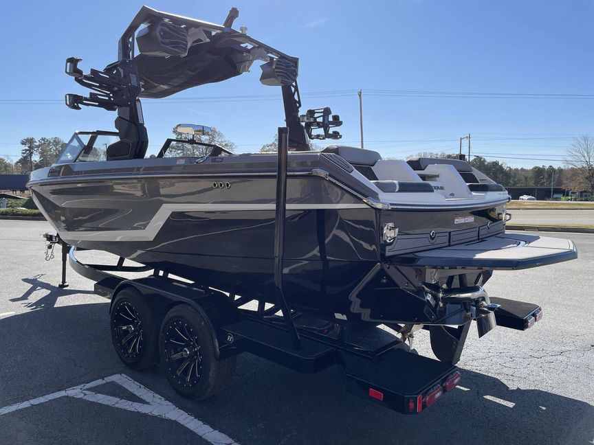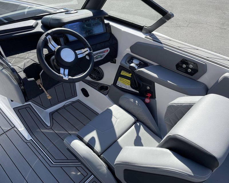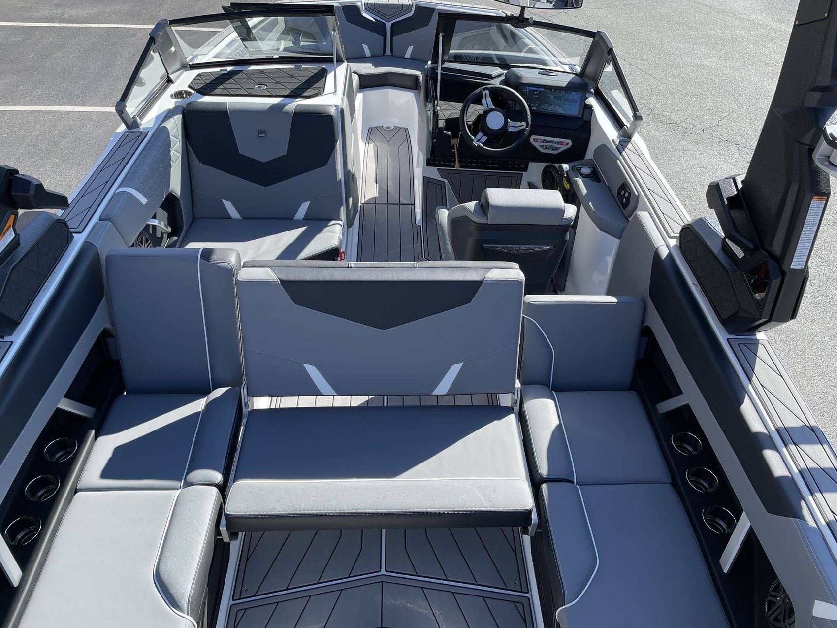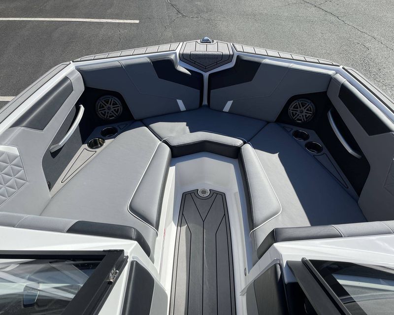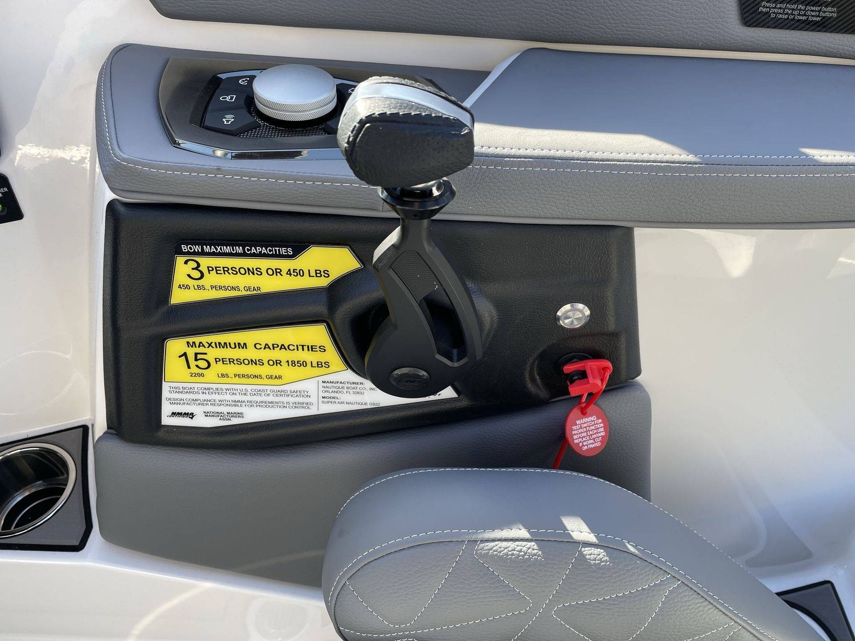 The custom options include an Air Pump Inflator System, additional 500 LBS Ballast, Heater with Defroster, Docking/Daytime Running Lights, and Underwater Lights. LINC Panoray - Navionics Maps provide navigation. Additionally, the boat also comes with a Retractable Ski Pylon, Wireless Charging, and Sliding Reversible Stern Seat.