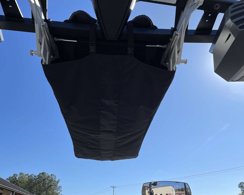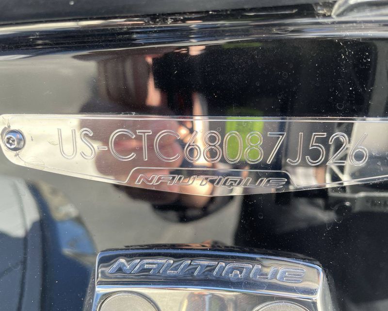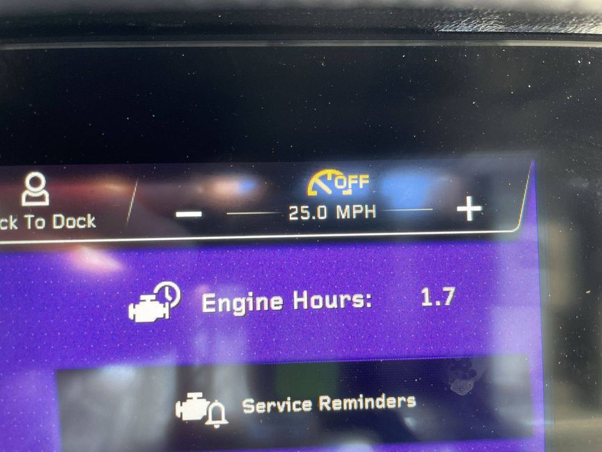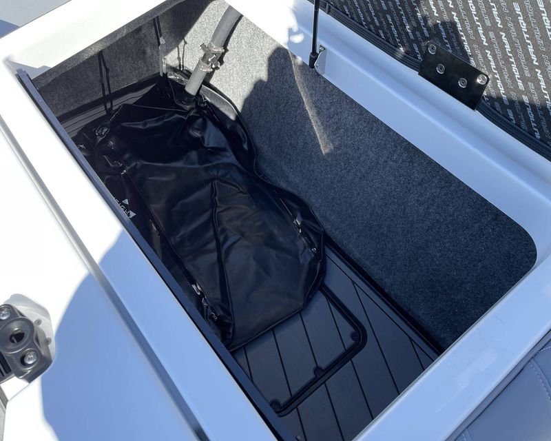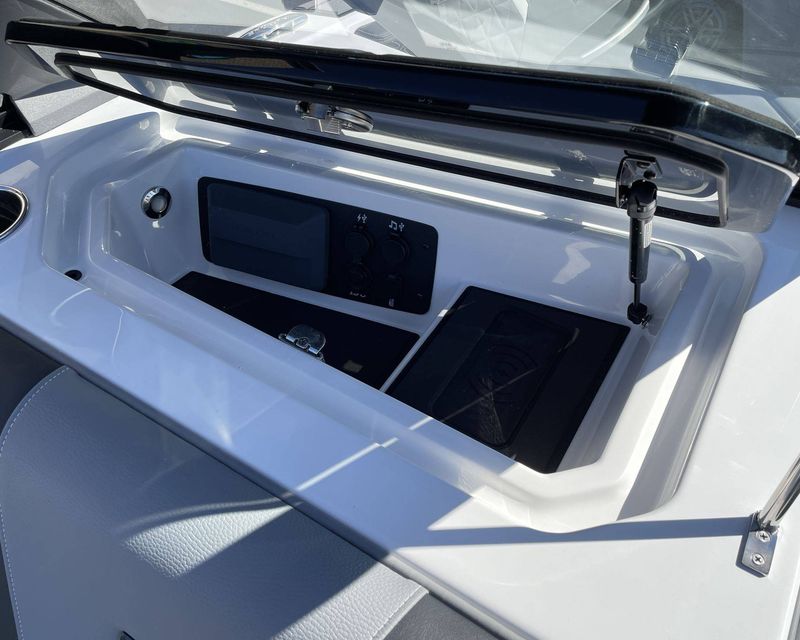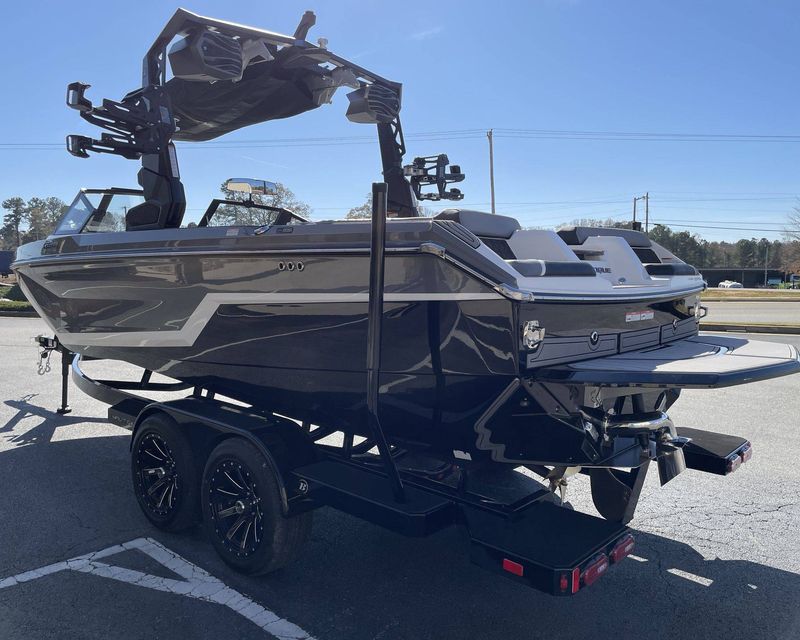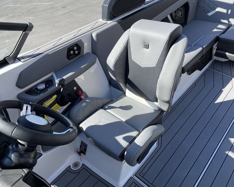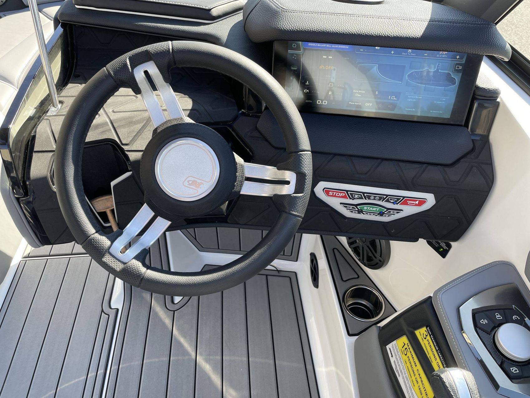 The custom options include an Air Pump Inflator System, additional 500 LBS Ballast, Heater with Defroster, Docking/Daytime Running Lights, and Underwater Lights. LINC Panoray - Navionics Maps provide navigation. Additionally, the boat also comes with a Retractable Ski Pylon, Wireless Charging, and Sliding Reversible Stern Seat.
