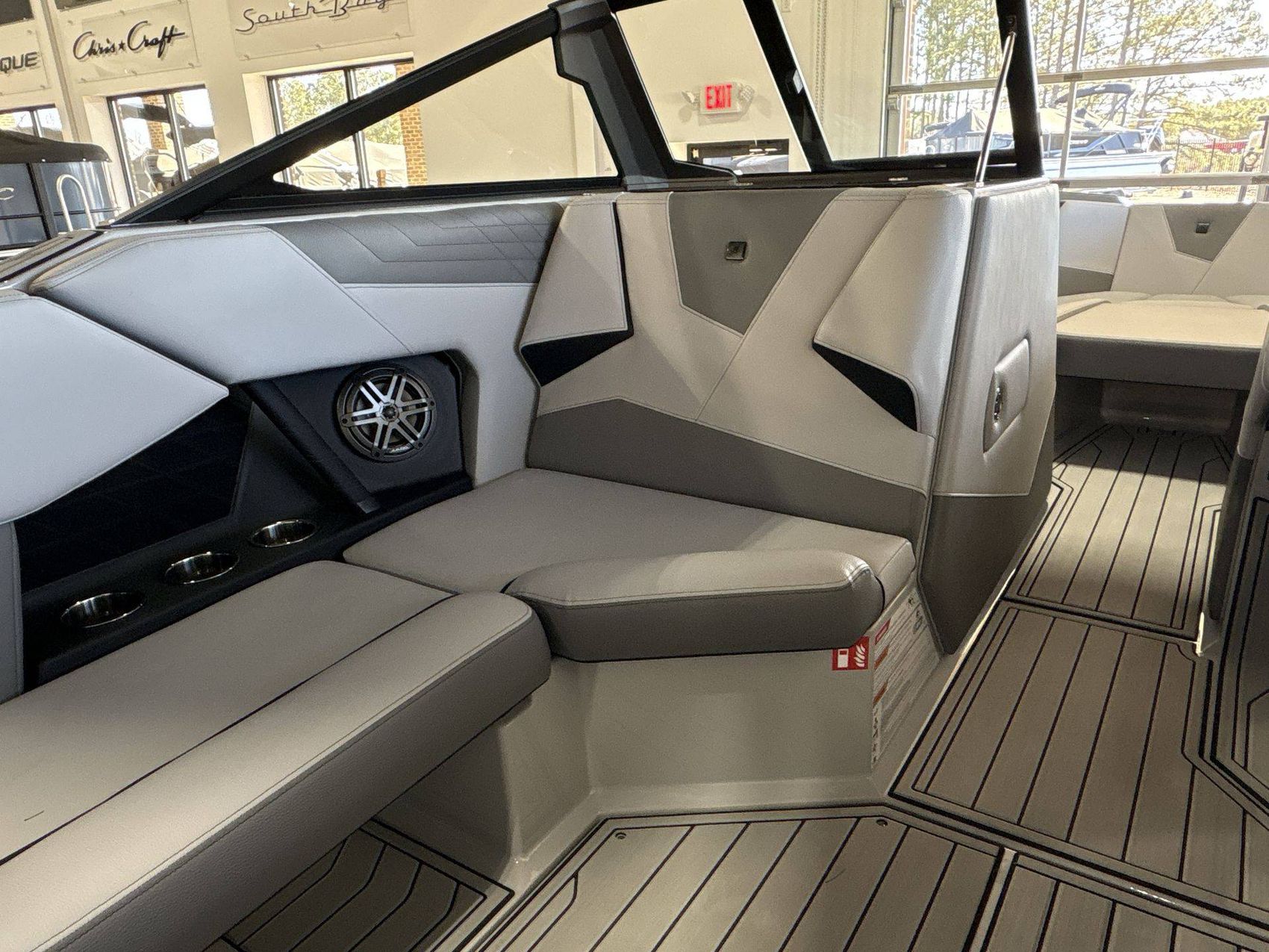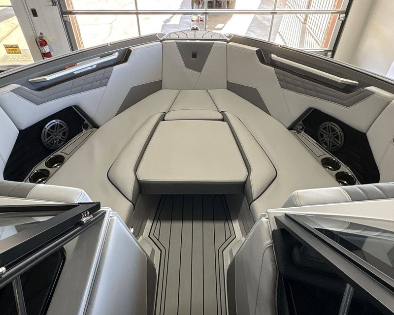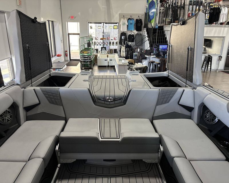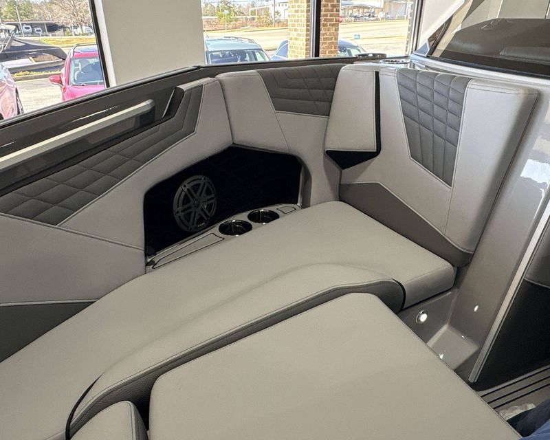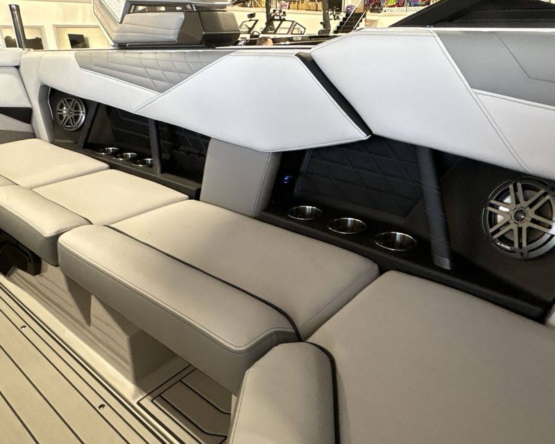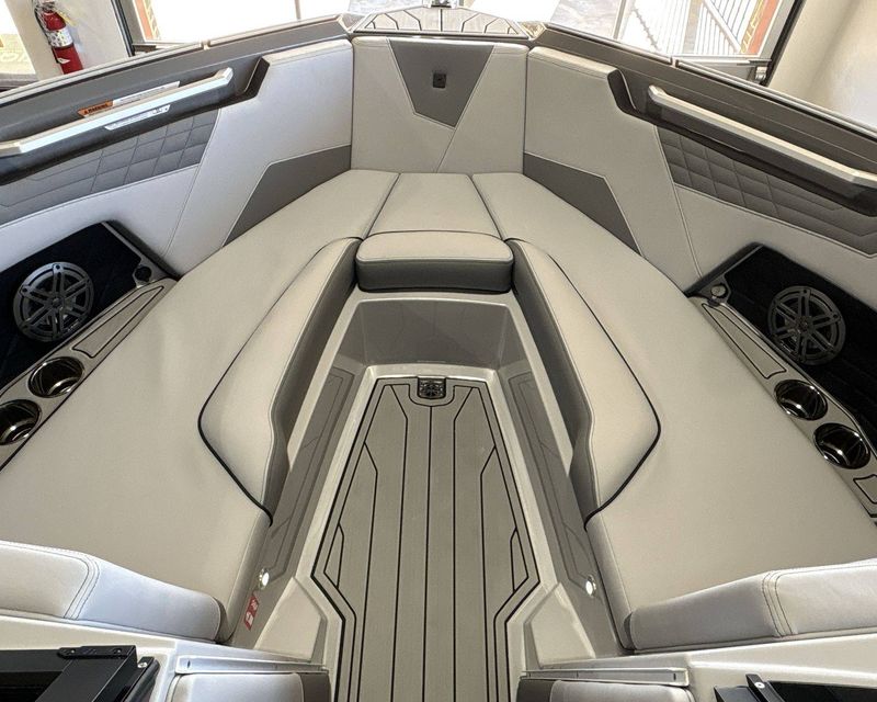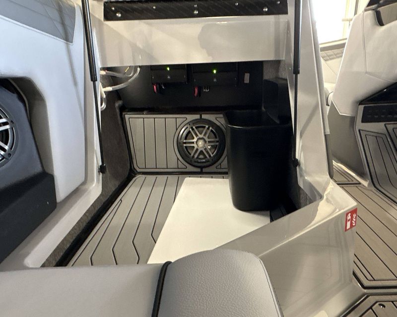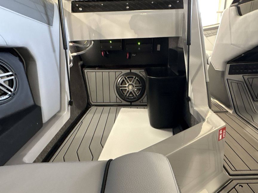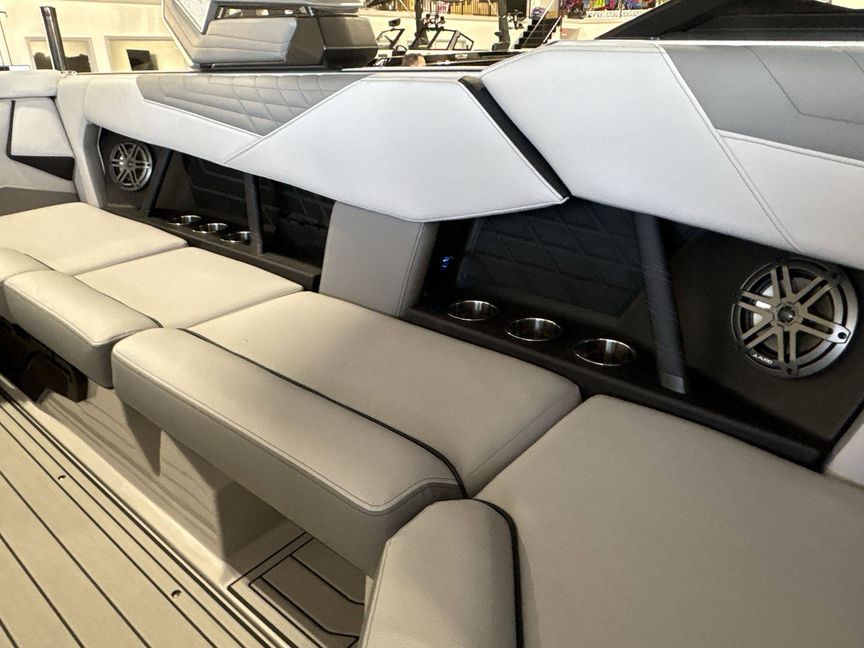 The boat features top-notch seating comfort with a plush bow filler cushion. There's also a premier quality Stereo - JL Audio M3 Series, enhancing your boating experience. Stay comfortable and safe with the Walk-Thru Air-Dam (Slide In).