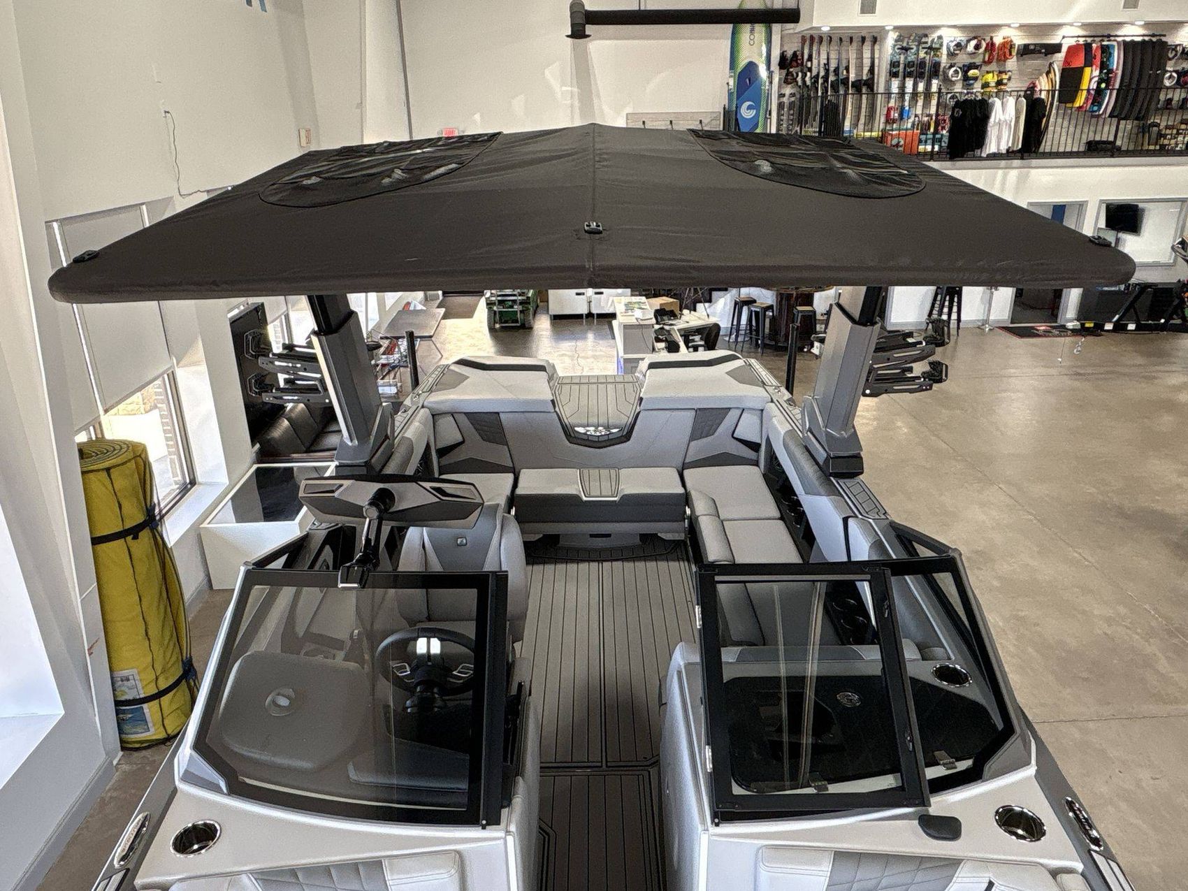 The rich black chrome finish with illusion frost on the interior deck; the elegant combination of Haze Grey, Jet Black and Tungsten Grey for the main stripe, accent, hull bottom, platform, NSS covers, and the interior primary color make this boat an instantly recognisable icon of luxury.