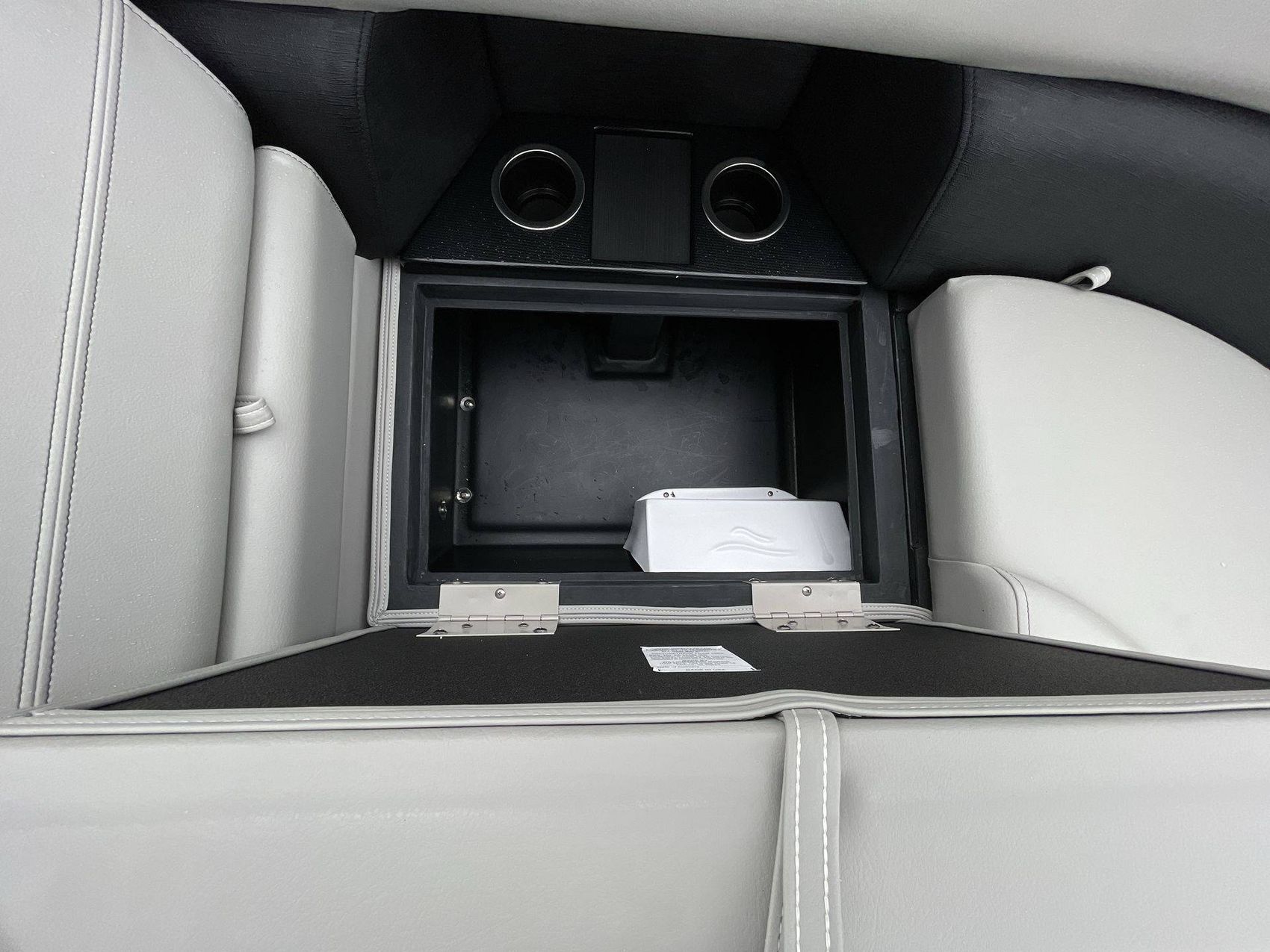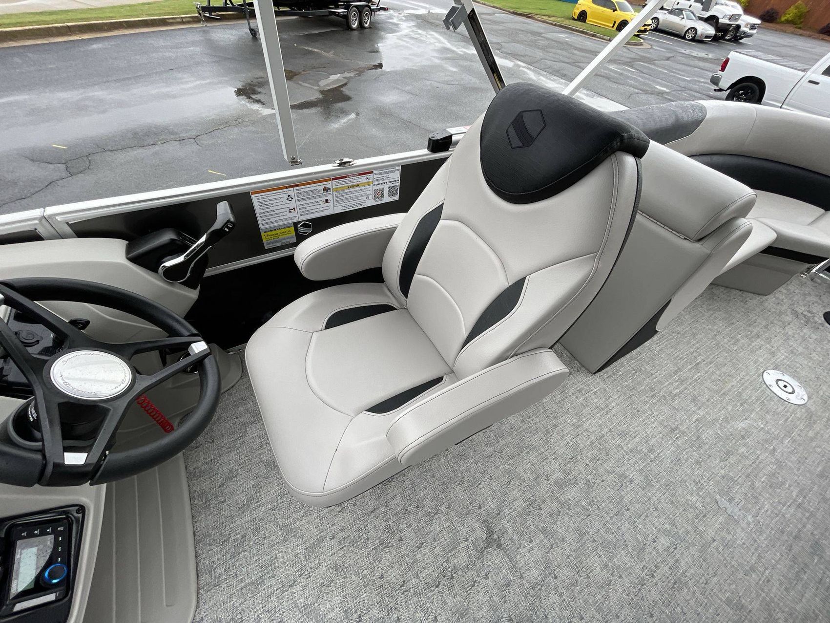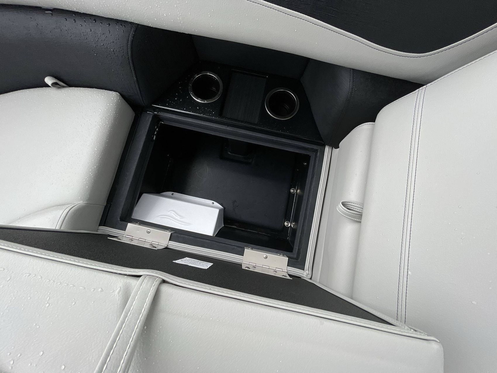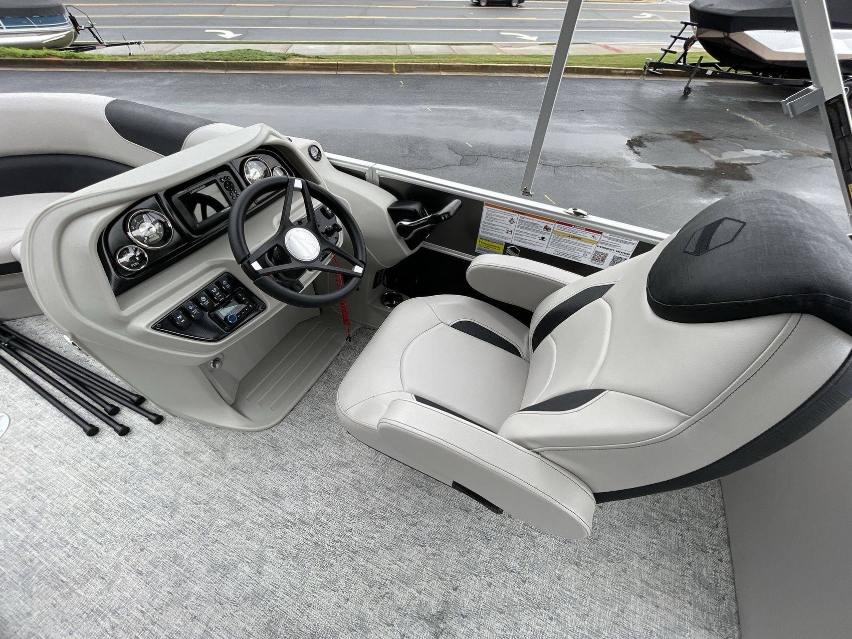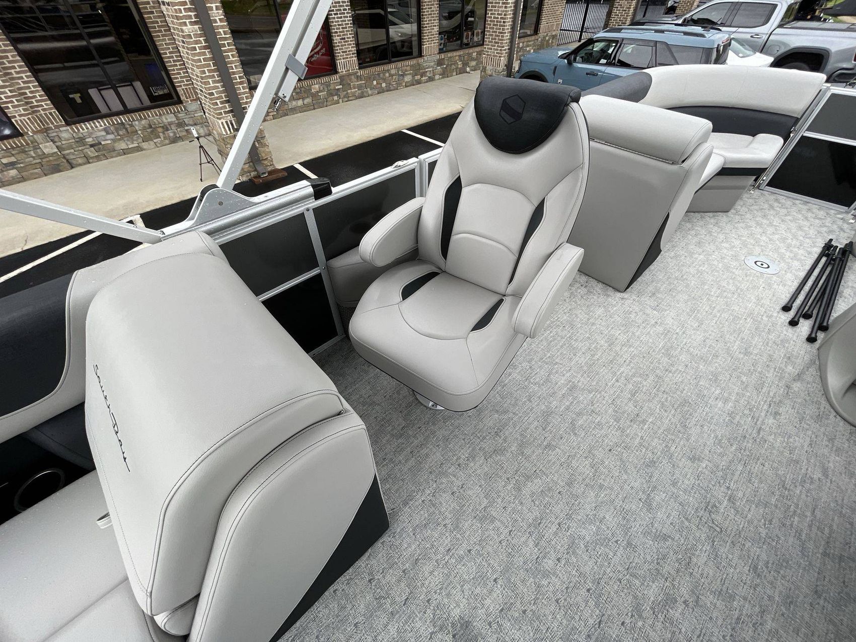 The SUZUKI DF140 222RS LE's sleek design is accentuated by its silver rail standard, and two-tone paneling in shades of sophisticated charcoal and bold black onyx. The boat's furniture base features Capstone upholstery, accentuated by the Spectre-colored accents that add a layer of comfort and style. Furthermore, the coastal concrete standard enhances its aesthetic appeal.
