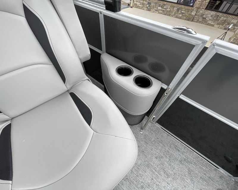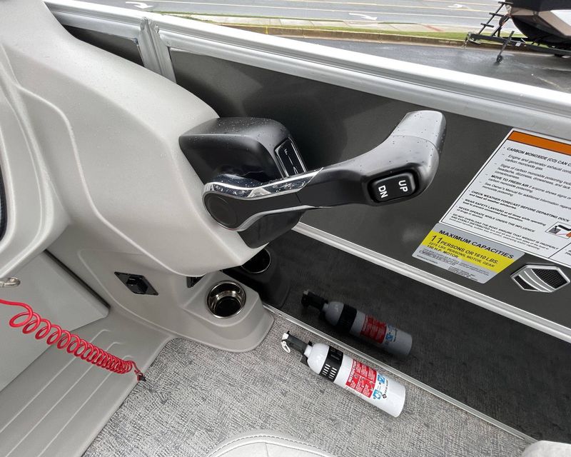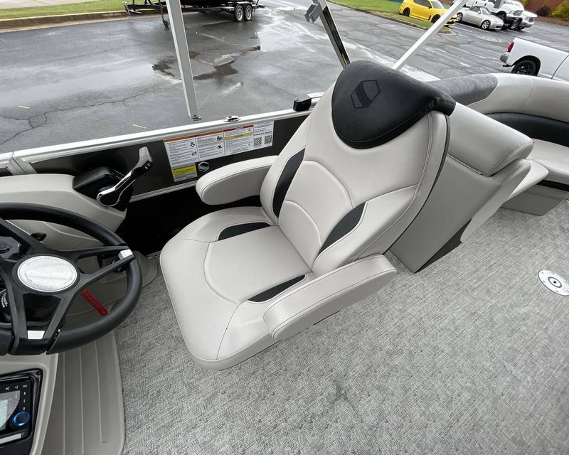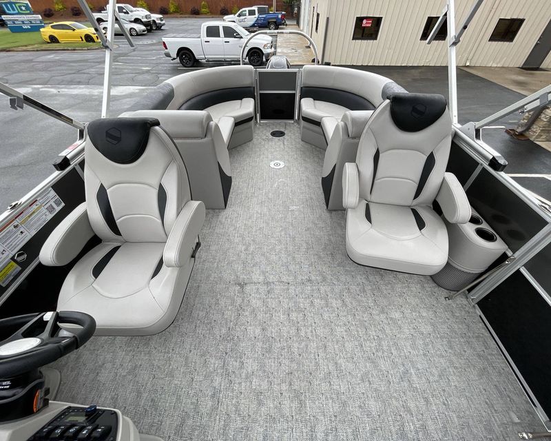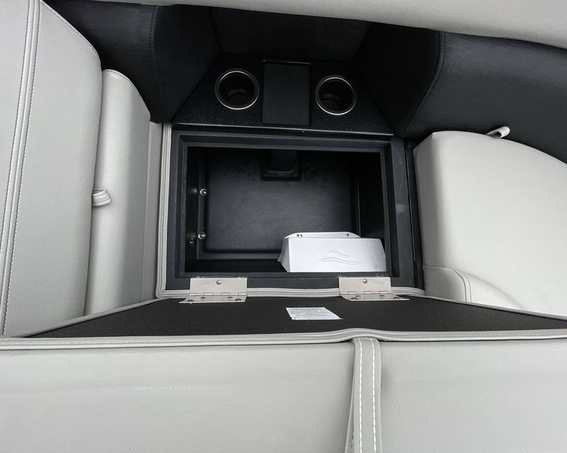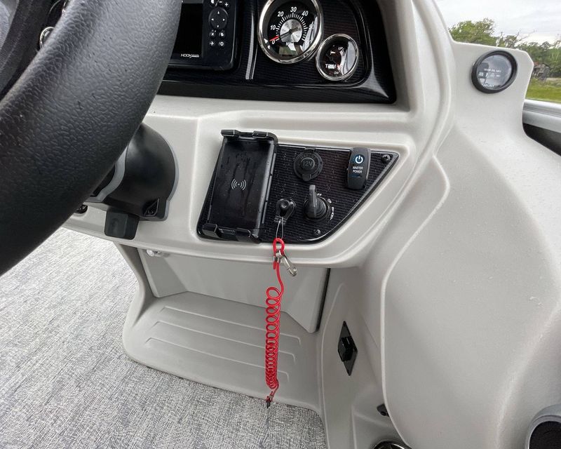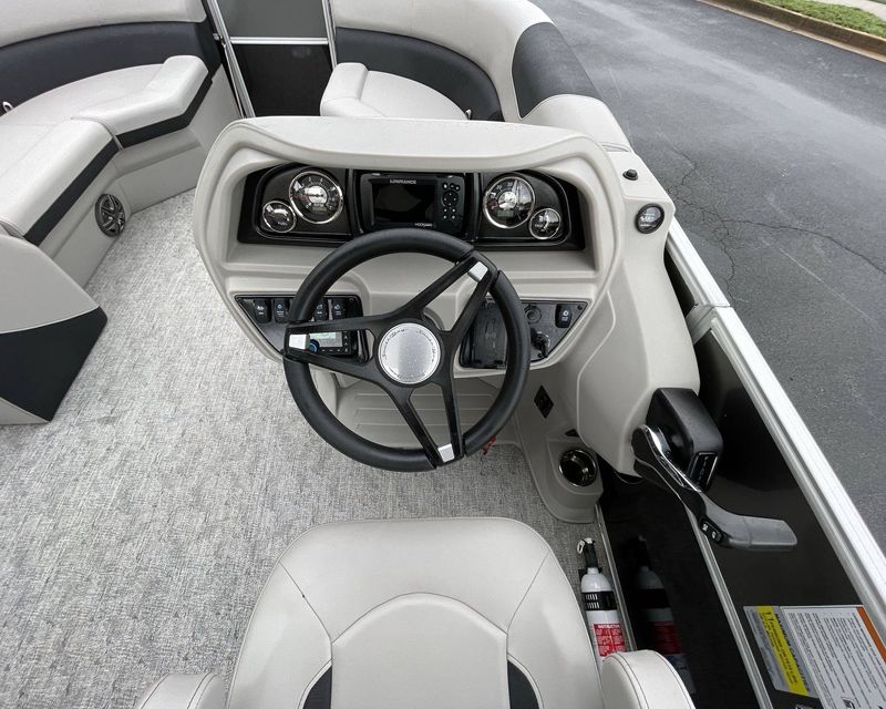 This boat is fitted with a powerful SUZUKI engine powering an iconic tri-toon design. Notable features include a center sport tube, aluminum underdeck, and large lifting strakes on the inside of the outer tubes. The boat is fitted with a robust 27-gallon fuel tank and boasts state-of-the-art Seastar hydraulic steering and tilt steering for maximum control and precision on the water.