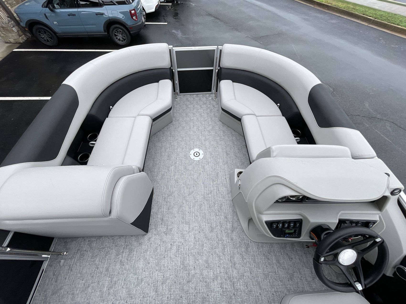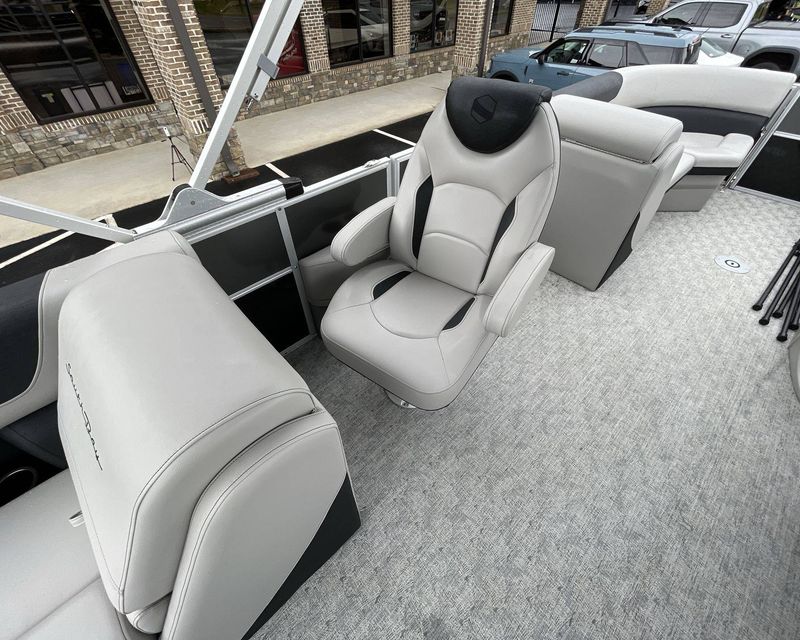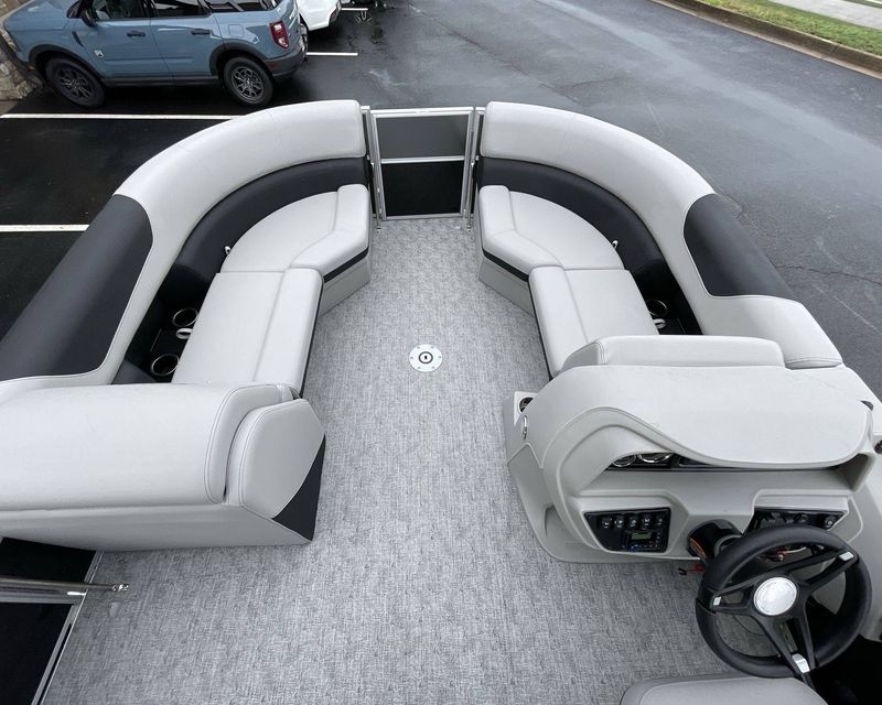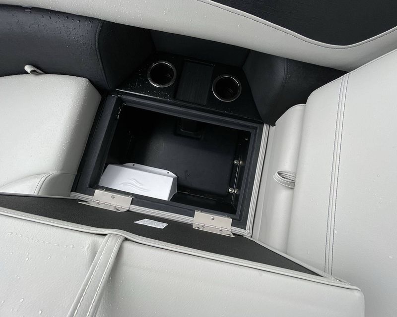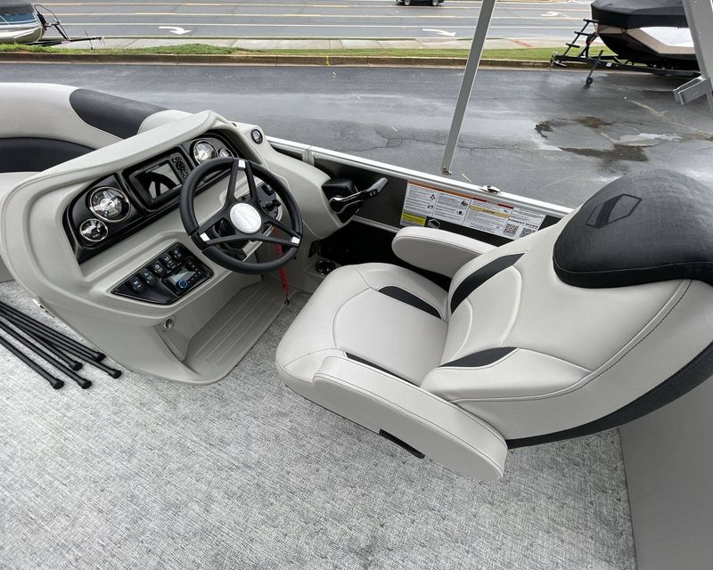 This boat is fitted with a powerful SUZUKI engine powering an iconic tri-toon design. Notable features include a center sport tube, aluminum underdeck, and large lifting strakes on the inside of the outer tubes. The boat is fitted with a robust 27-gallon fuel tank and boasts state-of-the-art Seastar hydraulic steering and tilt steering for maximum control and precision on the water.