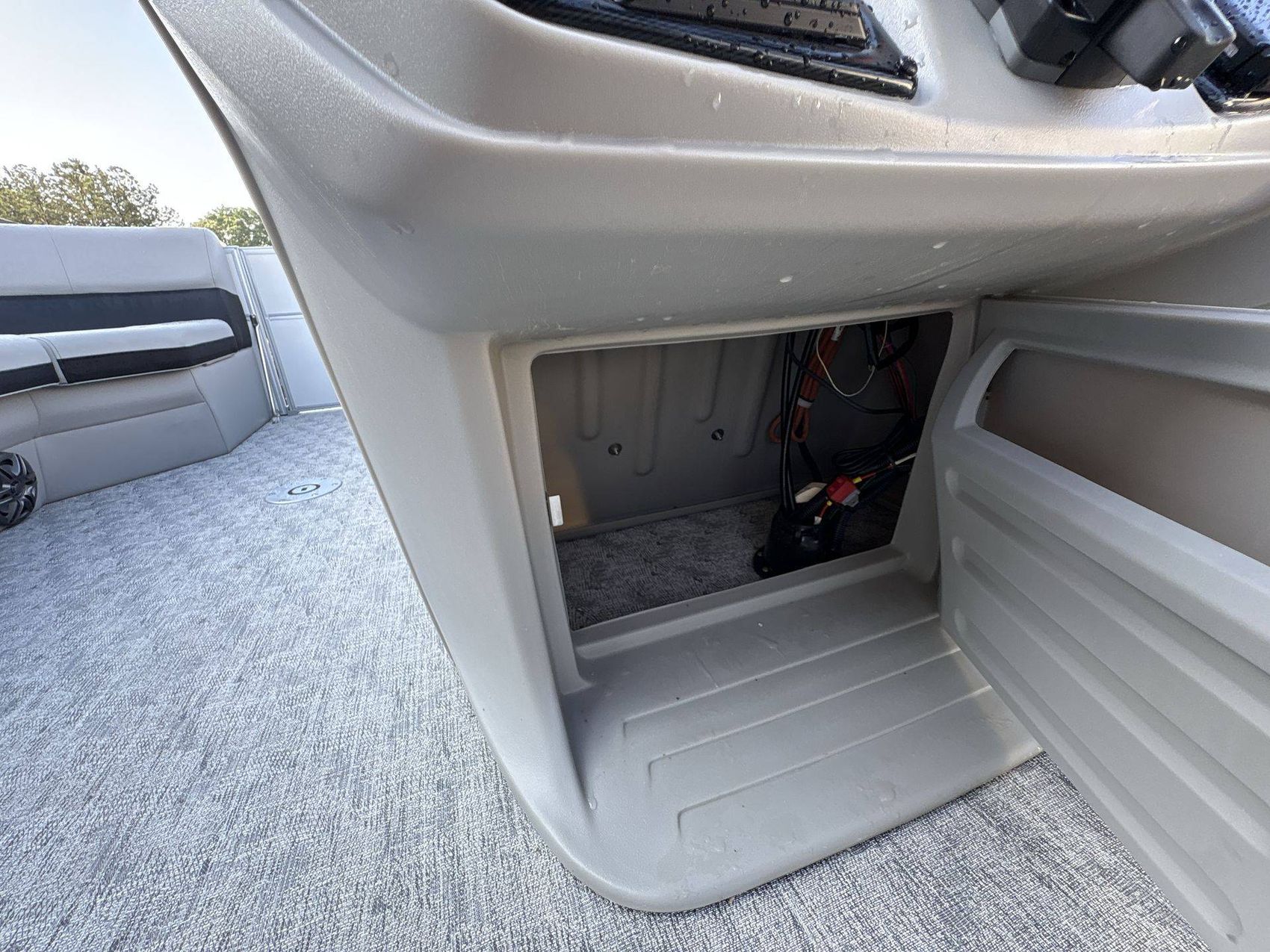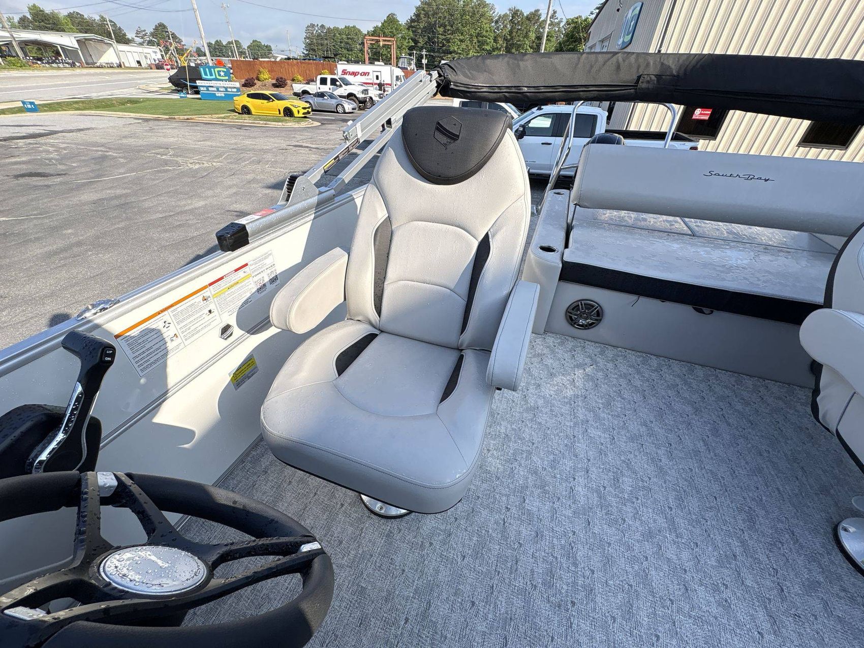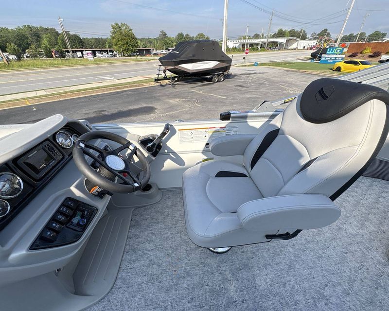Inside, you'll find comfortable furniture with a Capstone Base and Spectre Accent. The helm boasts a Premium Polymer Finish, ensuring durability and aesthetic appeal. It also comes with a Power Electric Bimini Top Standard for protection from different weather elements.